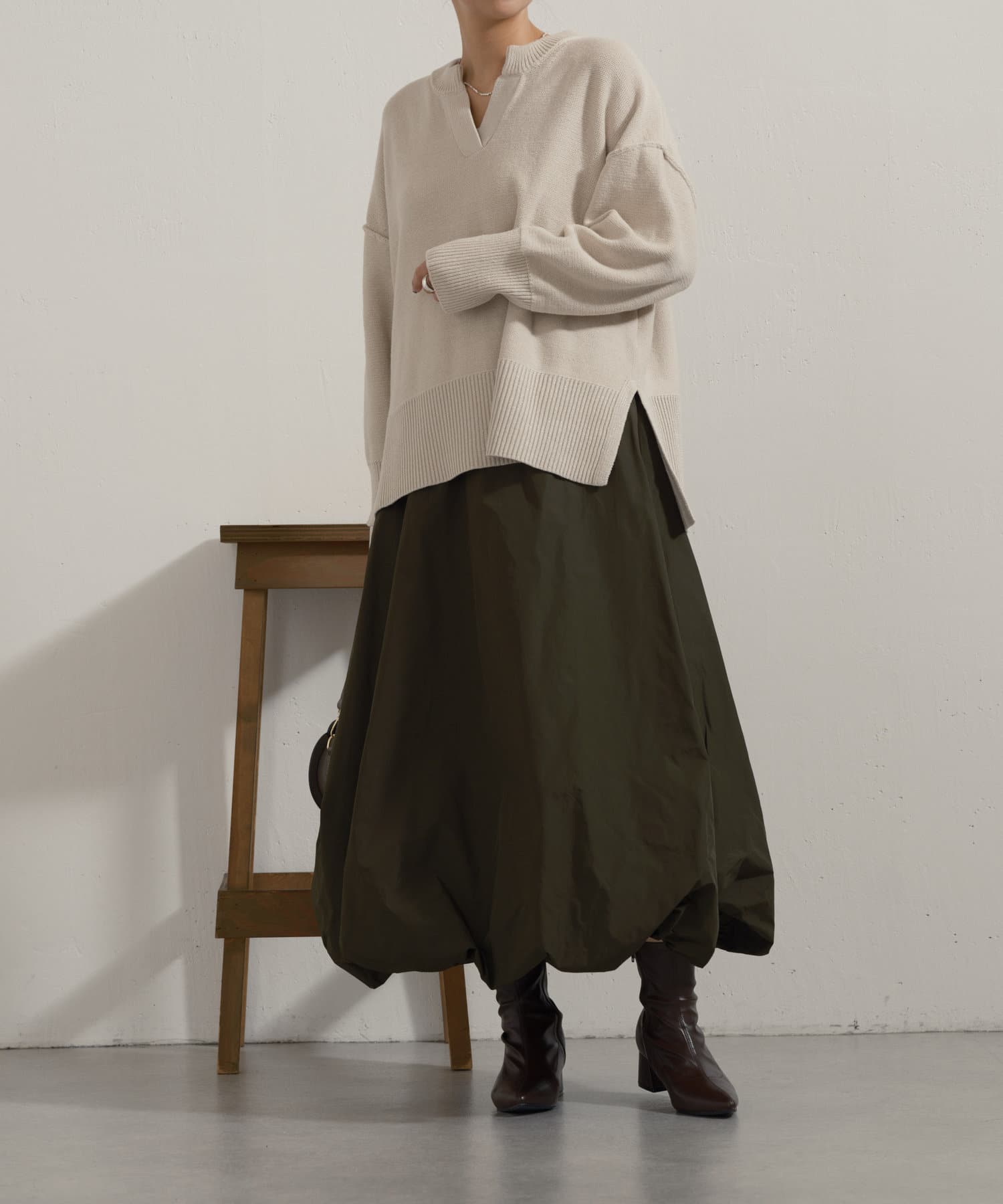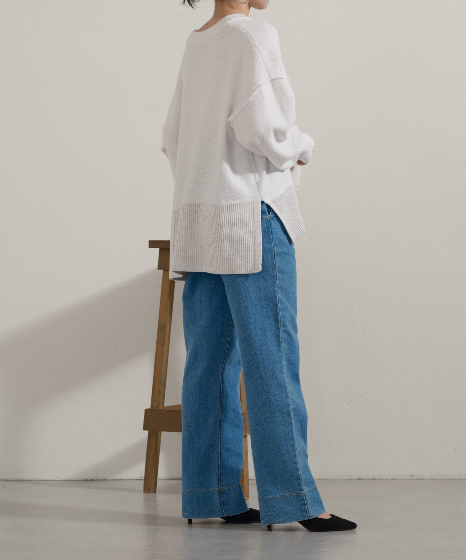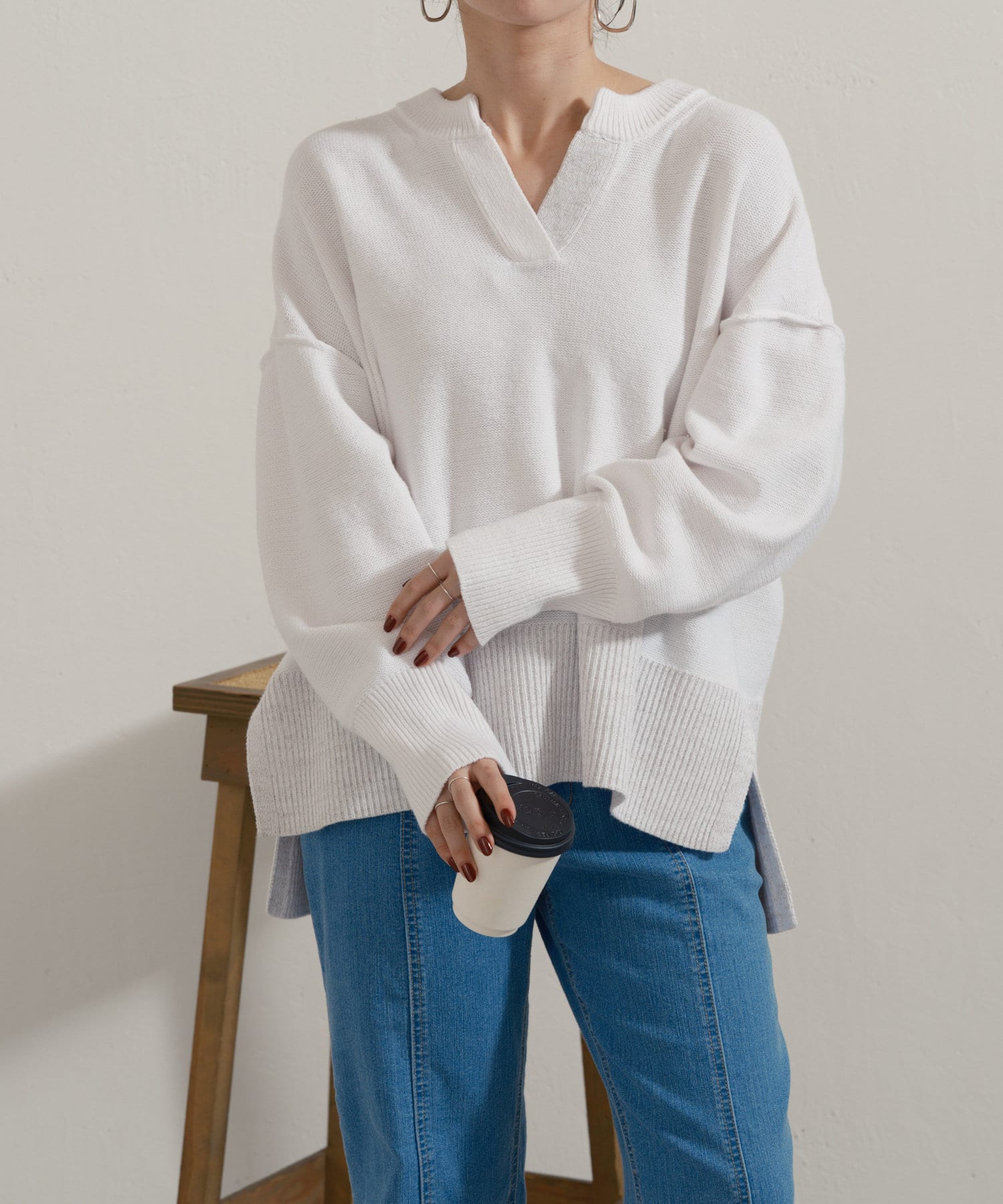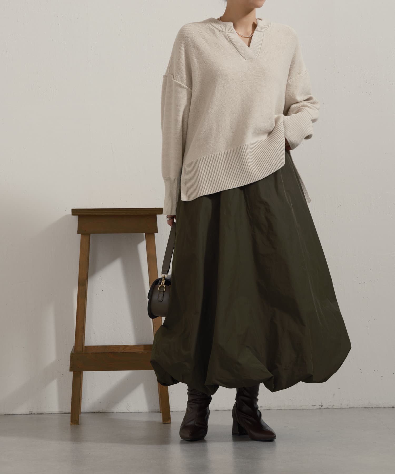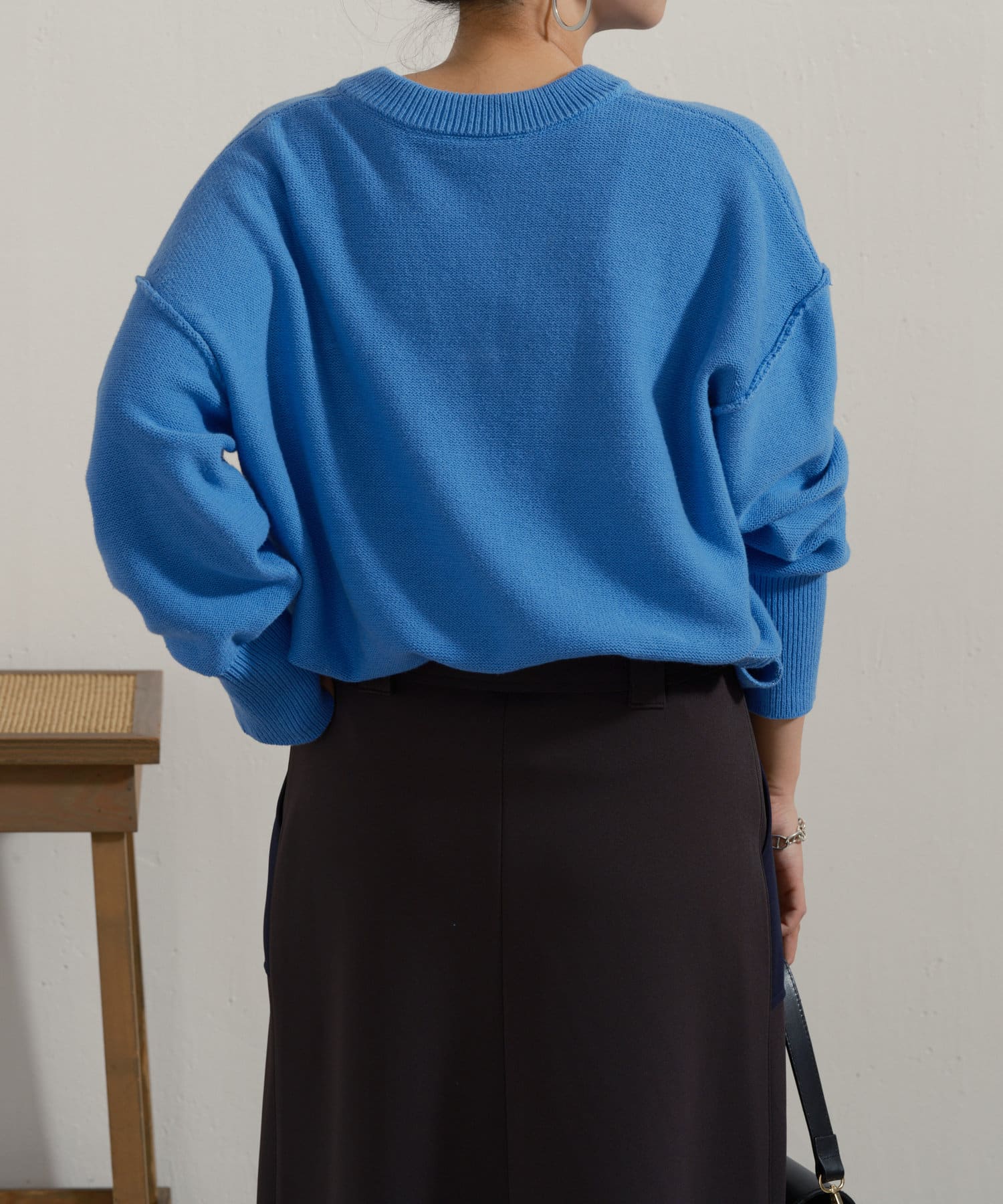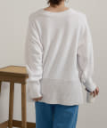 ・首元と裾に施されたさりげないラメがポイントのニット。