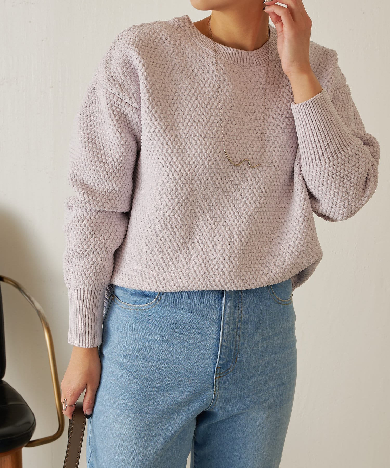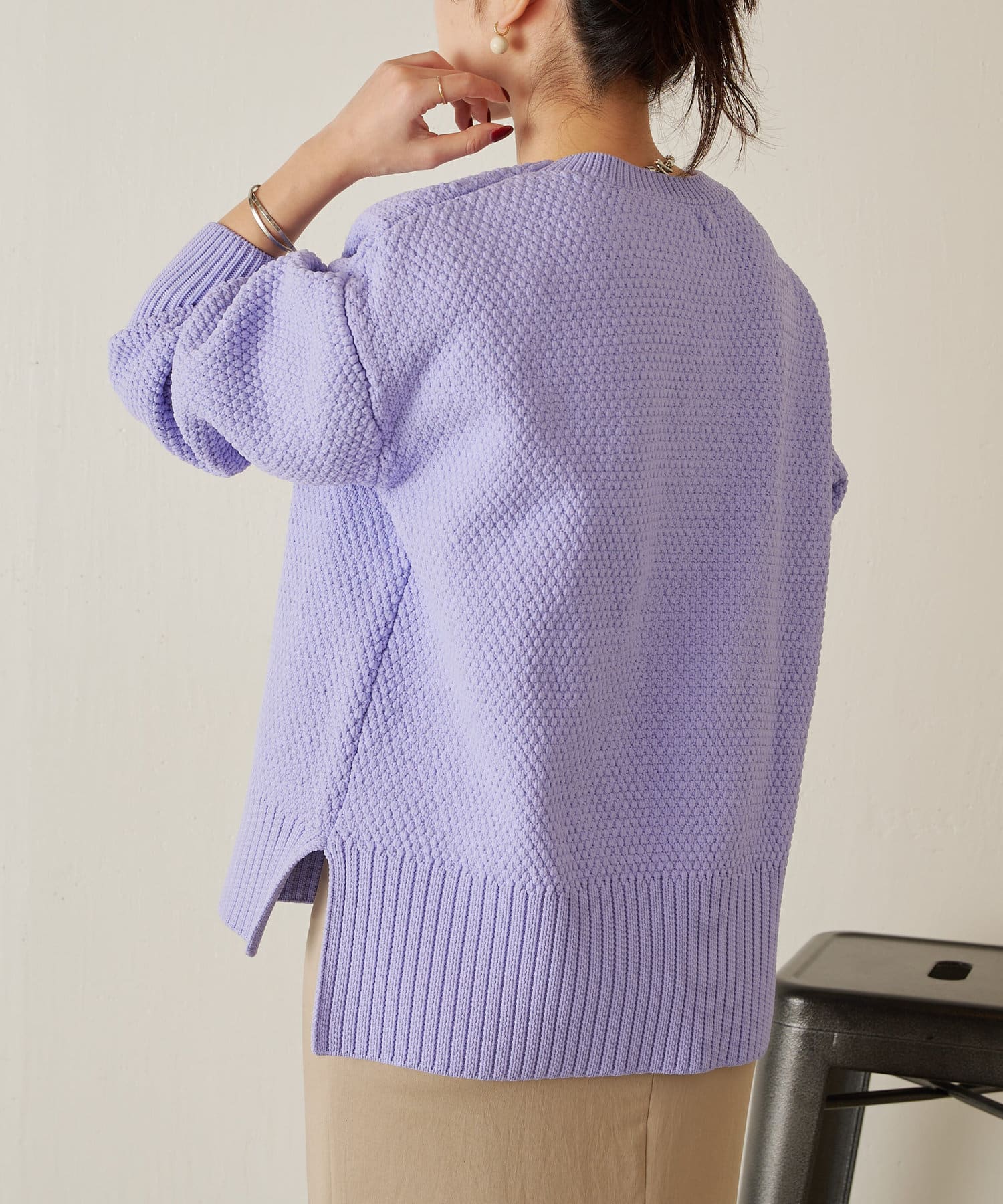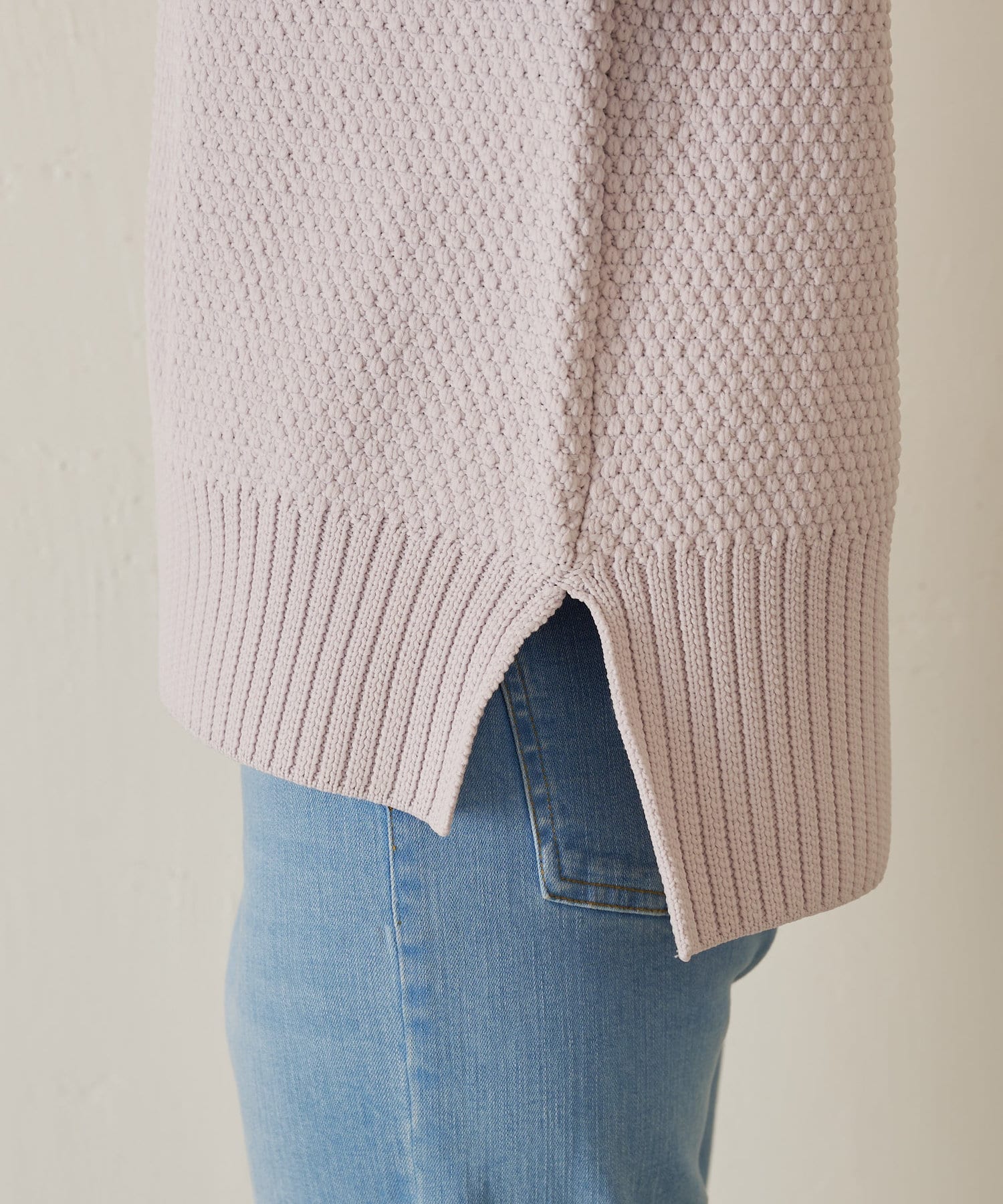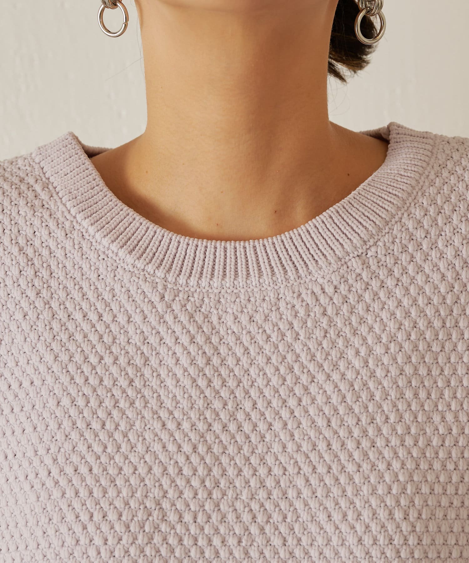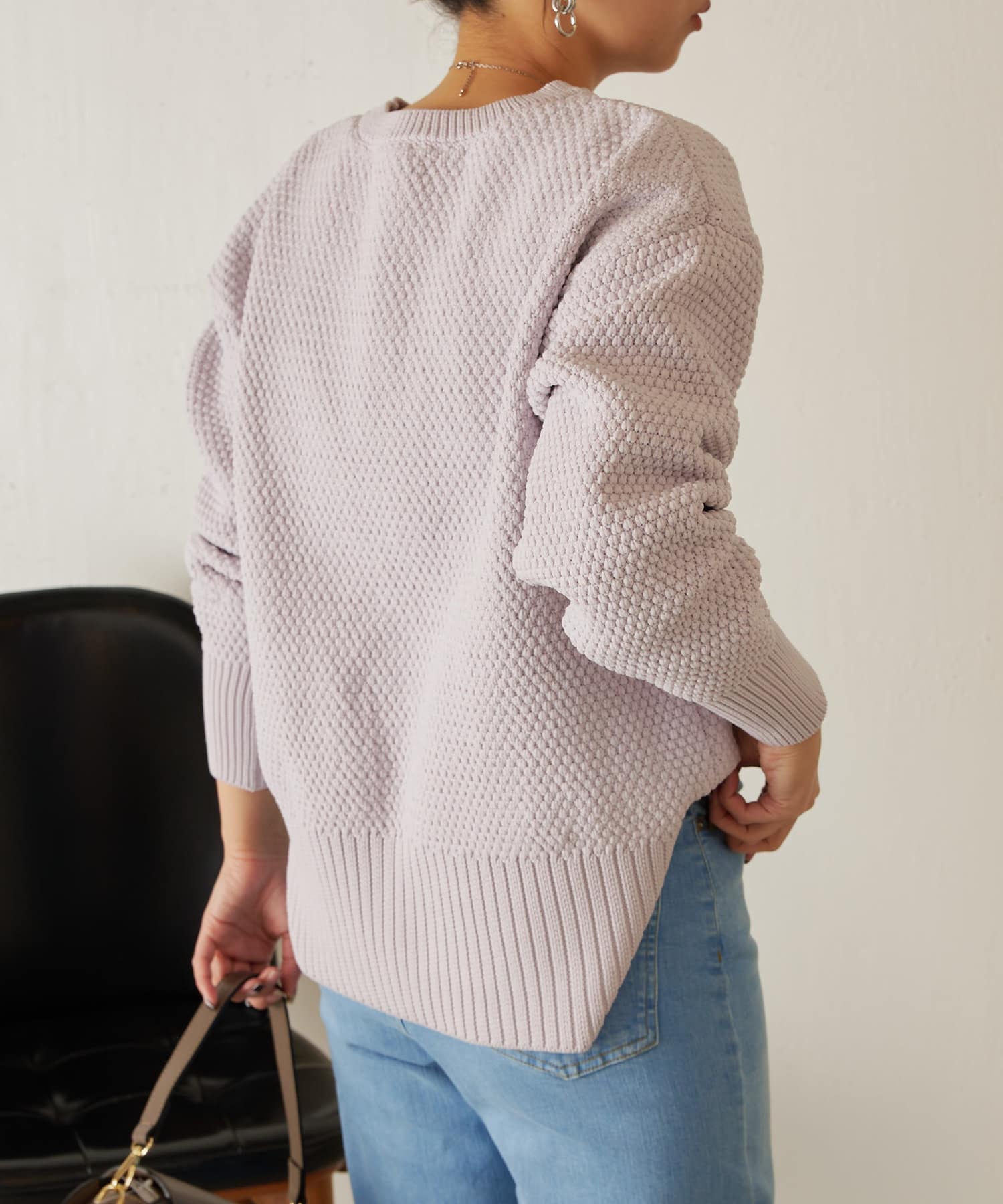 ・立体感のあるカノコ編みと袖裾のリブ編みの切替がポイントに。