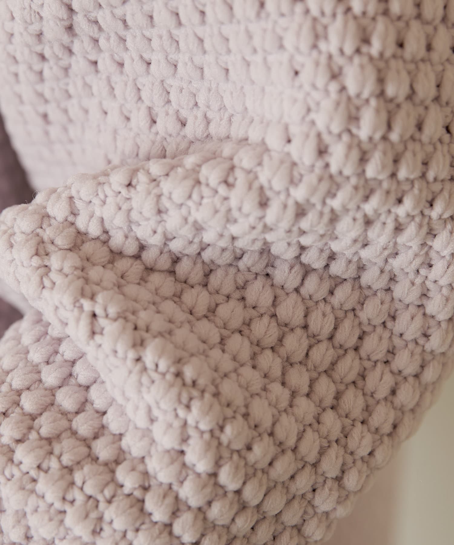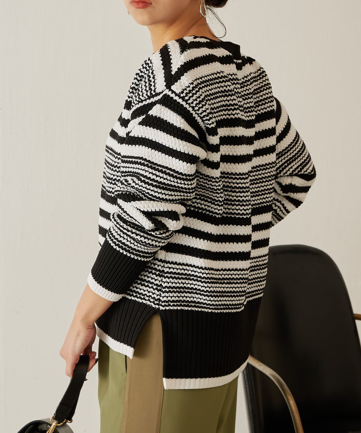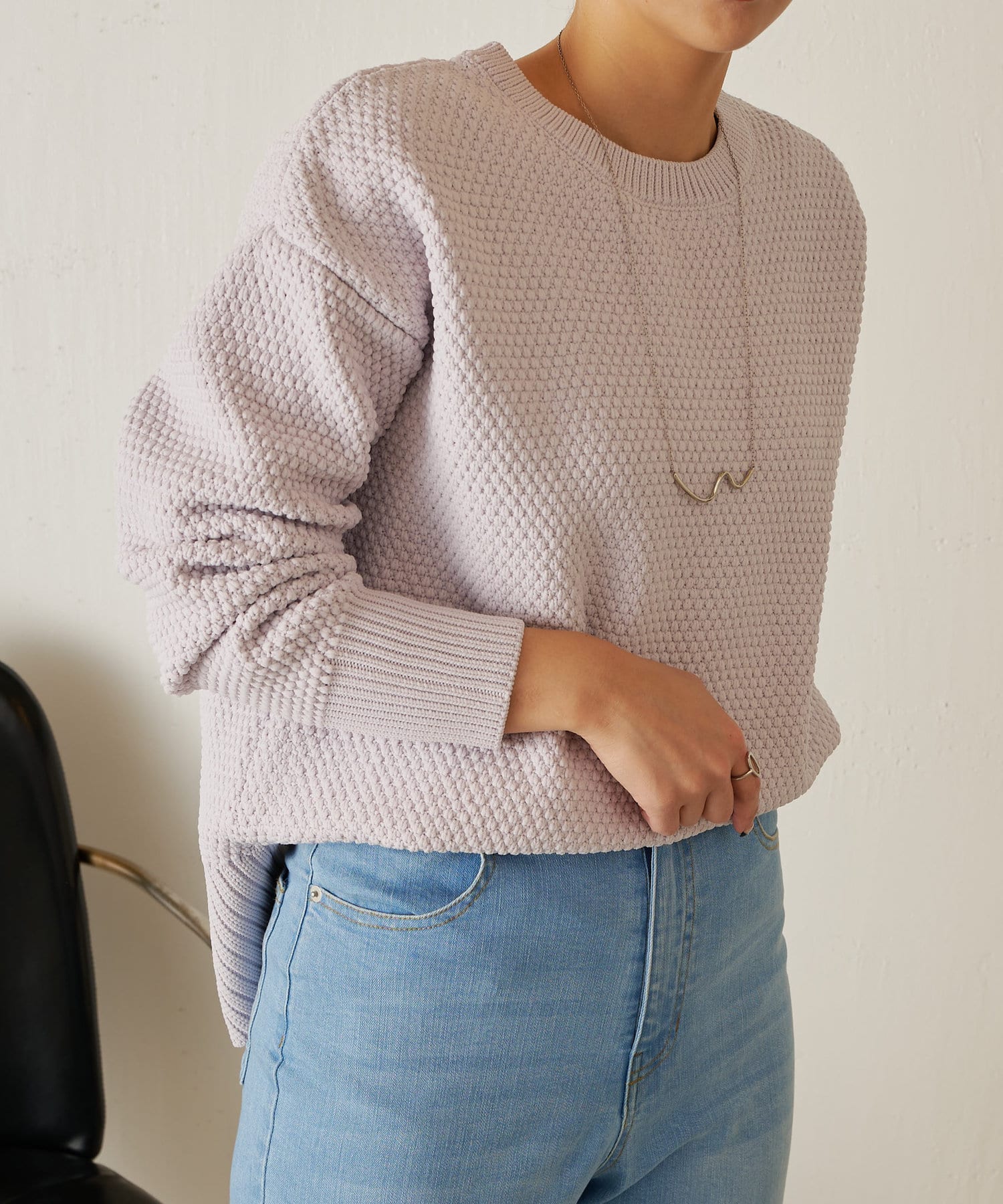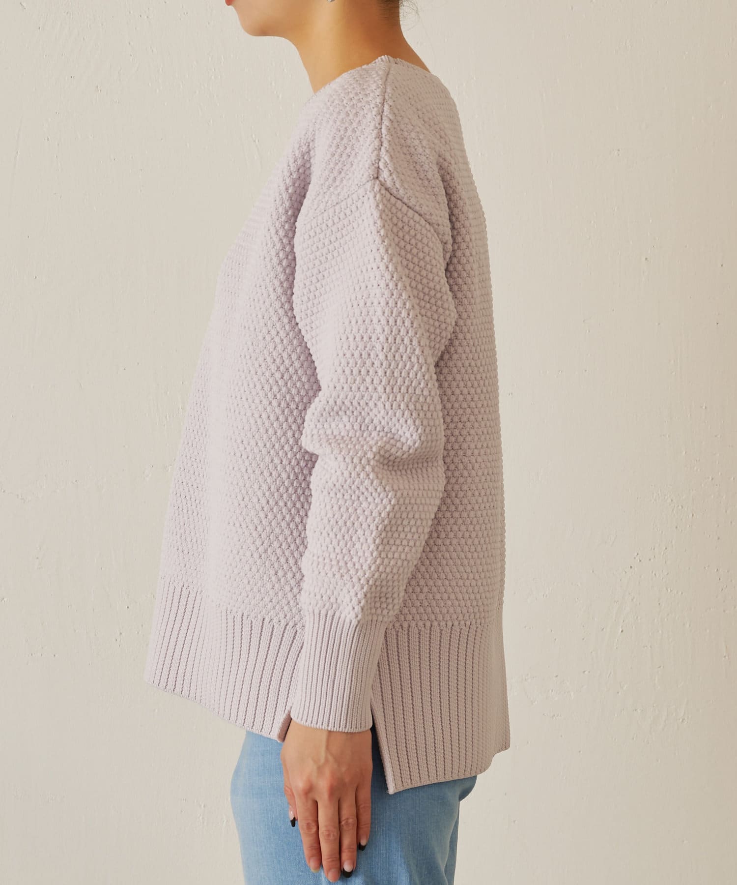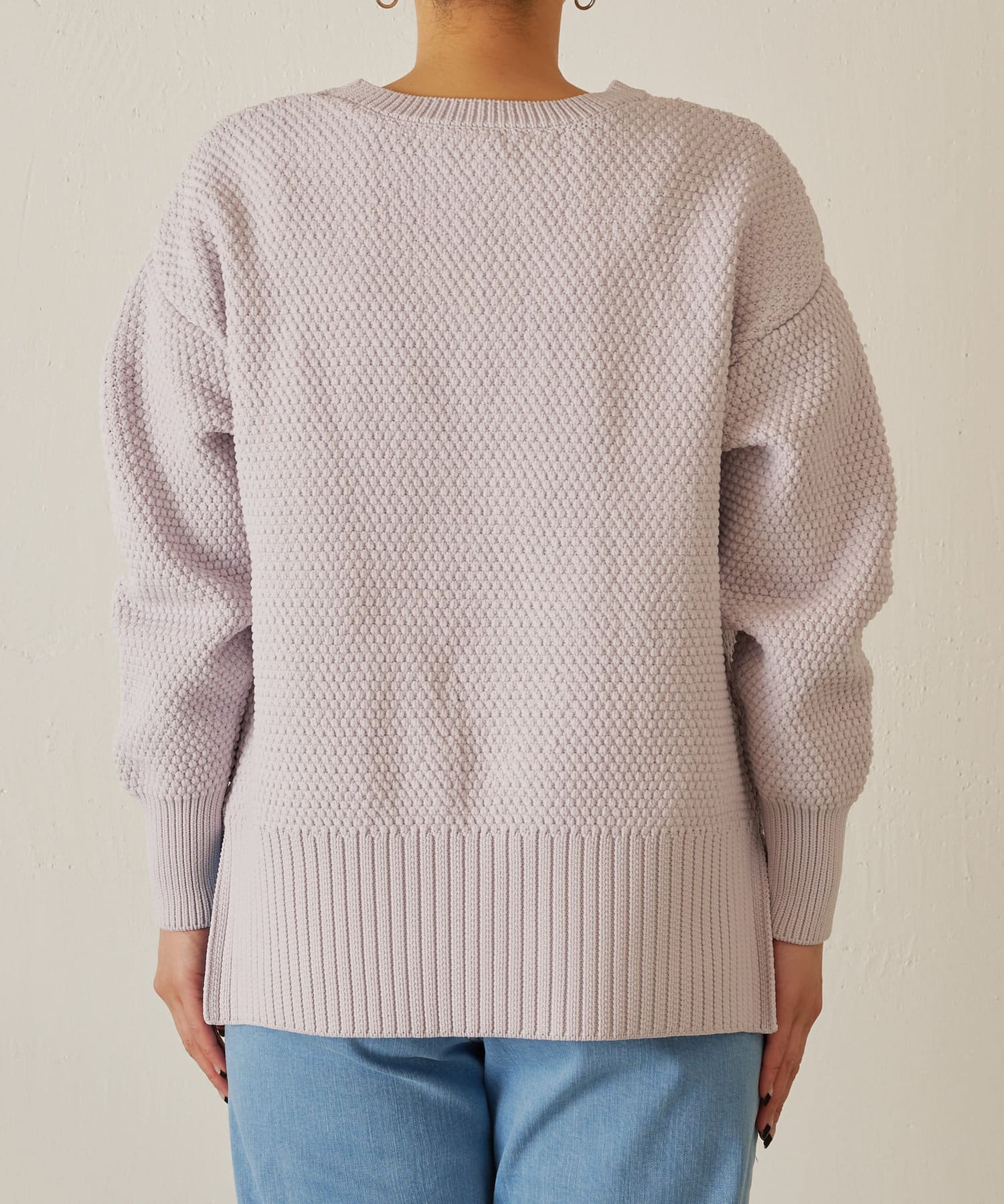 ・立体感のあるカノコ編みと袖裾のリブ編みの切替がポイントに。