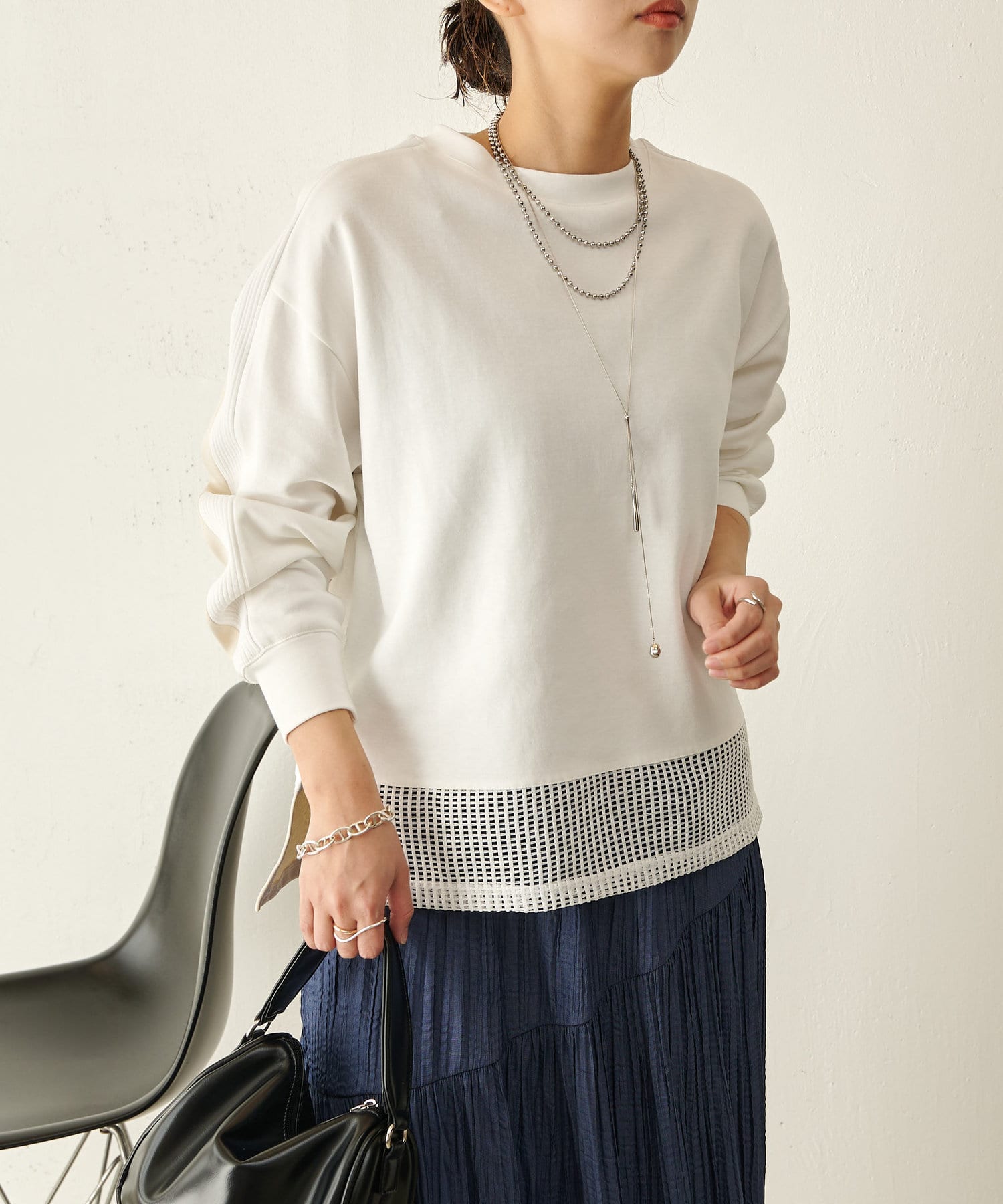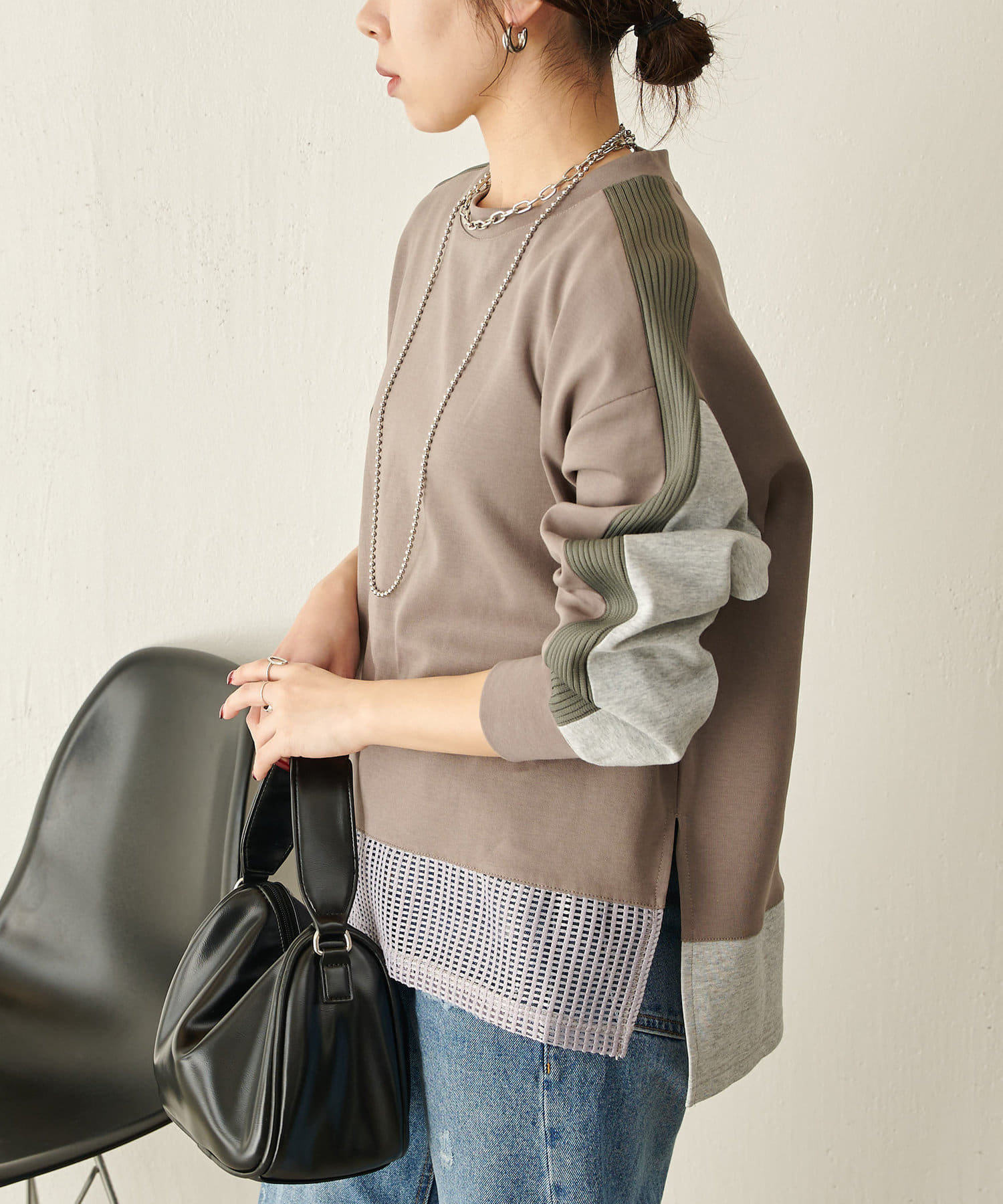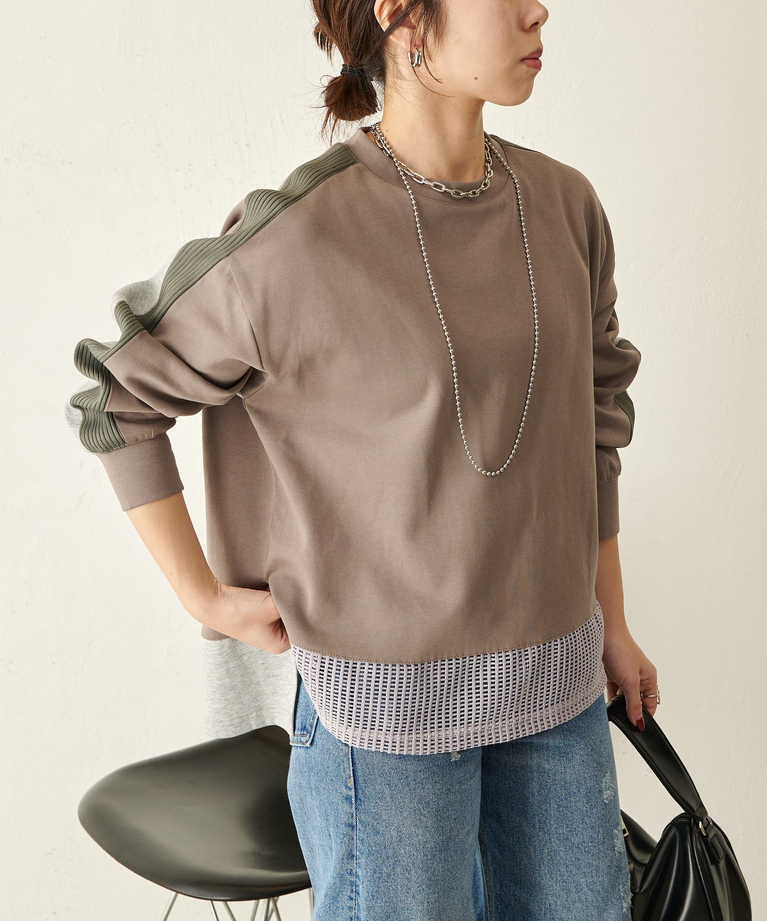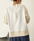 ・異素材デザインで、1枚で決まるドッキングカットソー。
