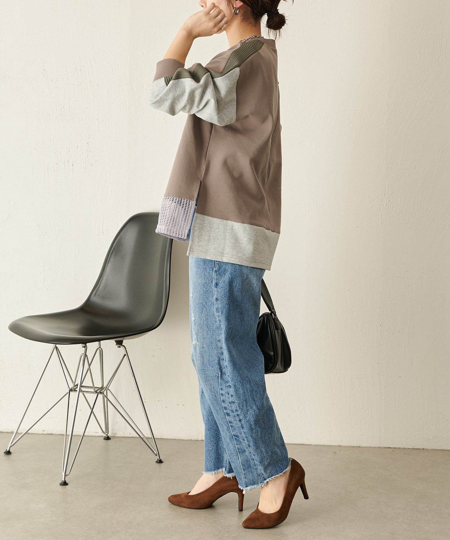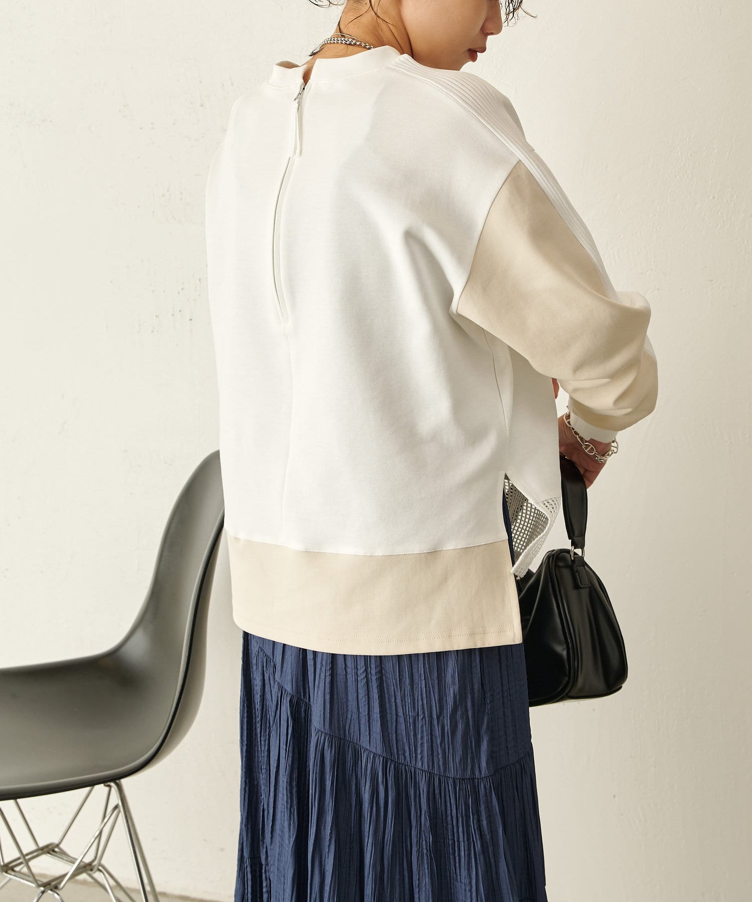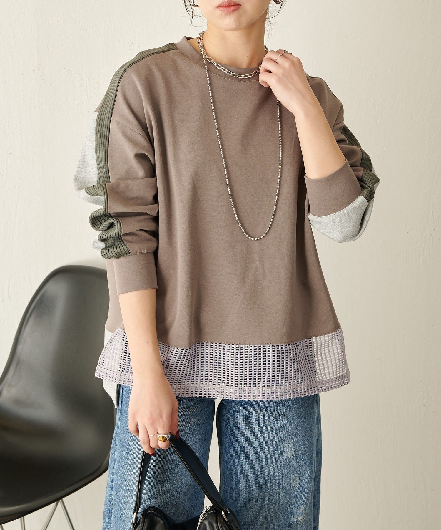 ・異素材デザインで、1枚で決まるドッキングカットソー。