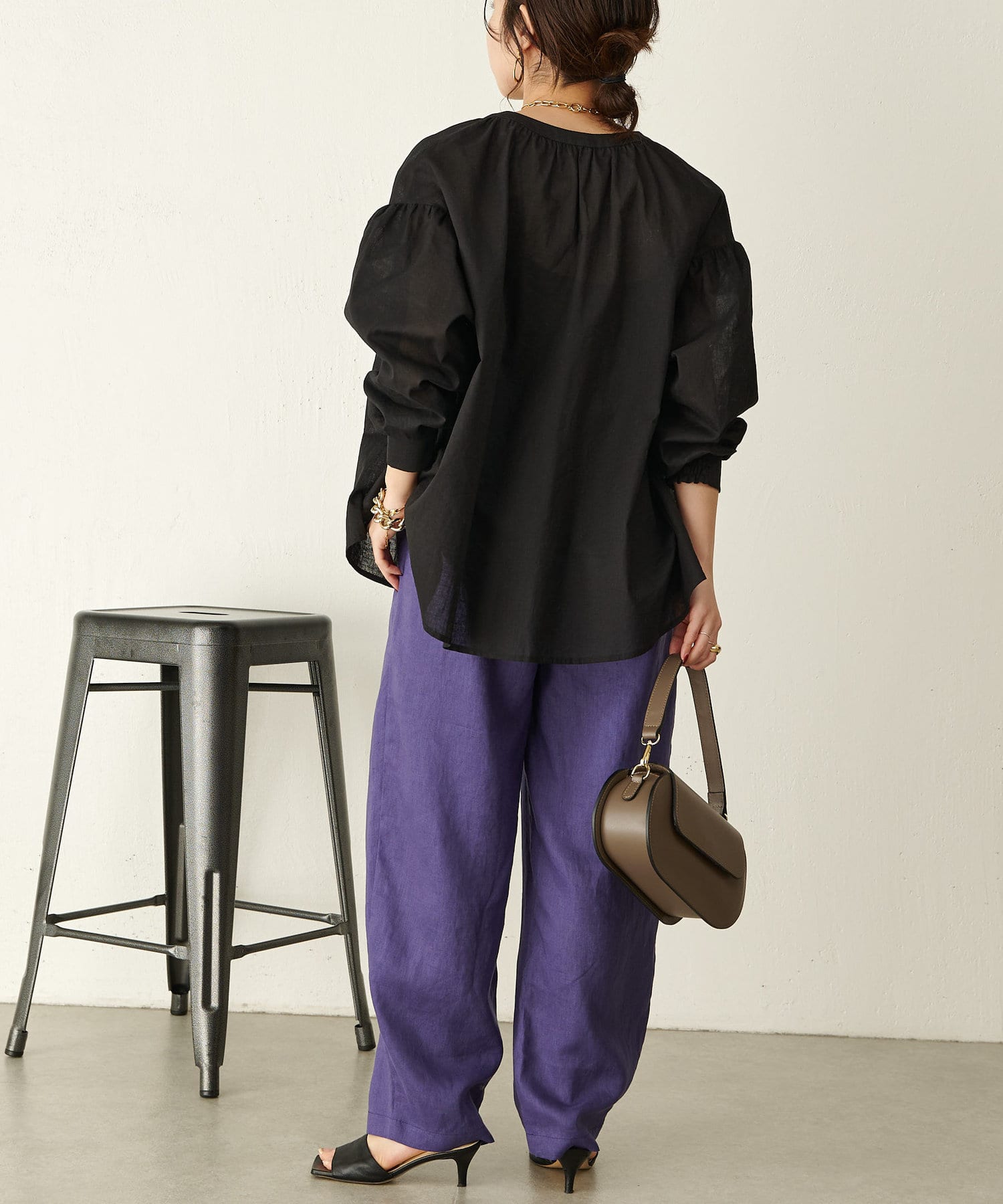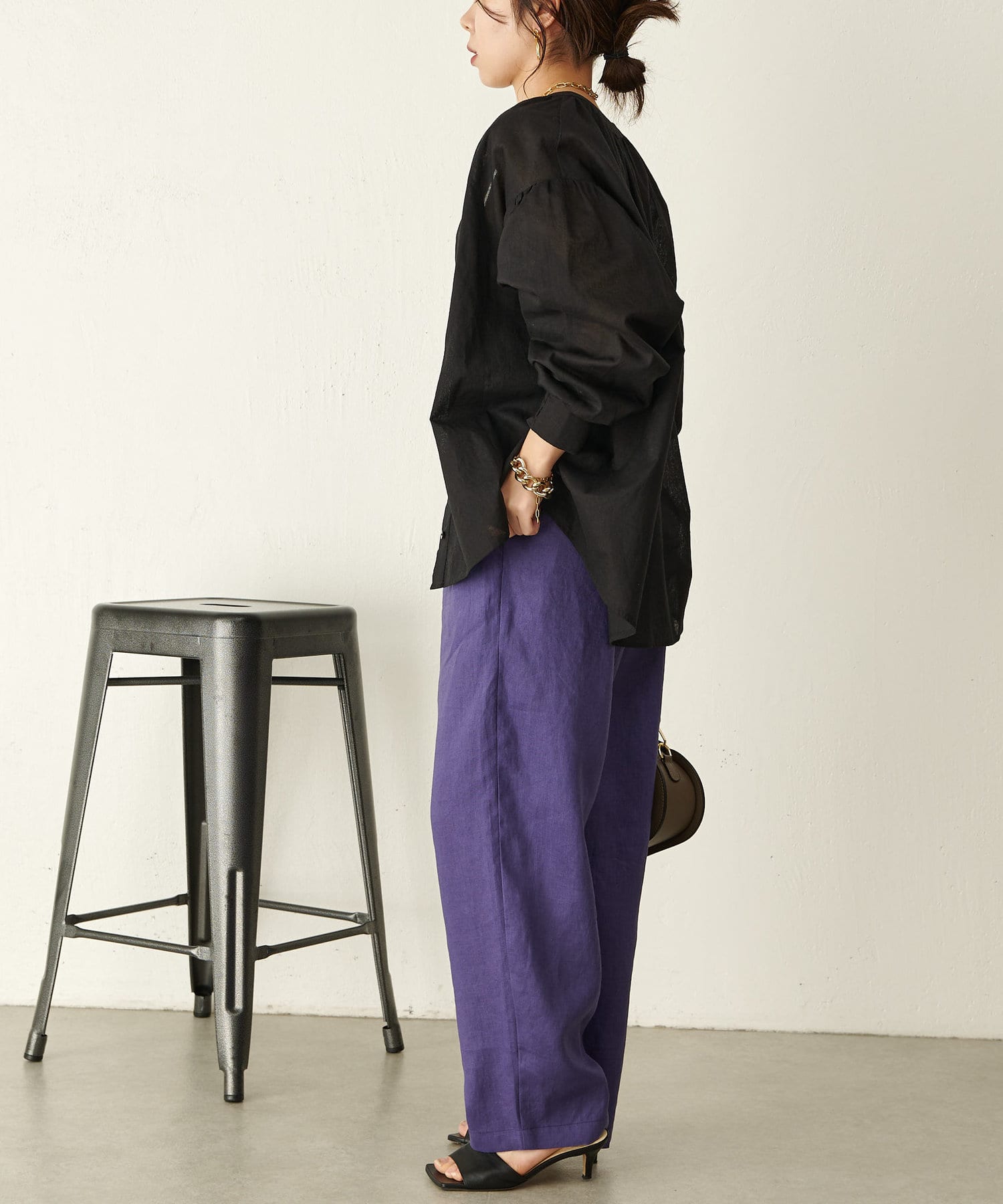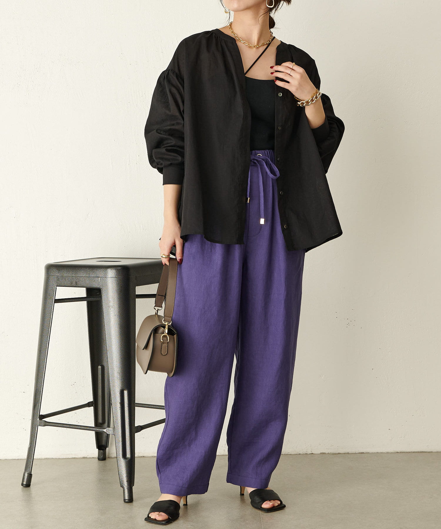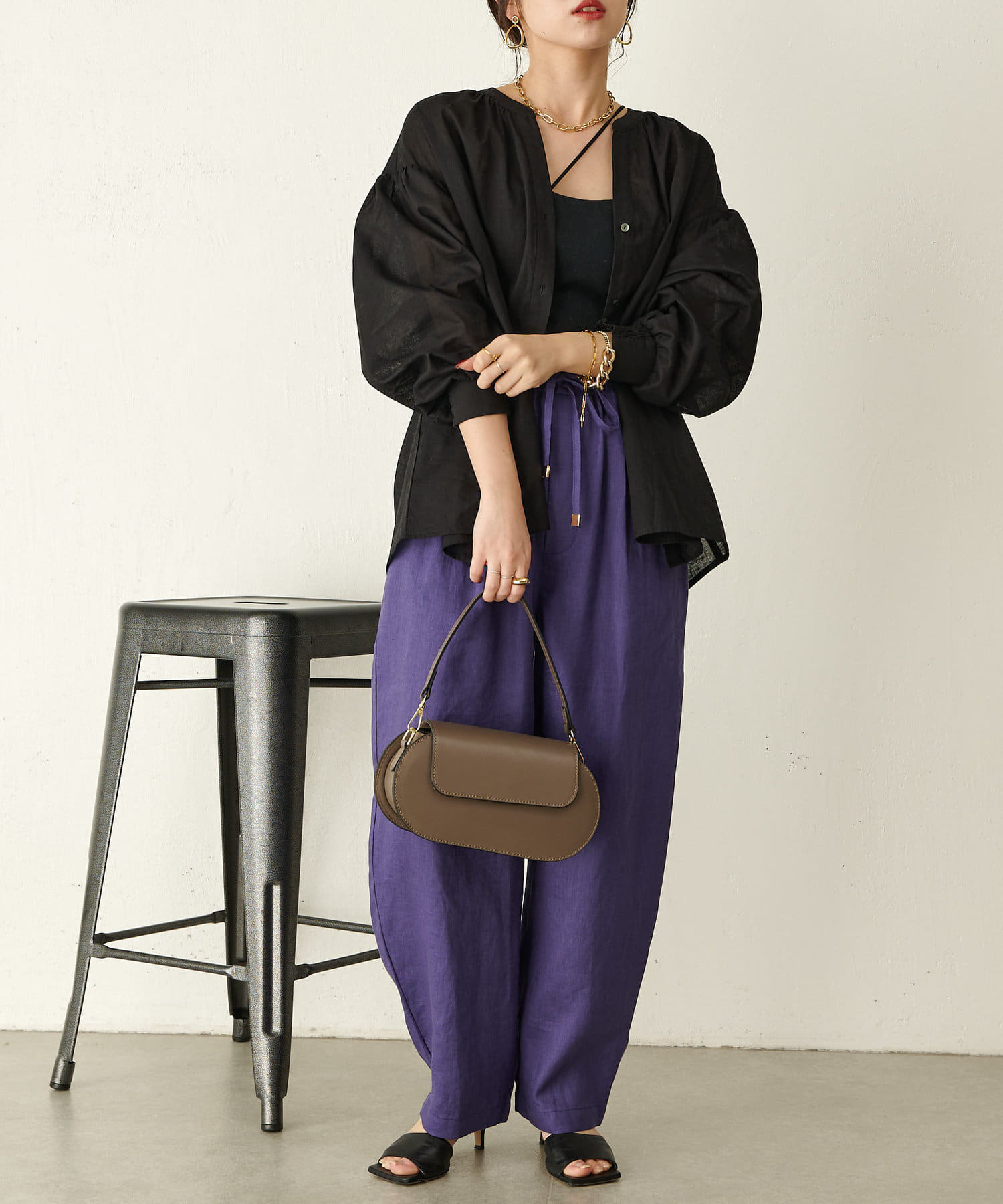 ・適度にハリのあるリネン素材なのでナチュラルになりすぎず、シックに着こなせます。