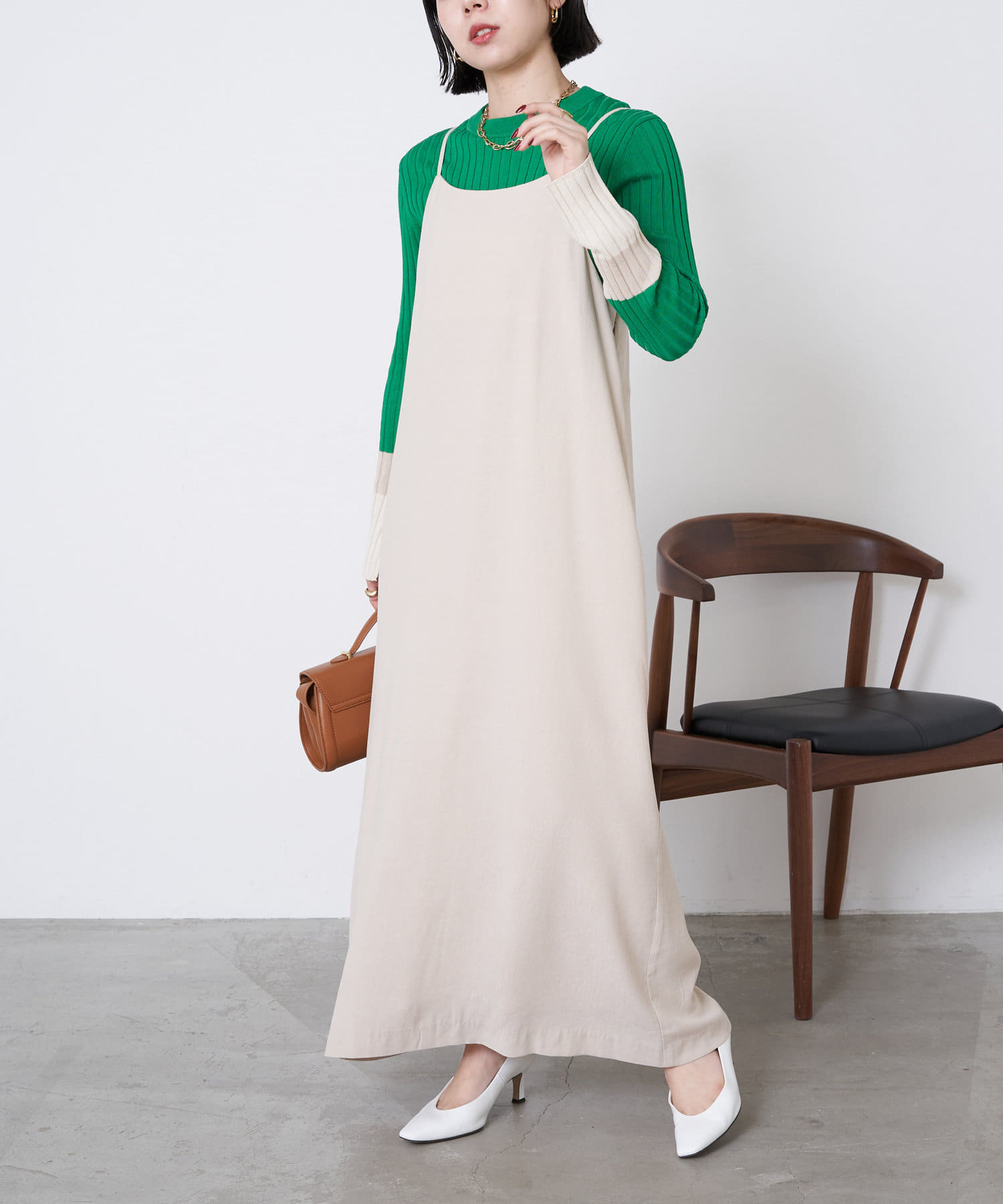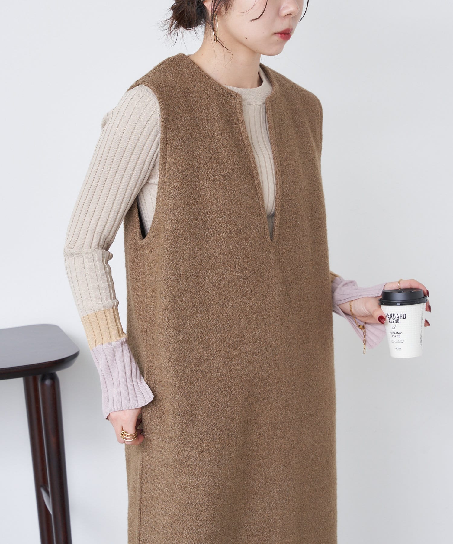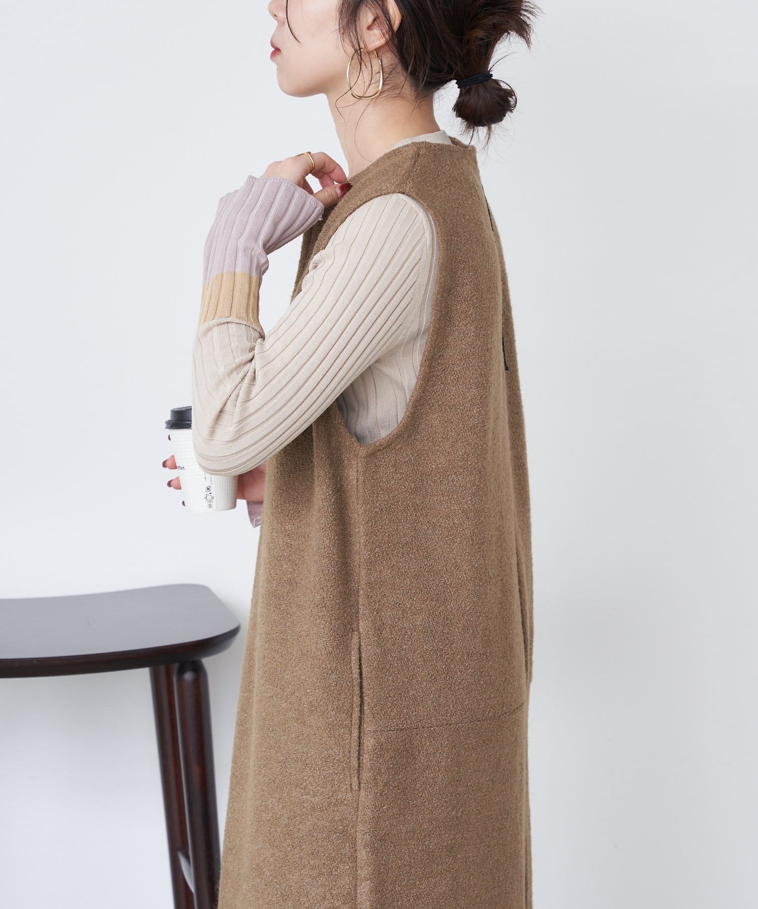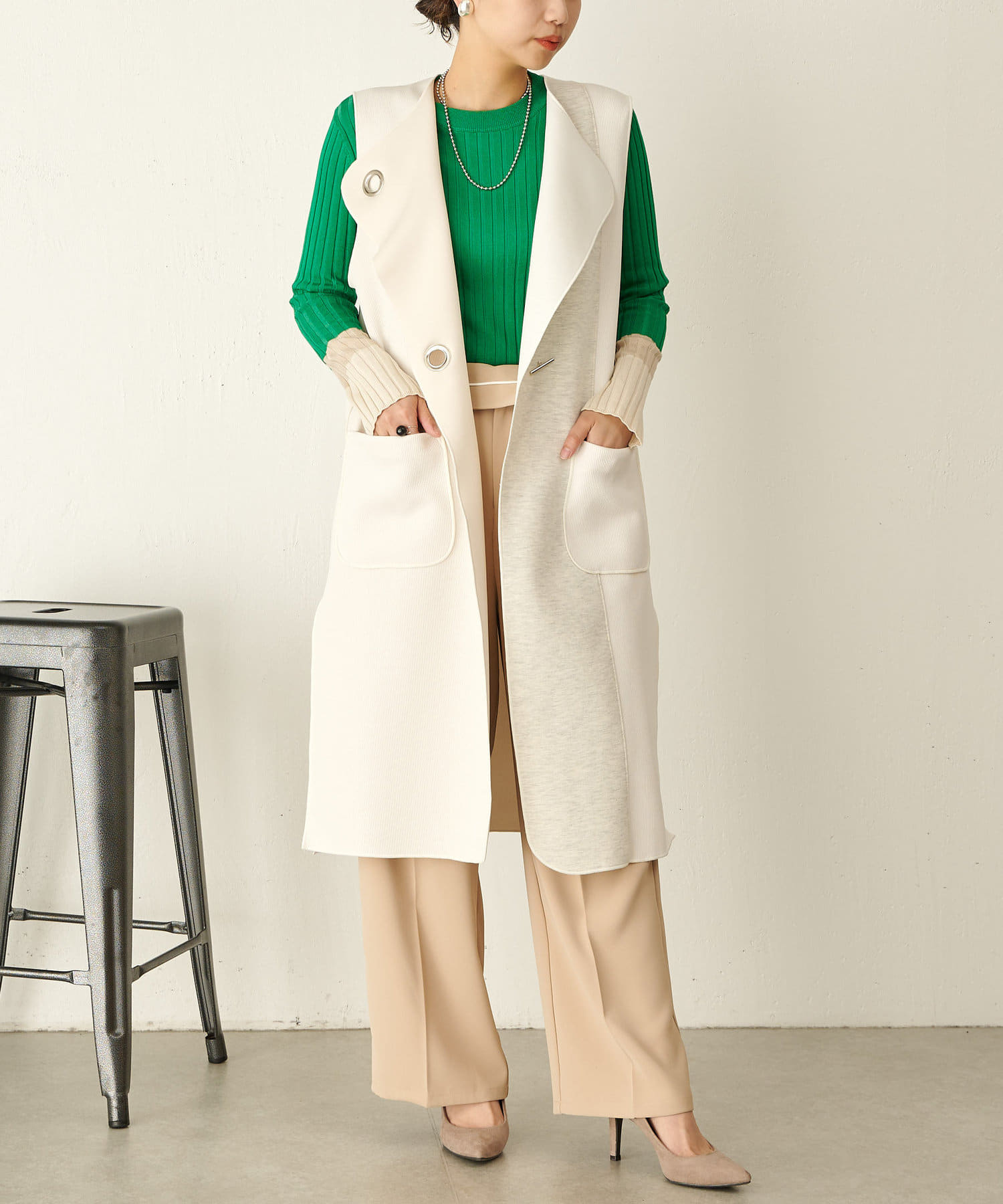 あまりこんな明るい色を買わないので、勇気がいりましたが、ジレやジャンパースカートに合わせると、とても上品にまとまります。