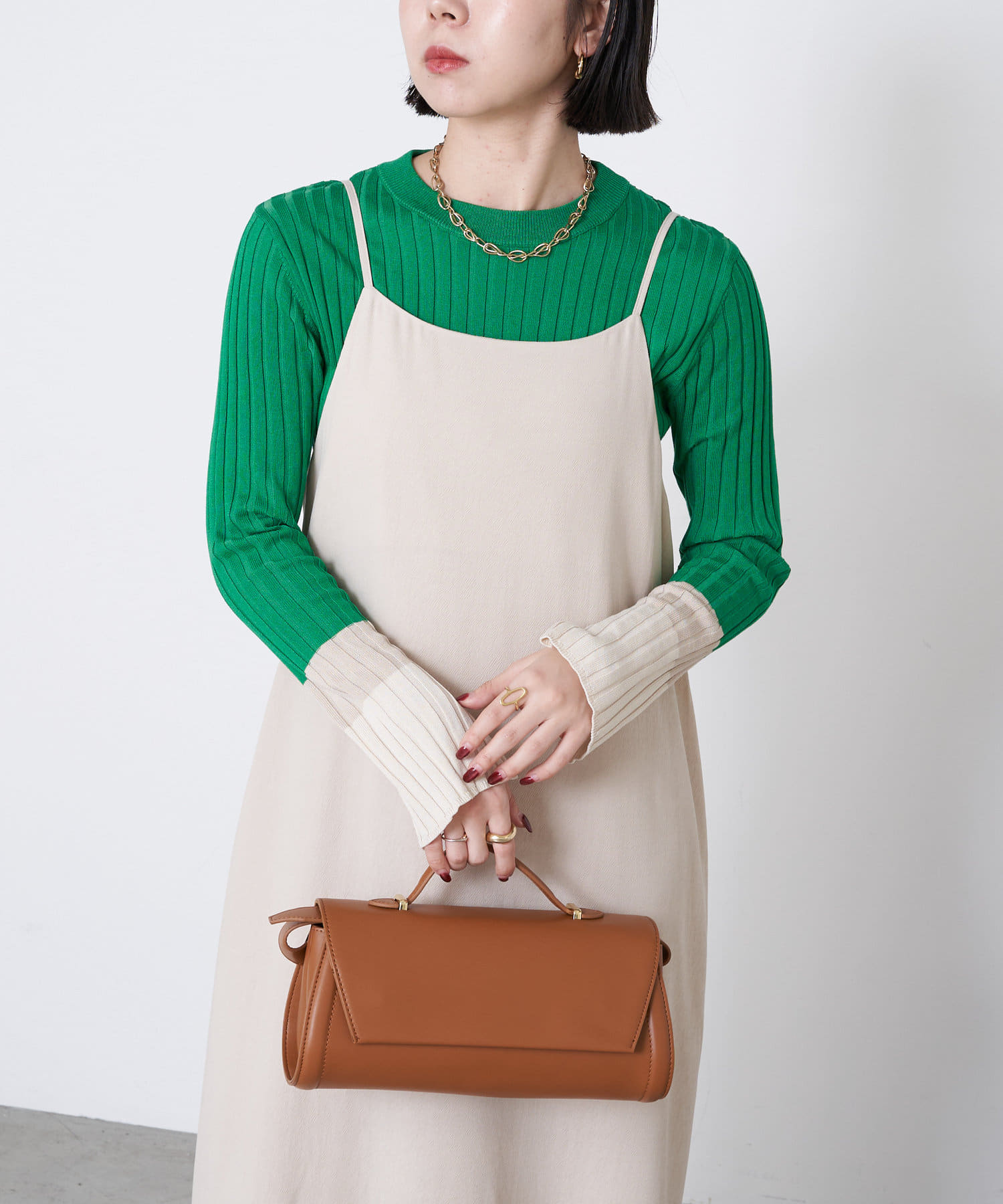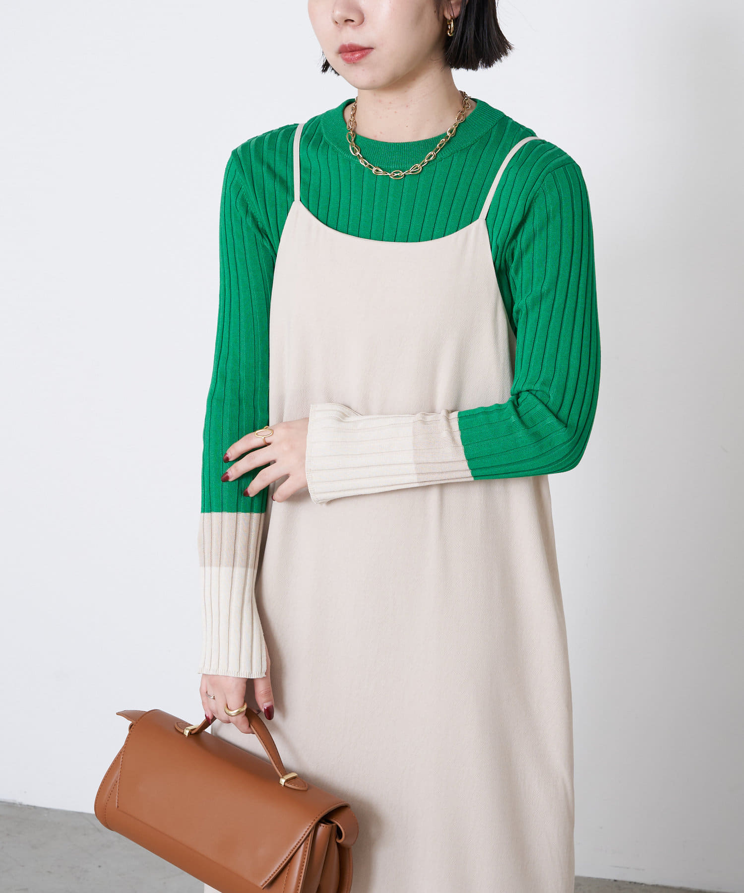 鮮やかなグリーンに袖口のクリーム色。