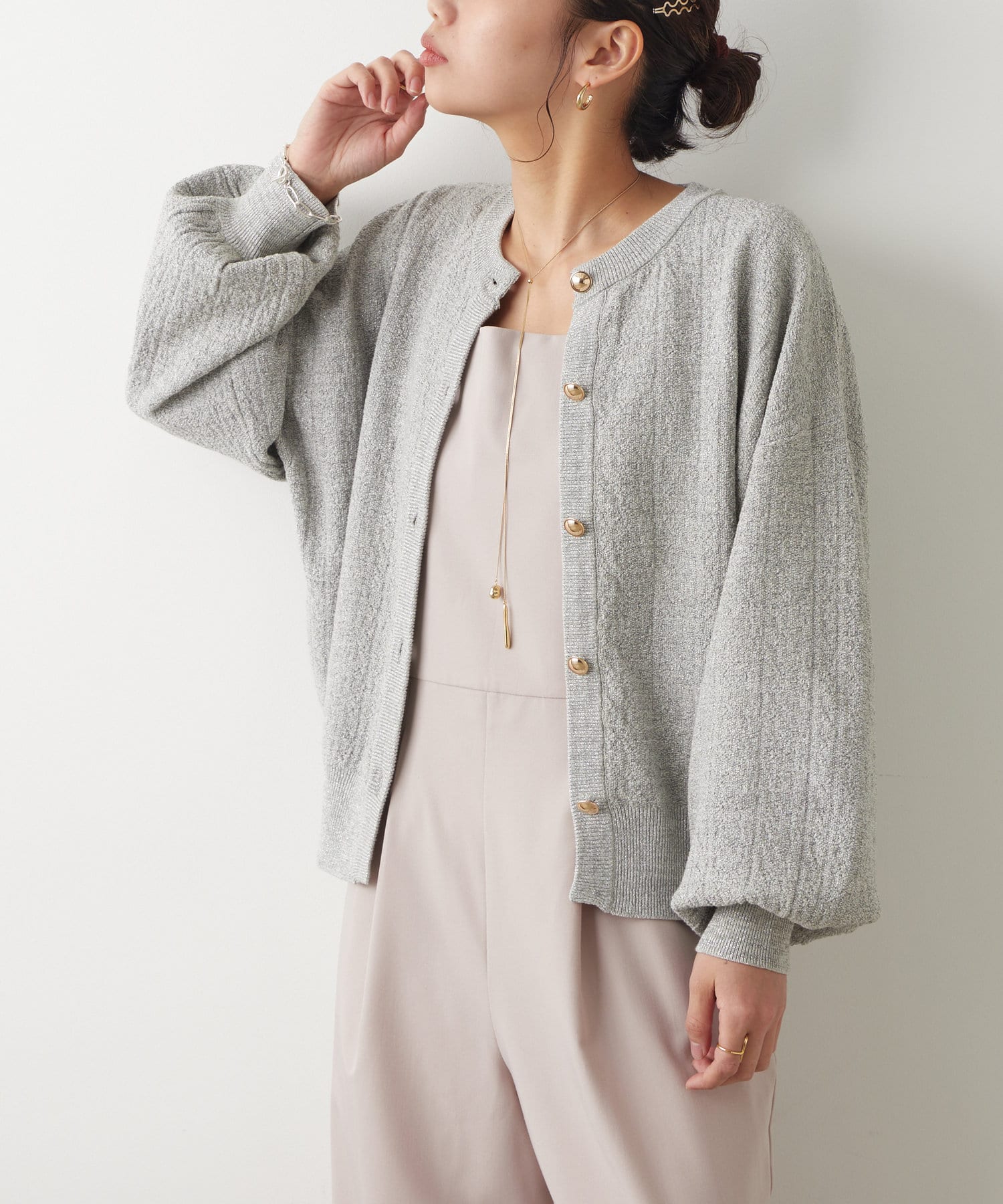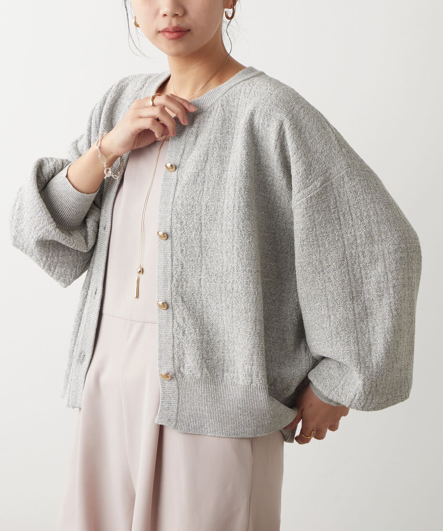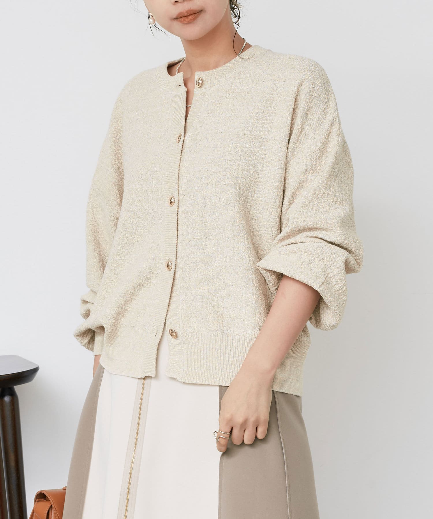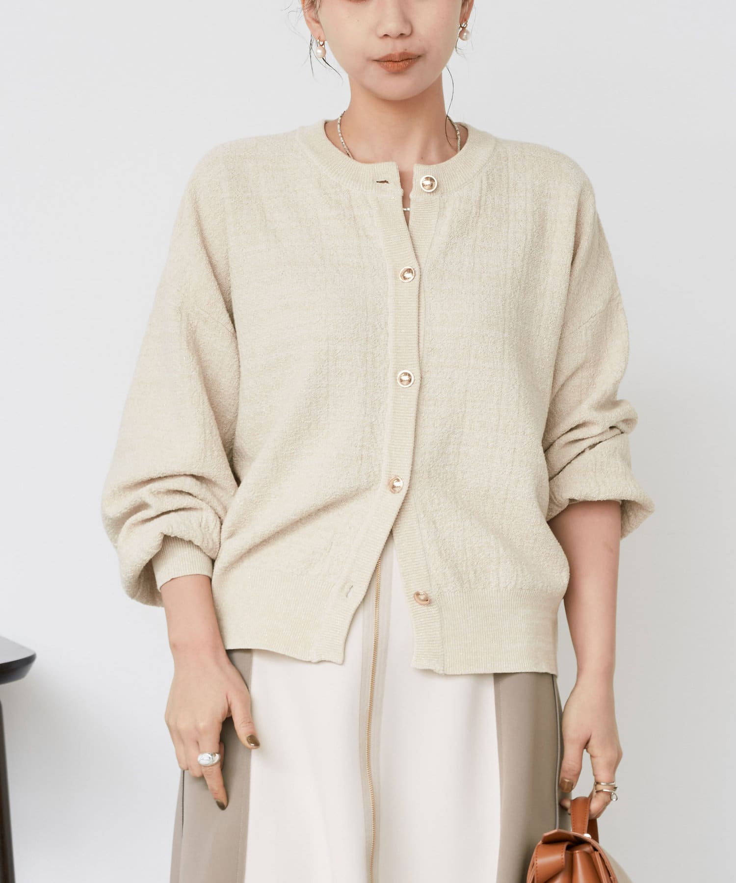 ・形はベーシックな丸首カーディガンになっているので、普段のスタイリングに取り入れやすいシルエットです。