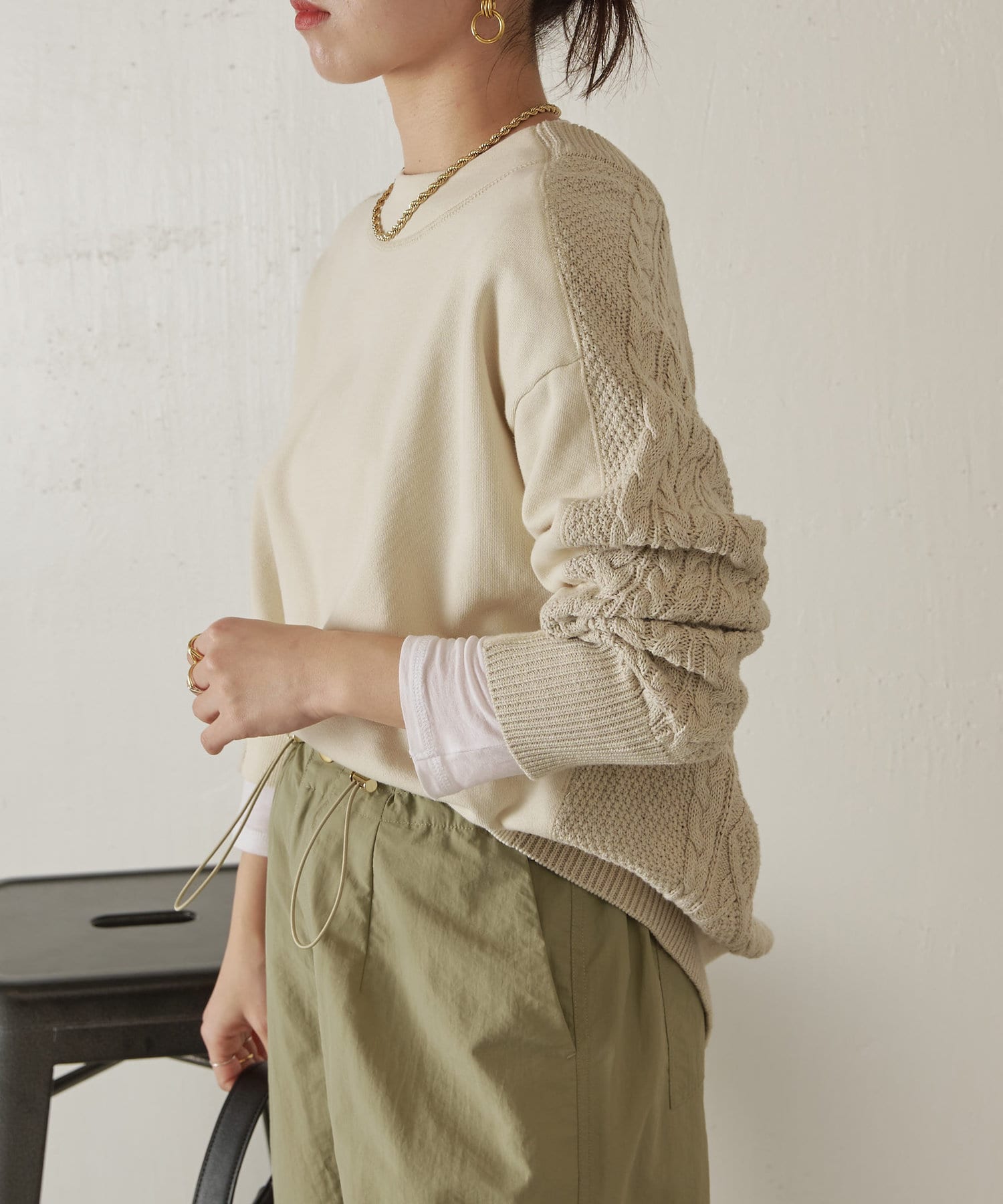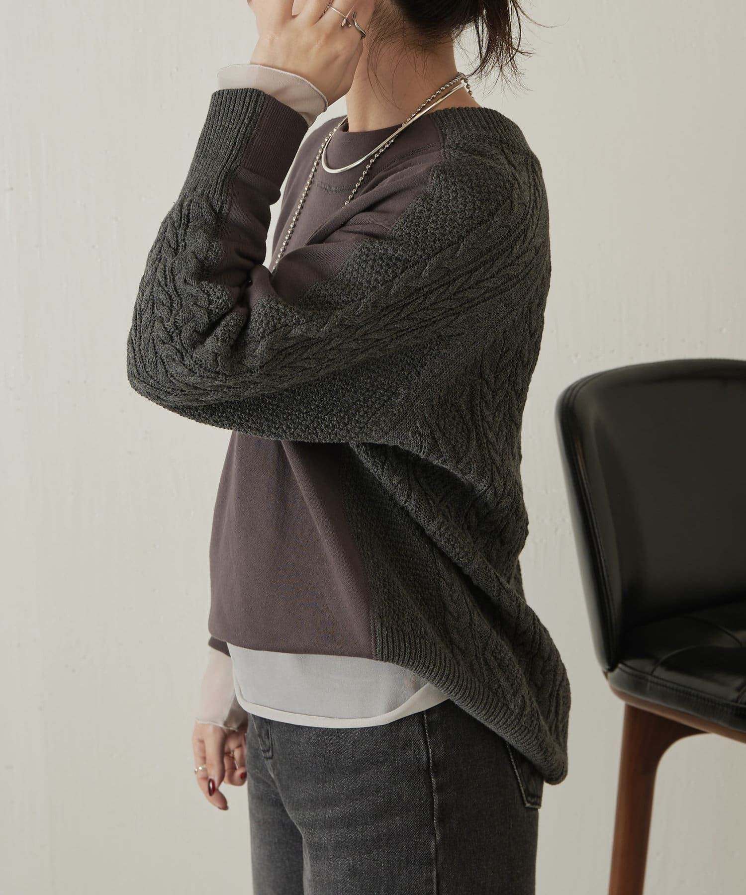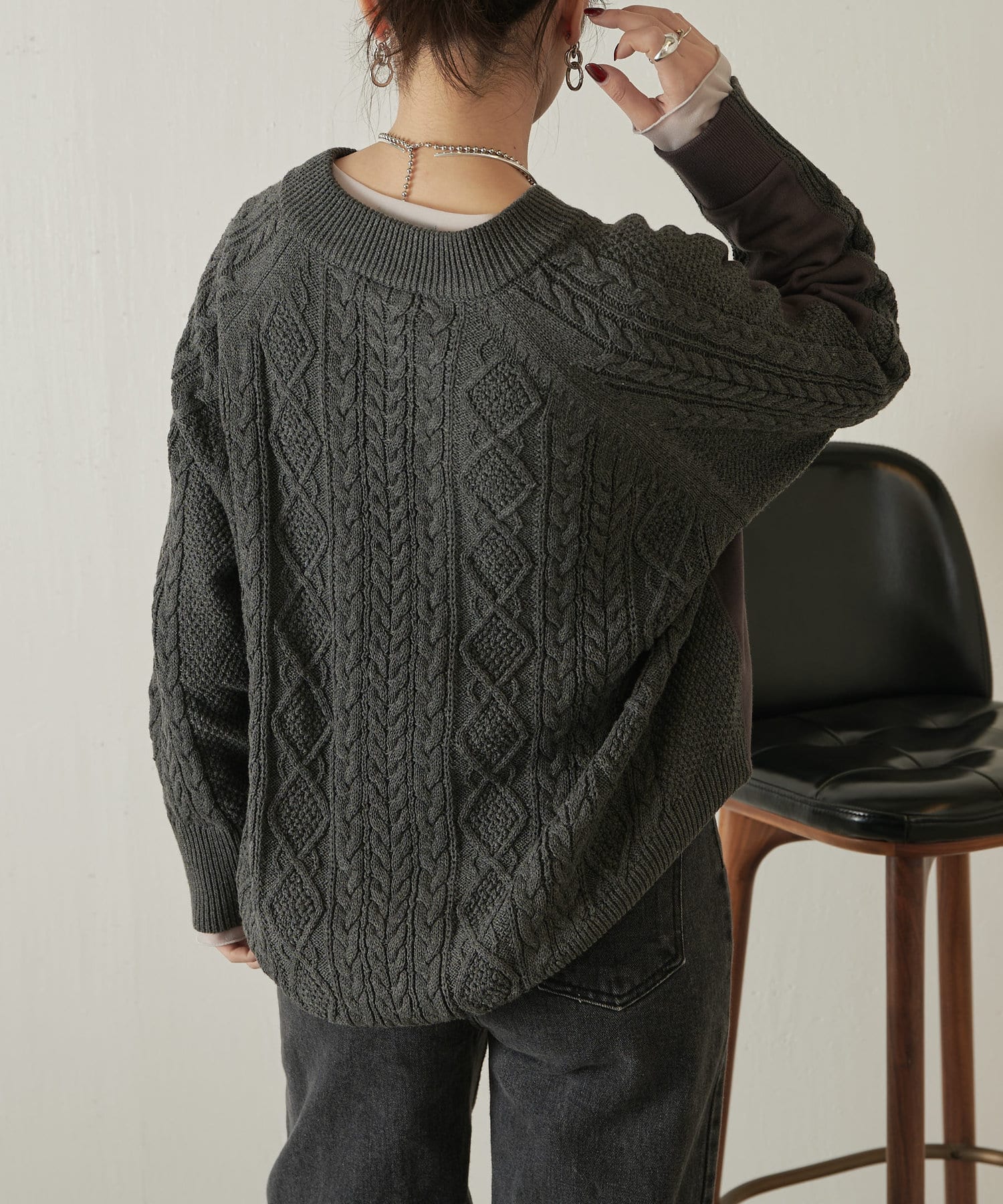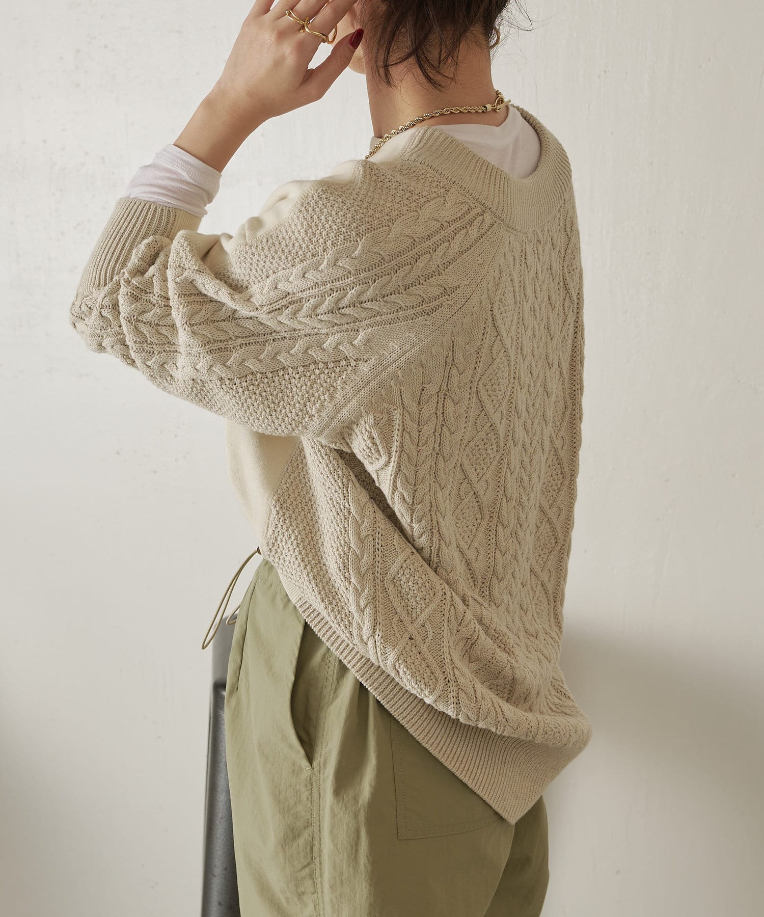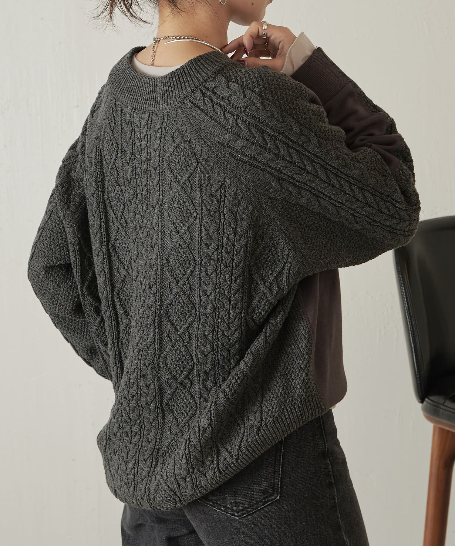 ・ケーブルニットとドッキングされた前後の大胆な切替が、他にはない一枚。