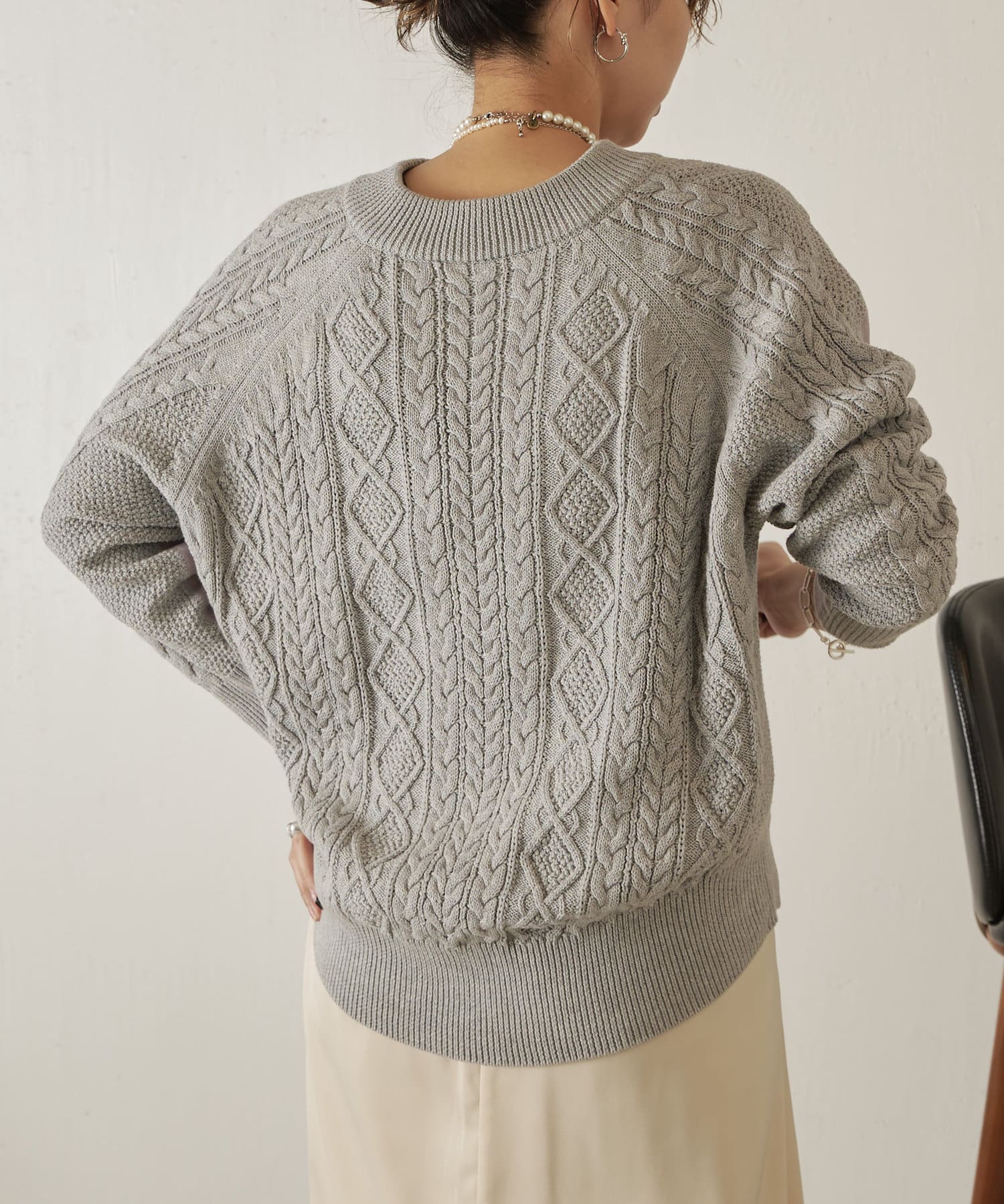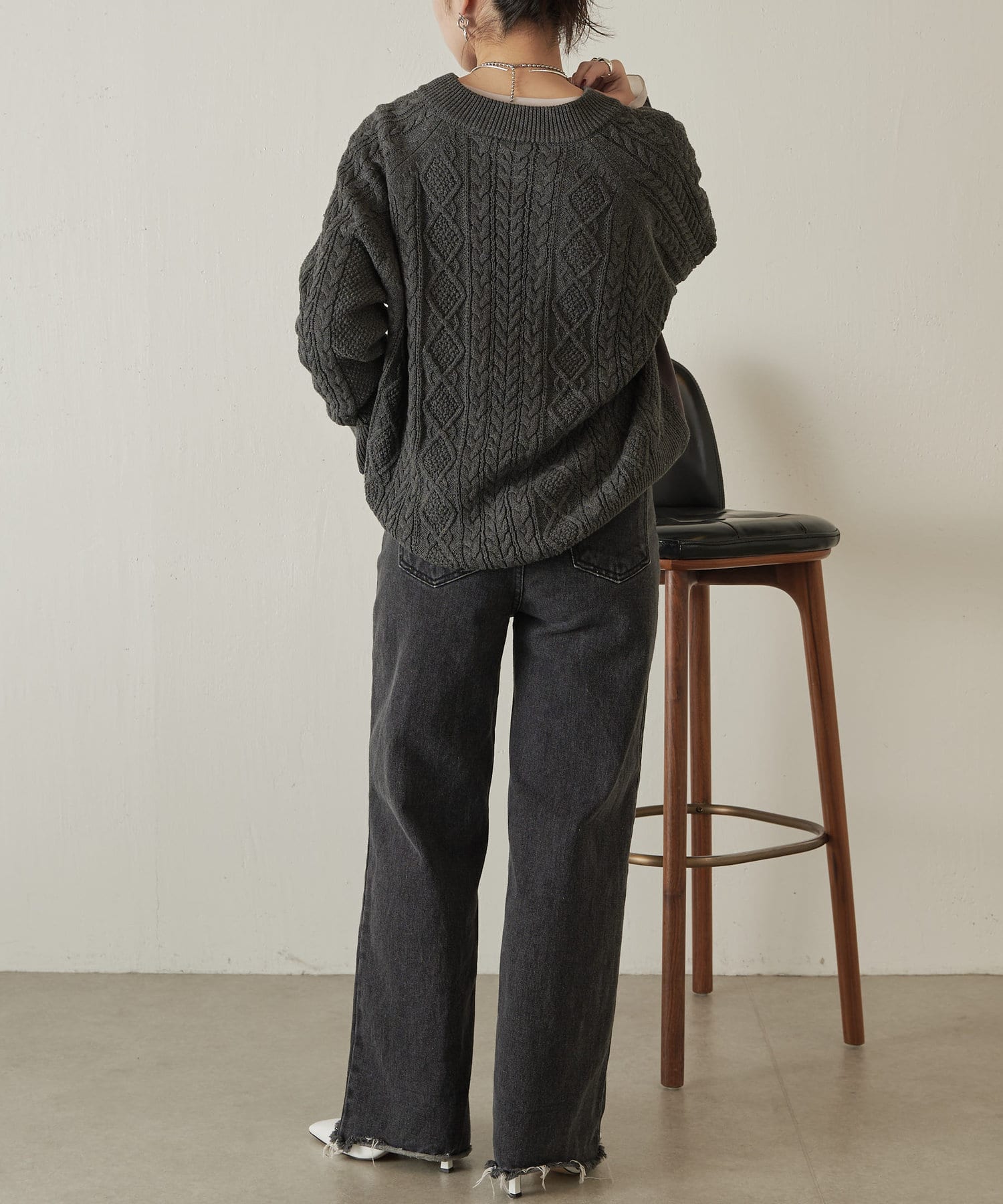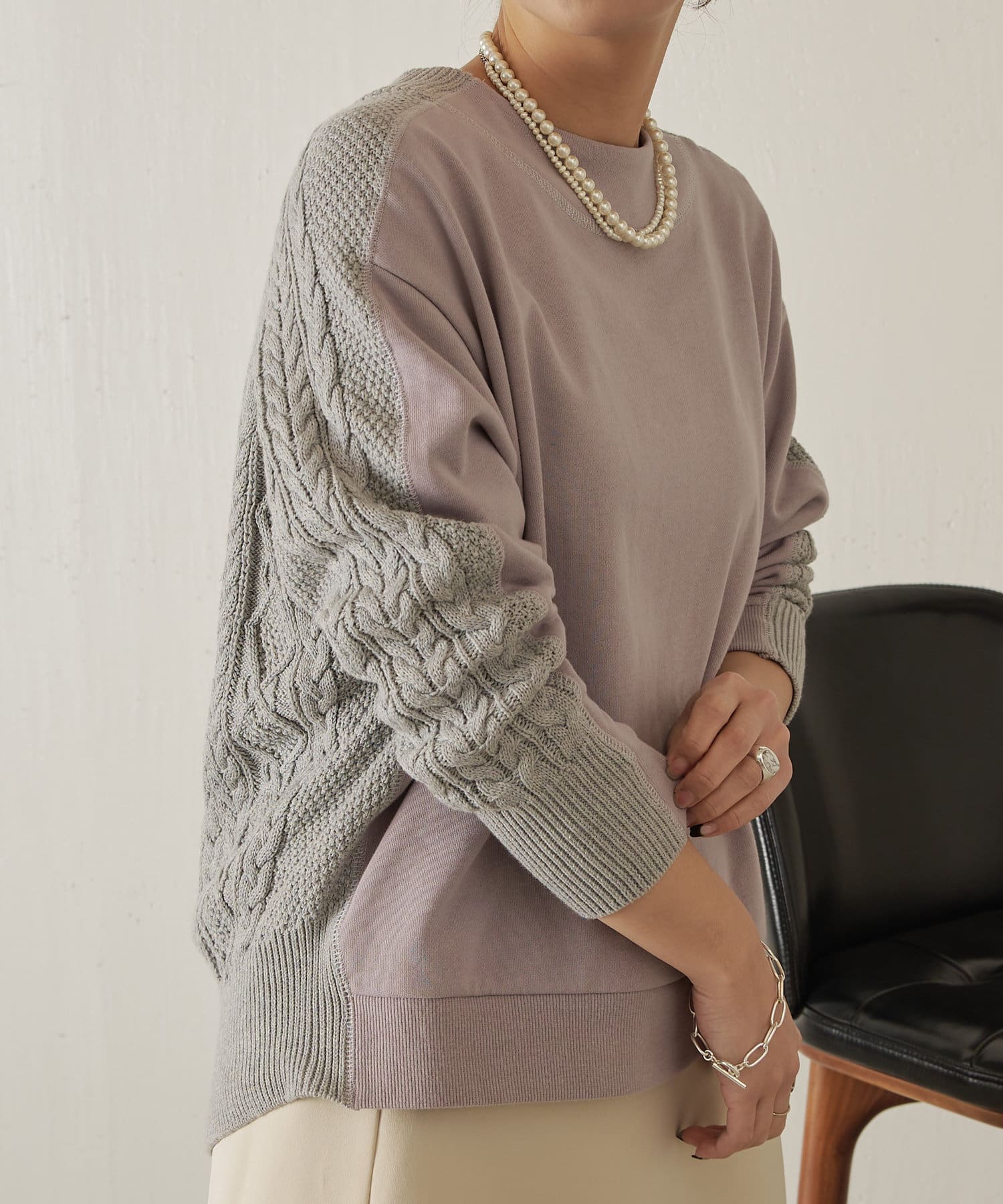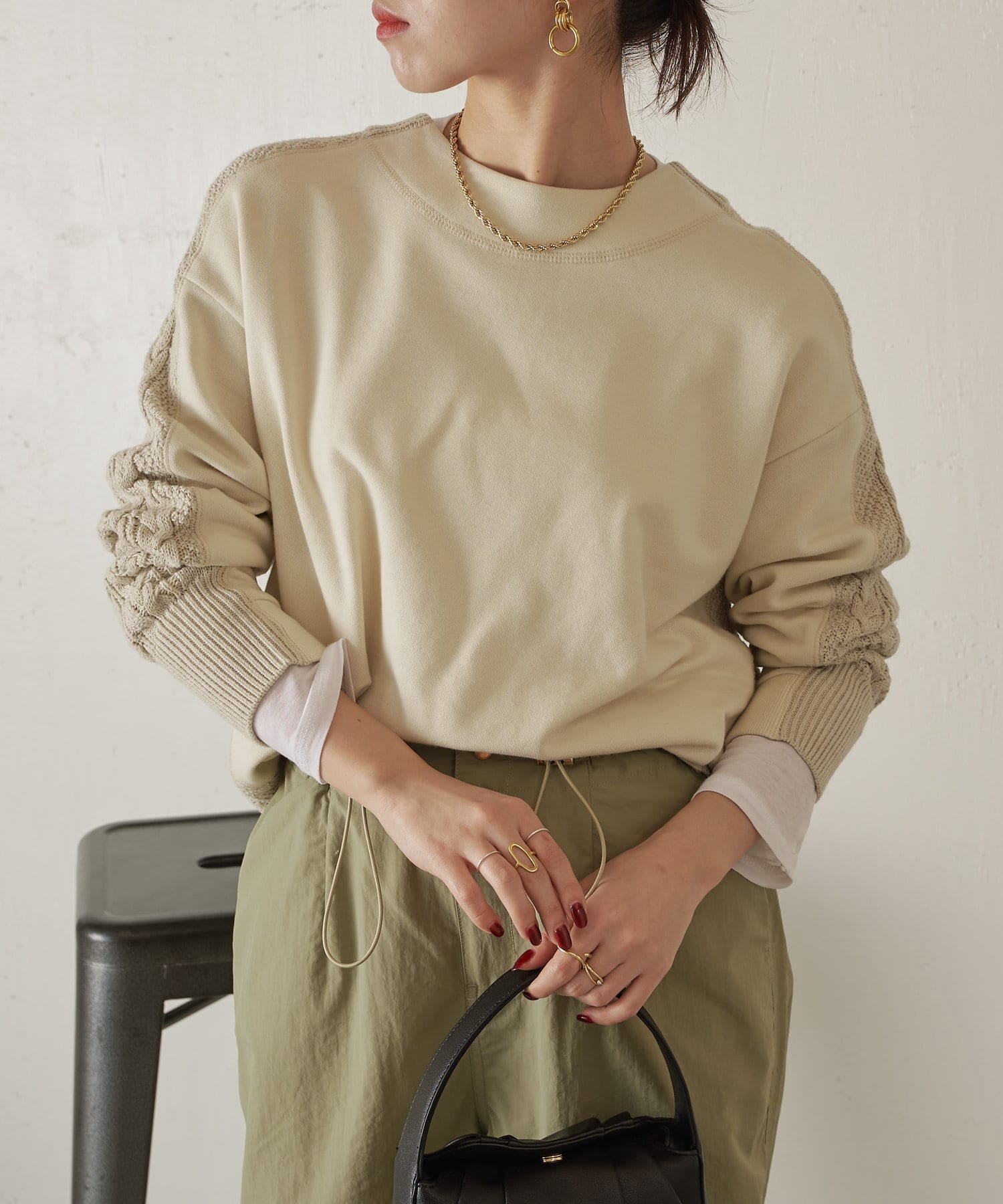 ・ケーブルニットとドッキングされた前後の大胆な切替が、他にはない一枚。