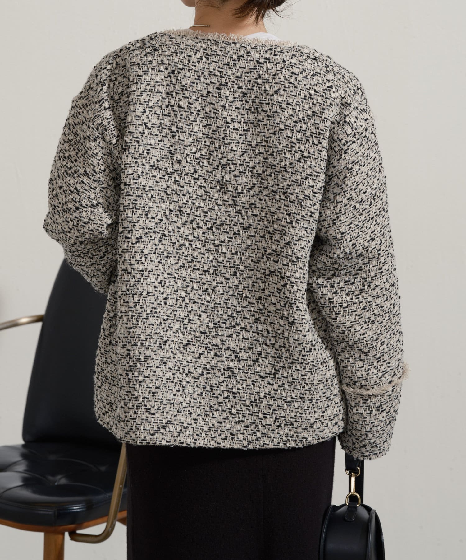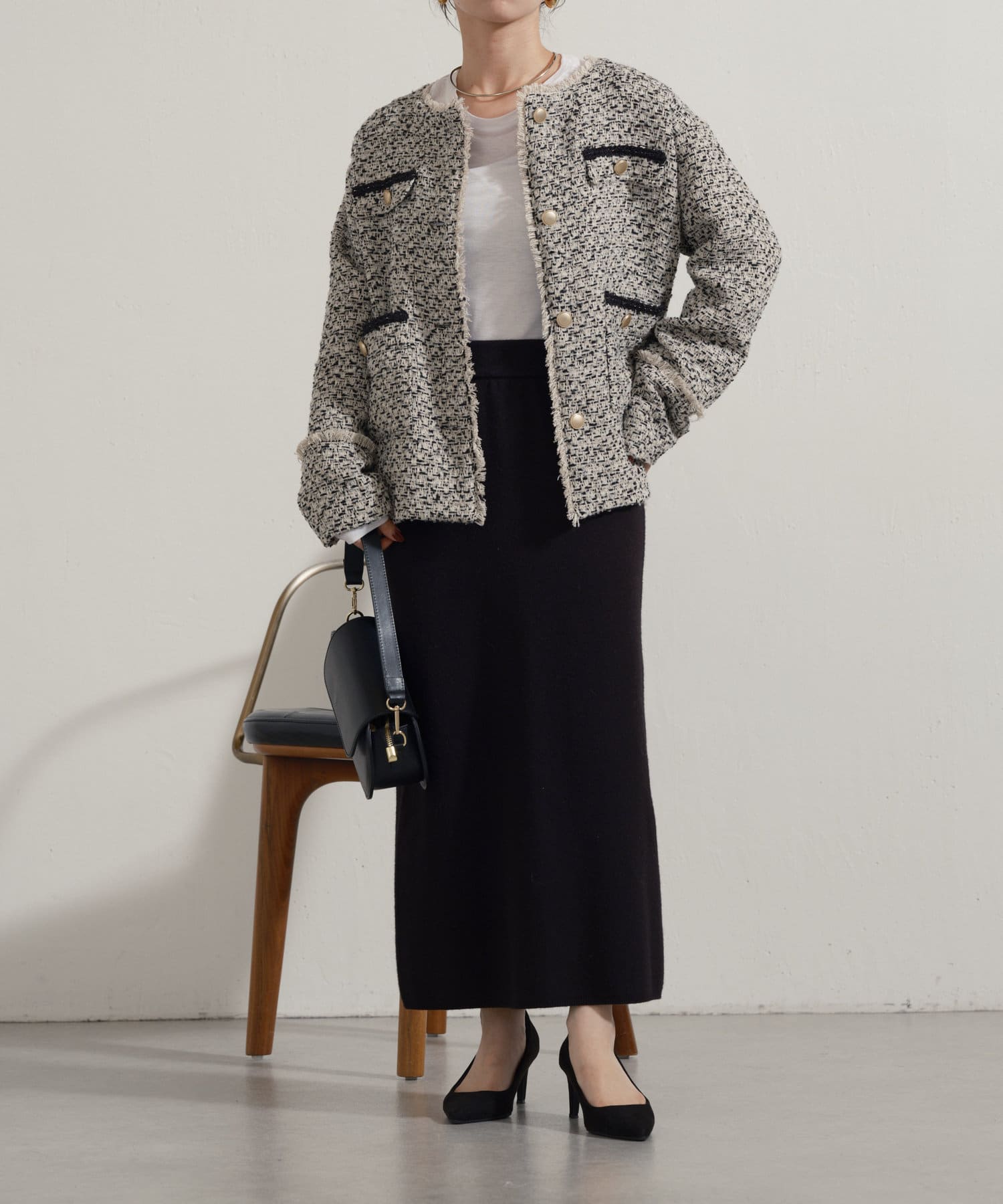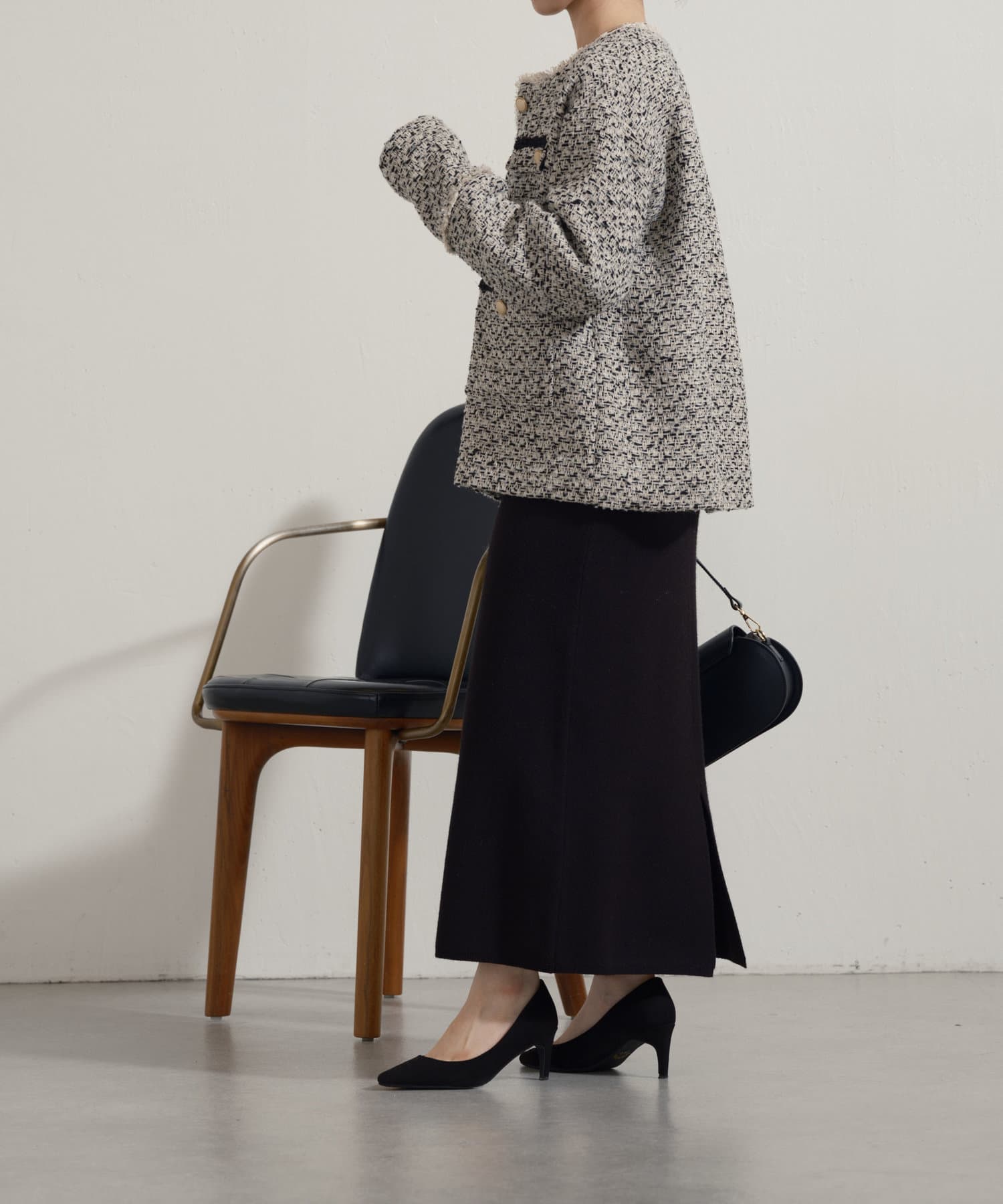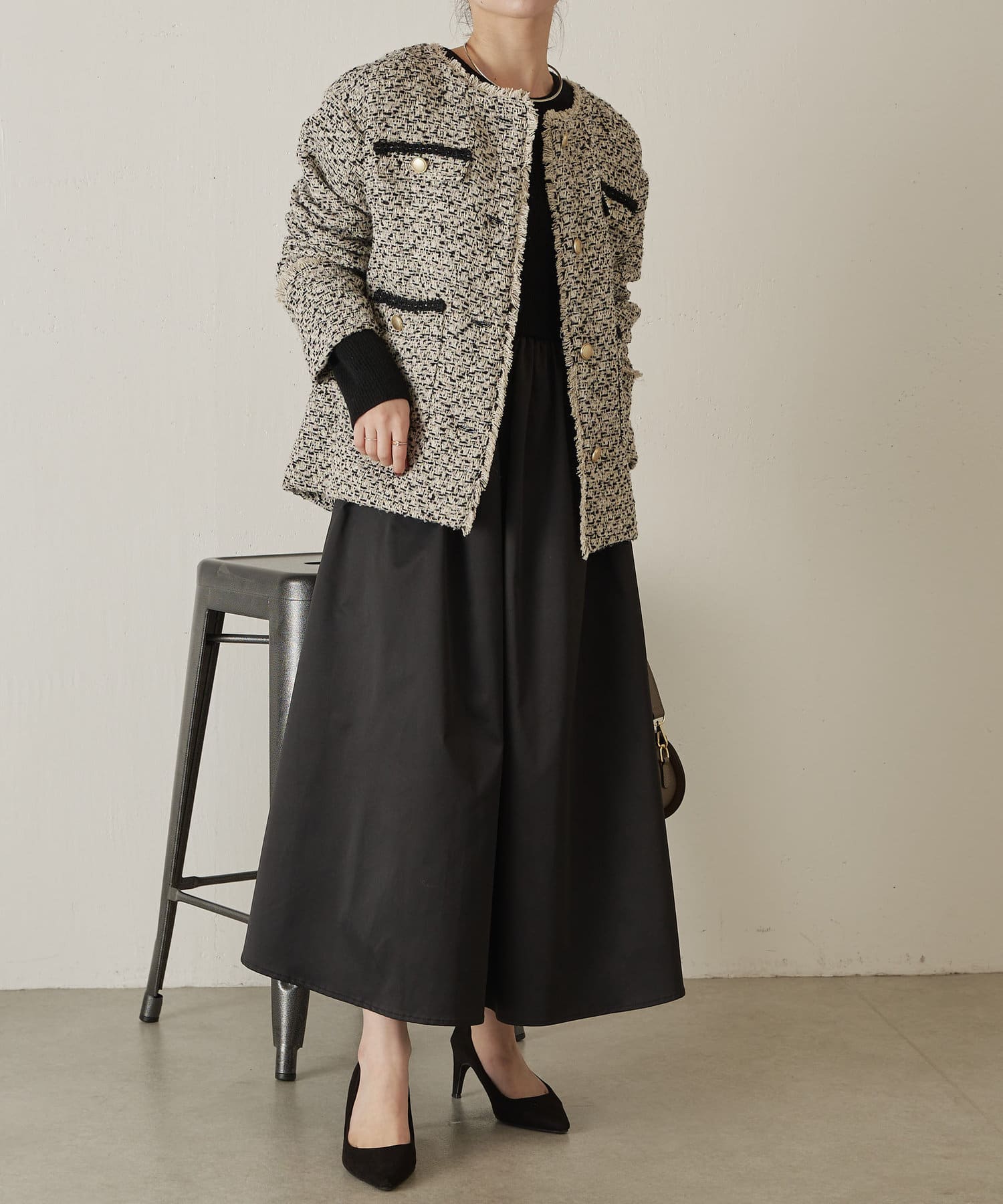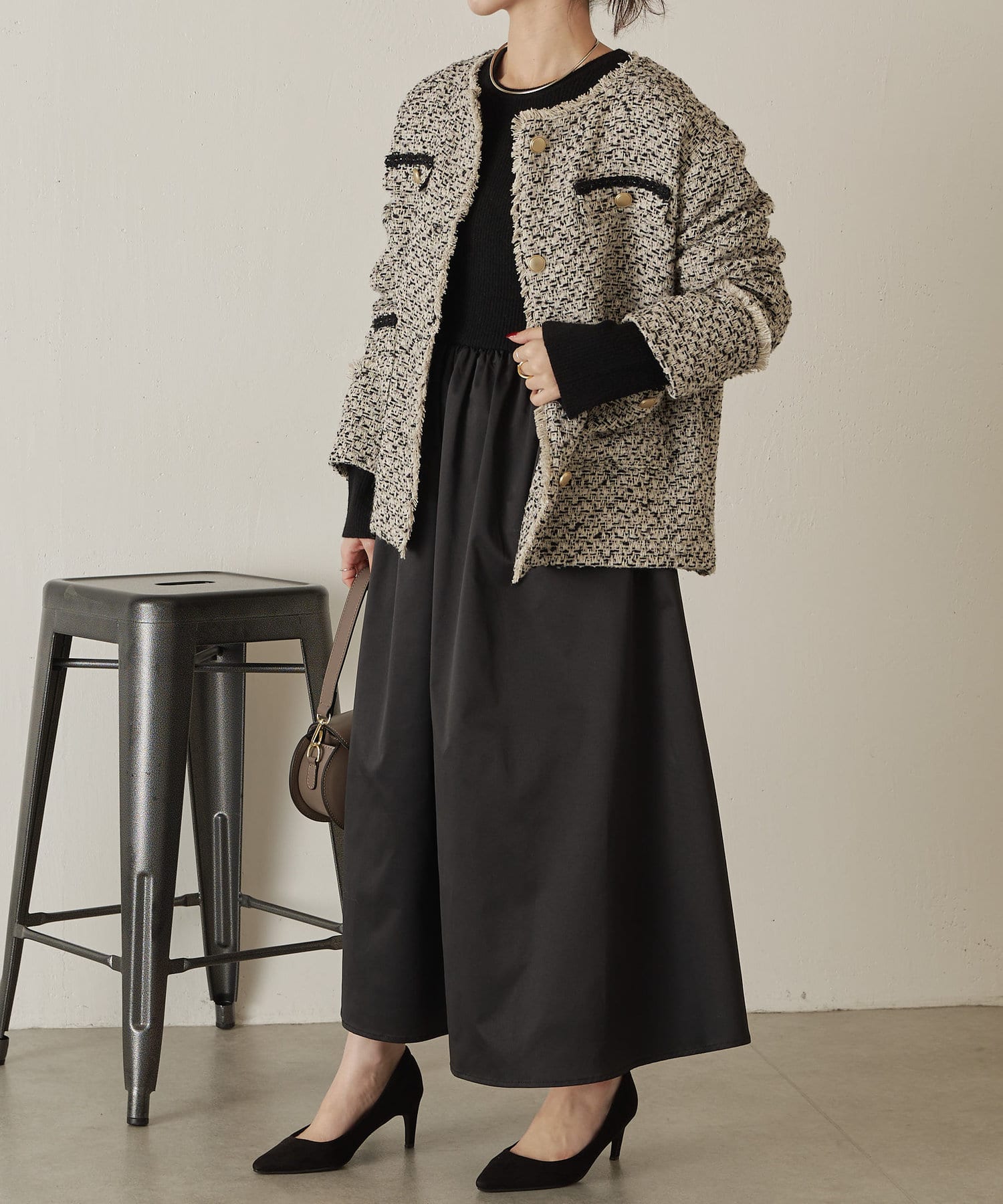 ・首元はノーカラーデザインなので、ハイネックのインナーを合わせてもすっきりとお召いただけます。