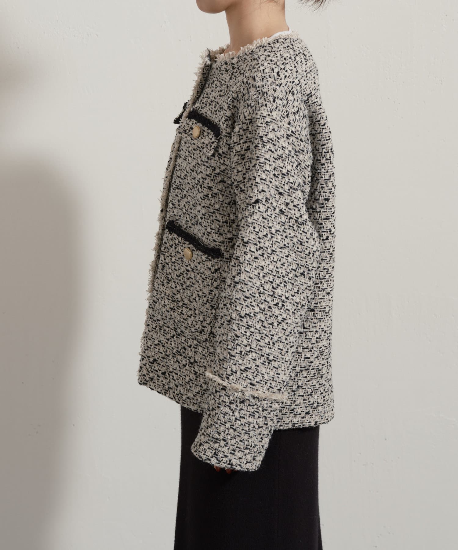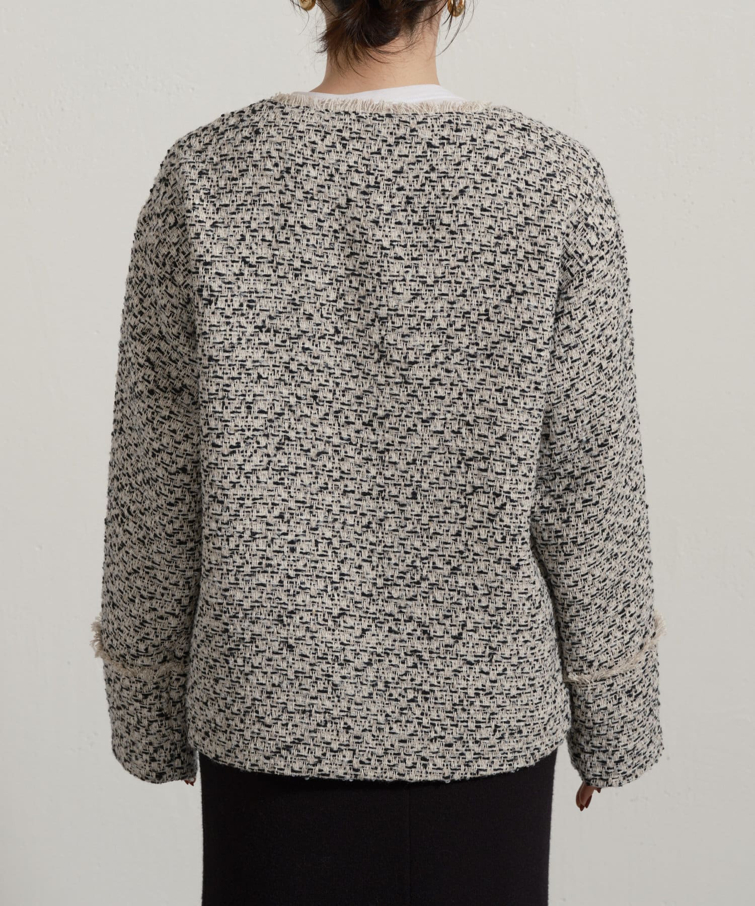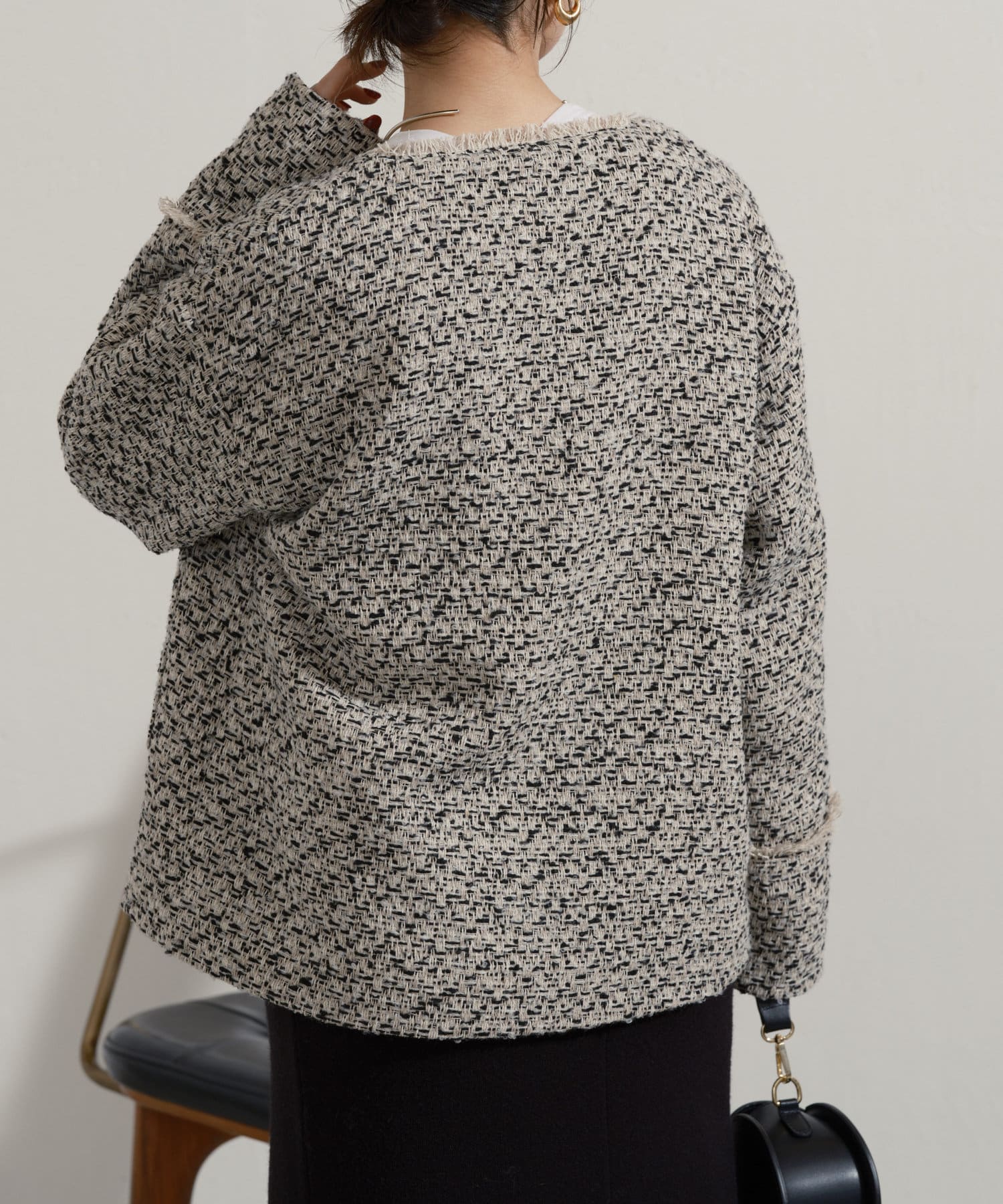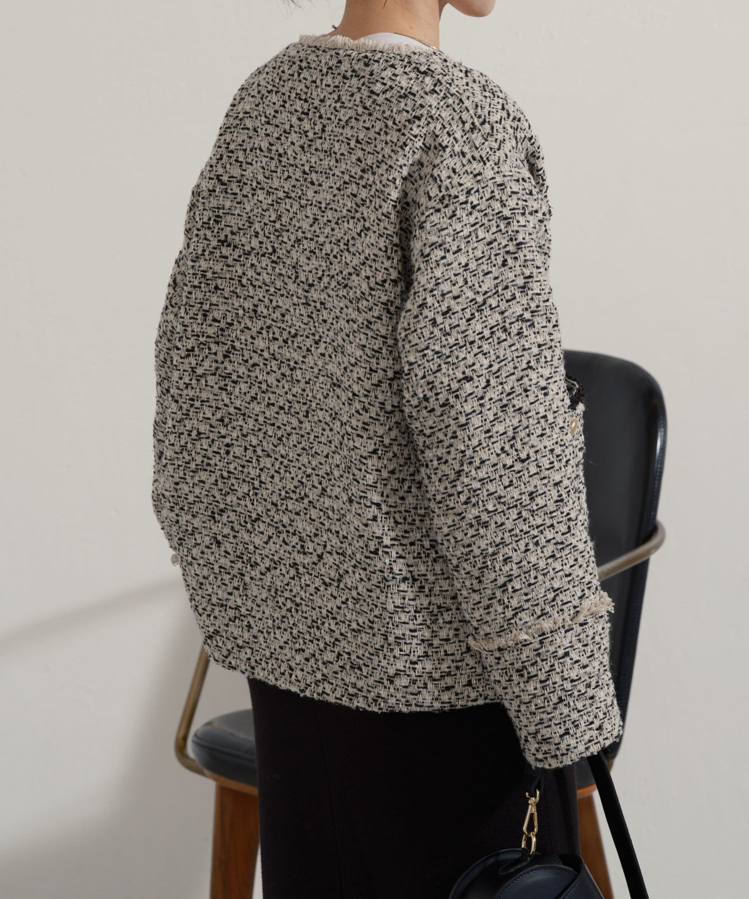 ・首元はノーカラーデザインなので、ハイネックのインナーを合わせてもすっきりとお召いただけます。