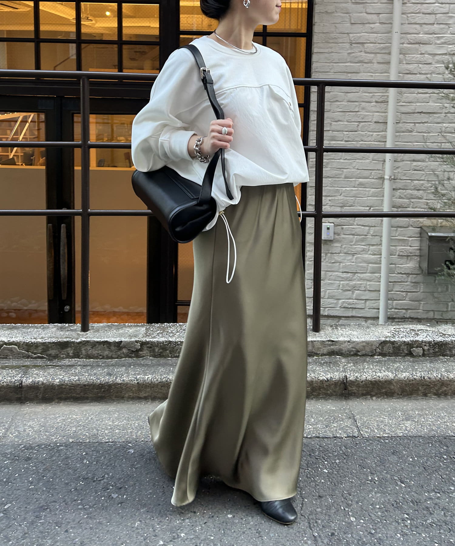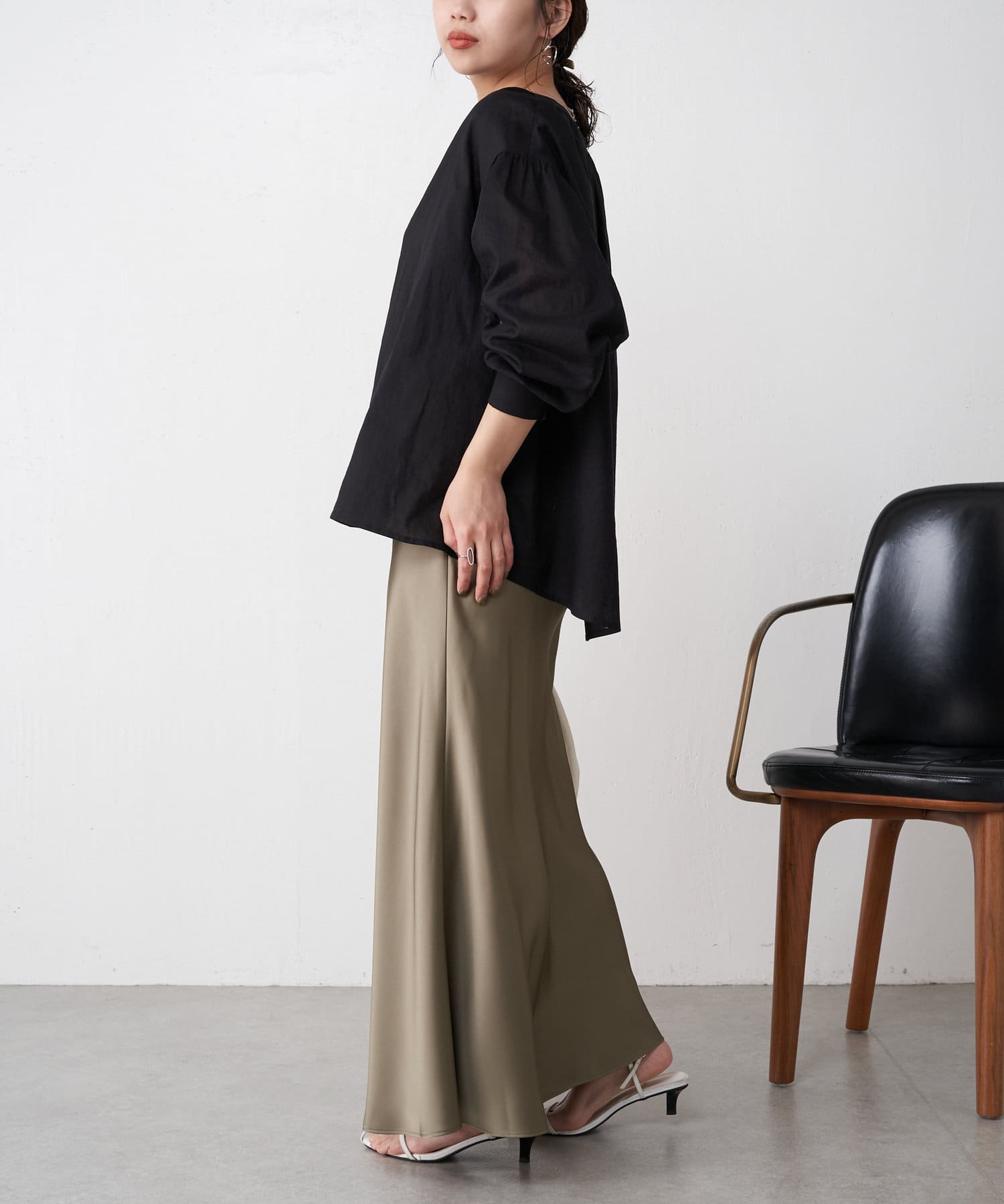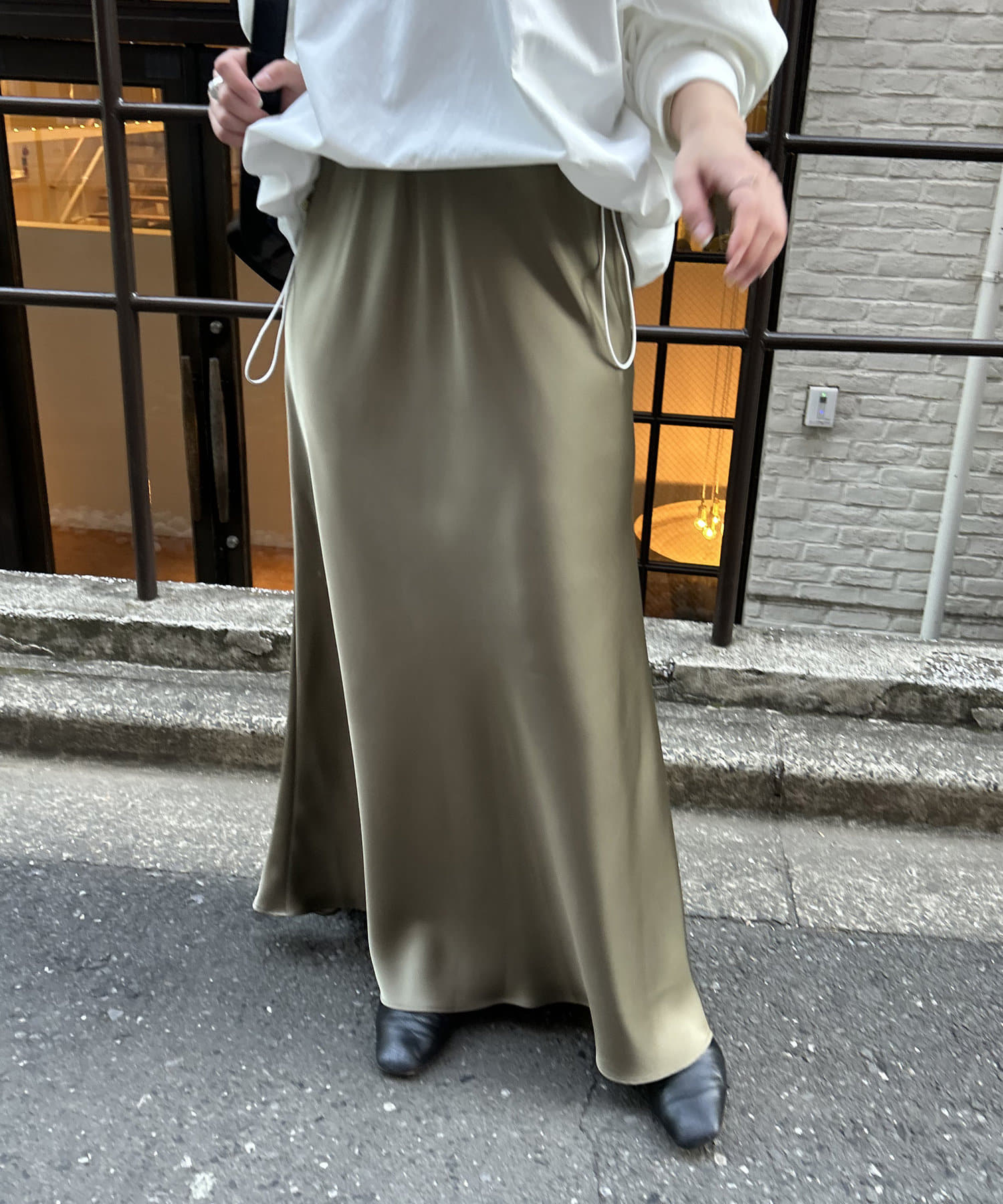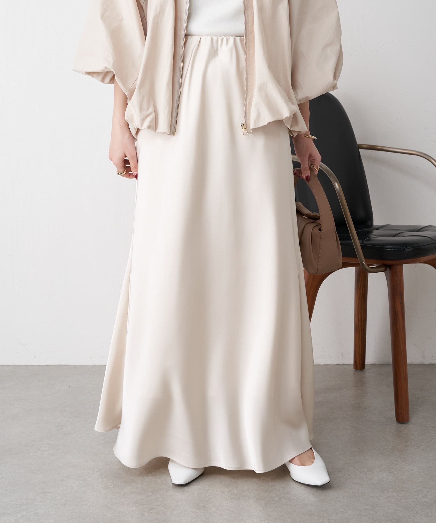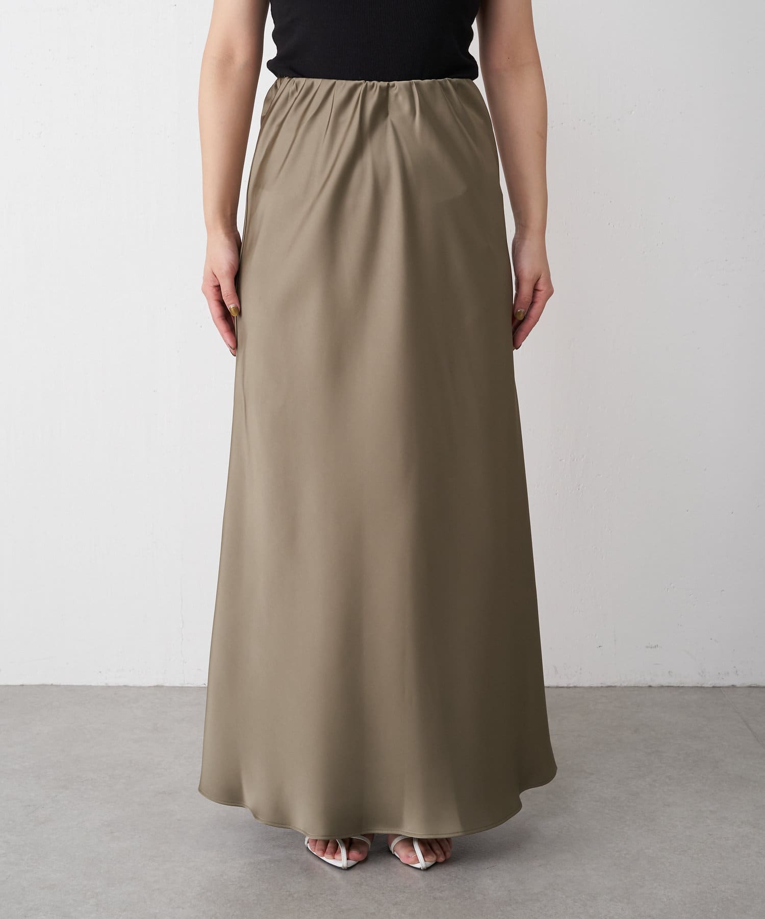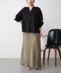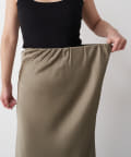 ・高級感ある艶とマーメードシルエットが女性らしいロングスカート。
