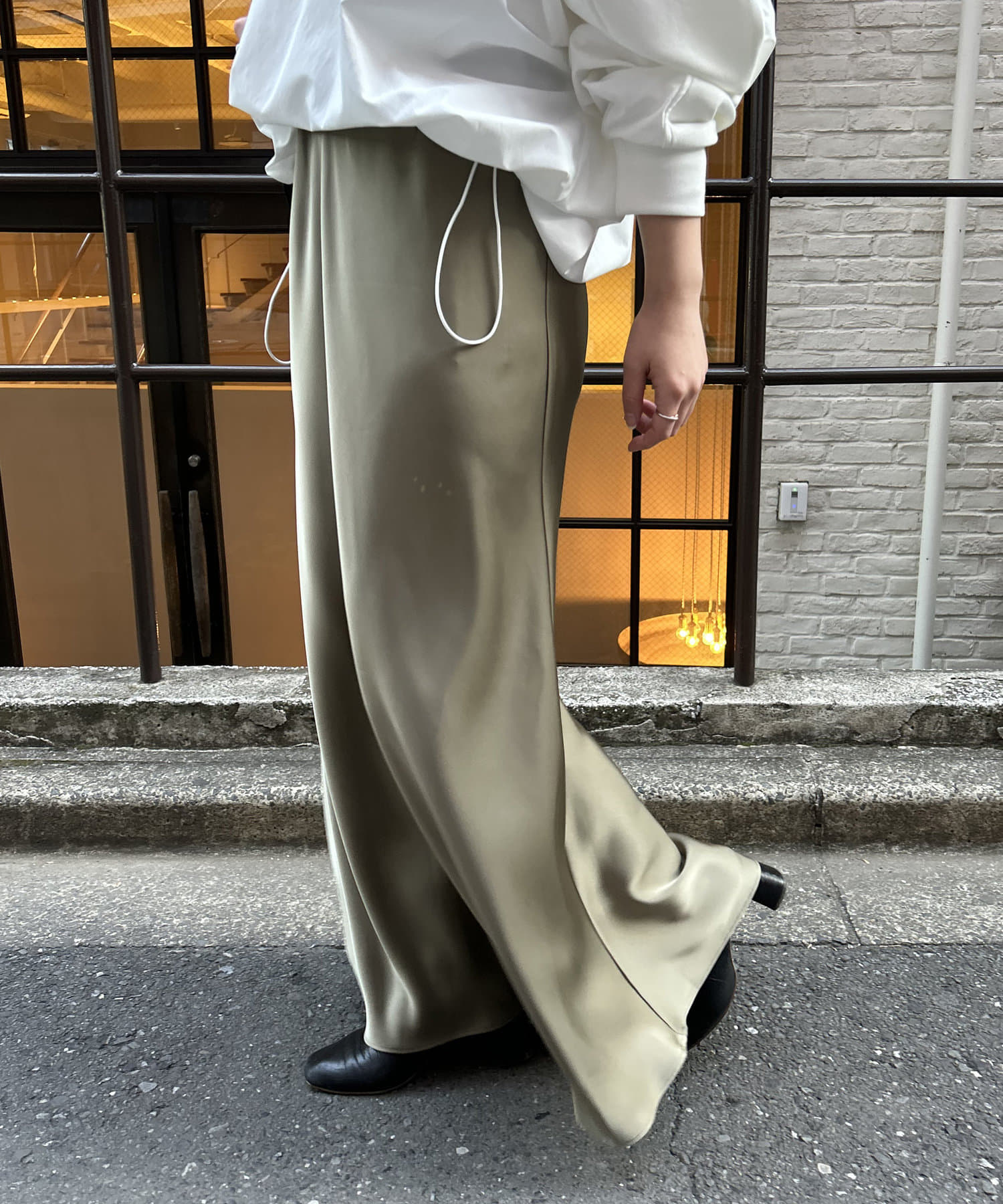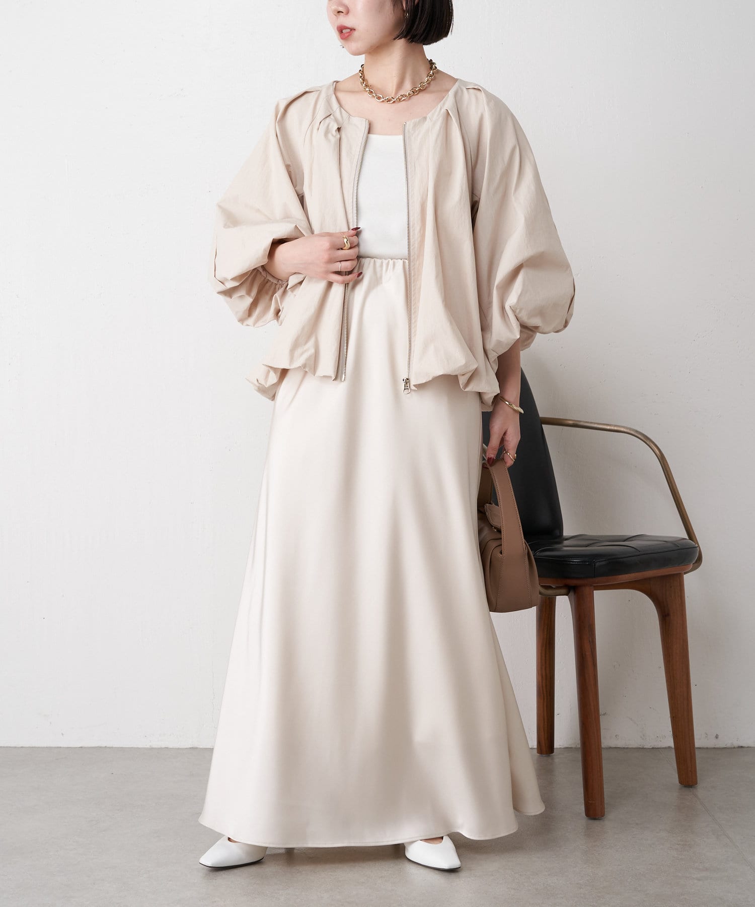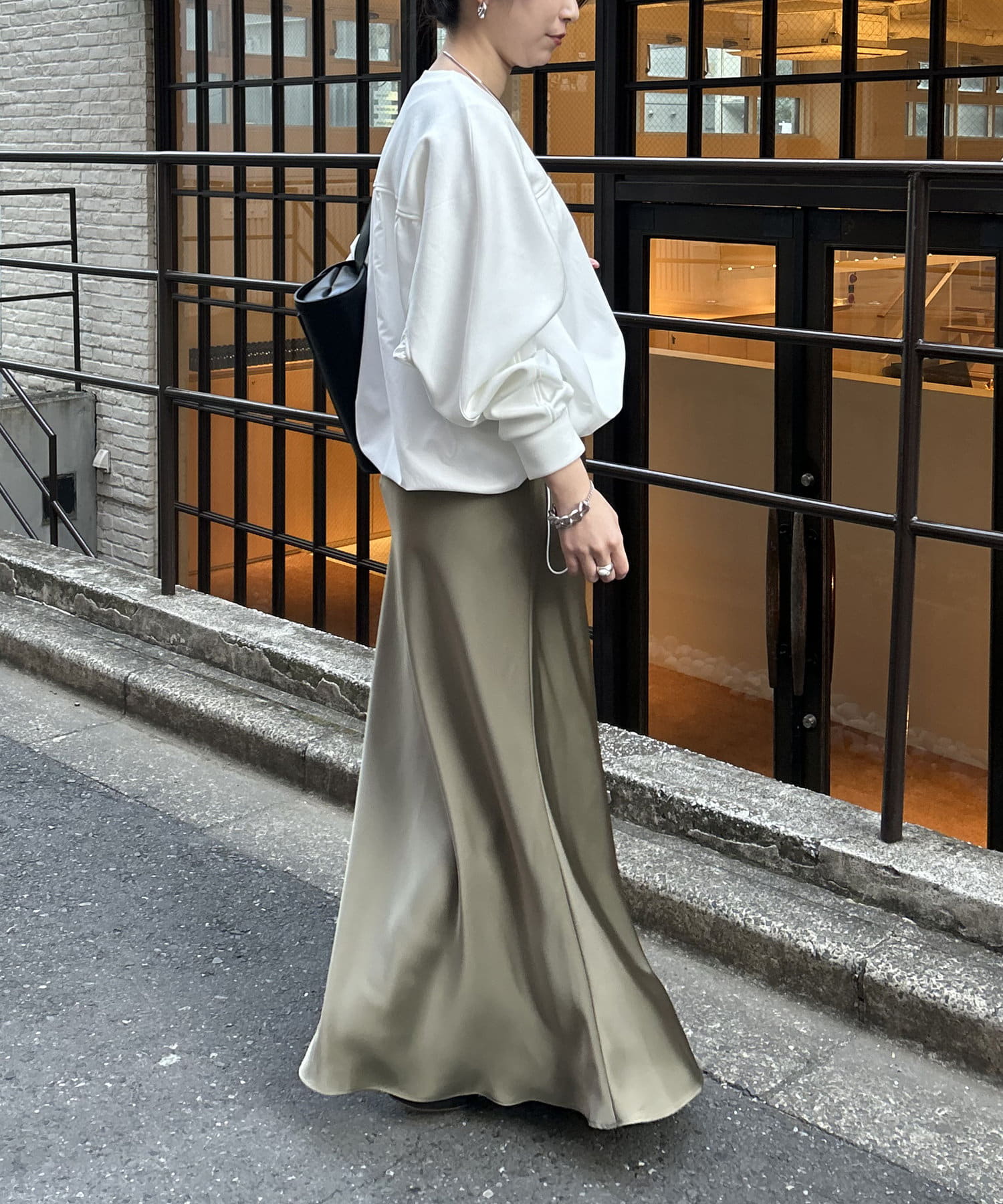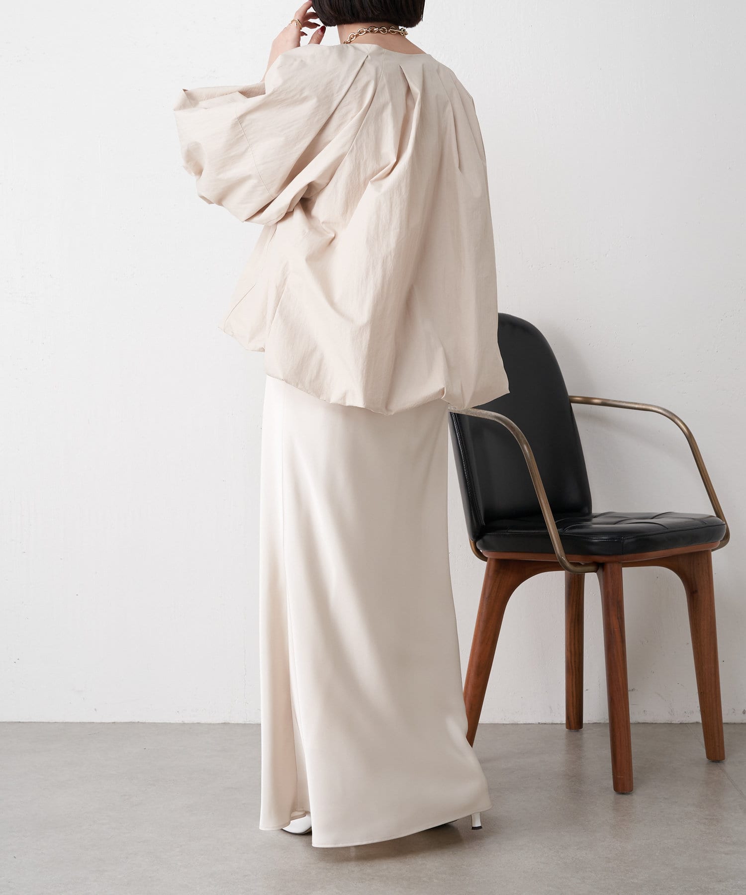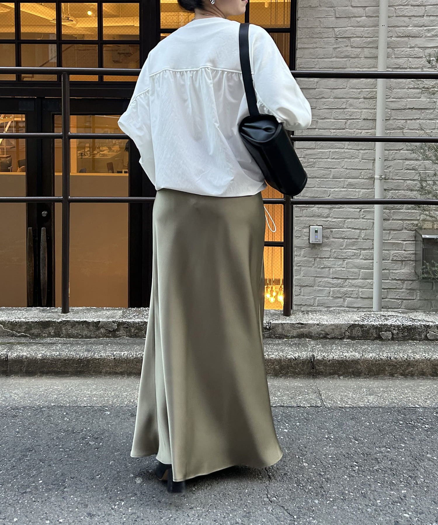 ・高級感ある艶とマーメードシルエットが女性らしいロングスカート。