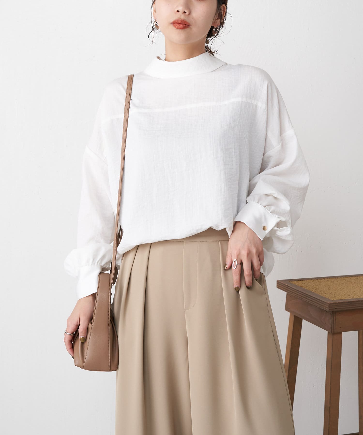 ・春先、秋口から活躍する、スタンドネックのデザインブラウス。