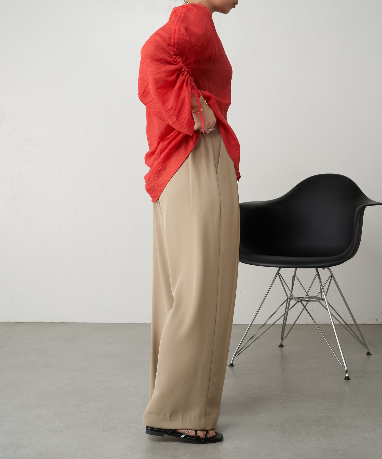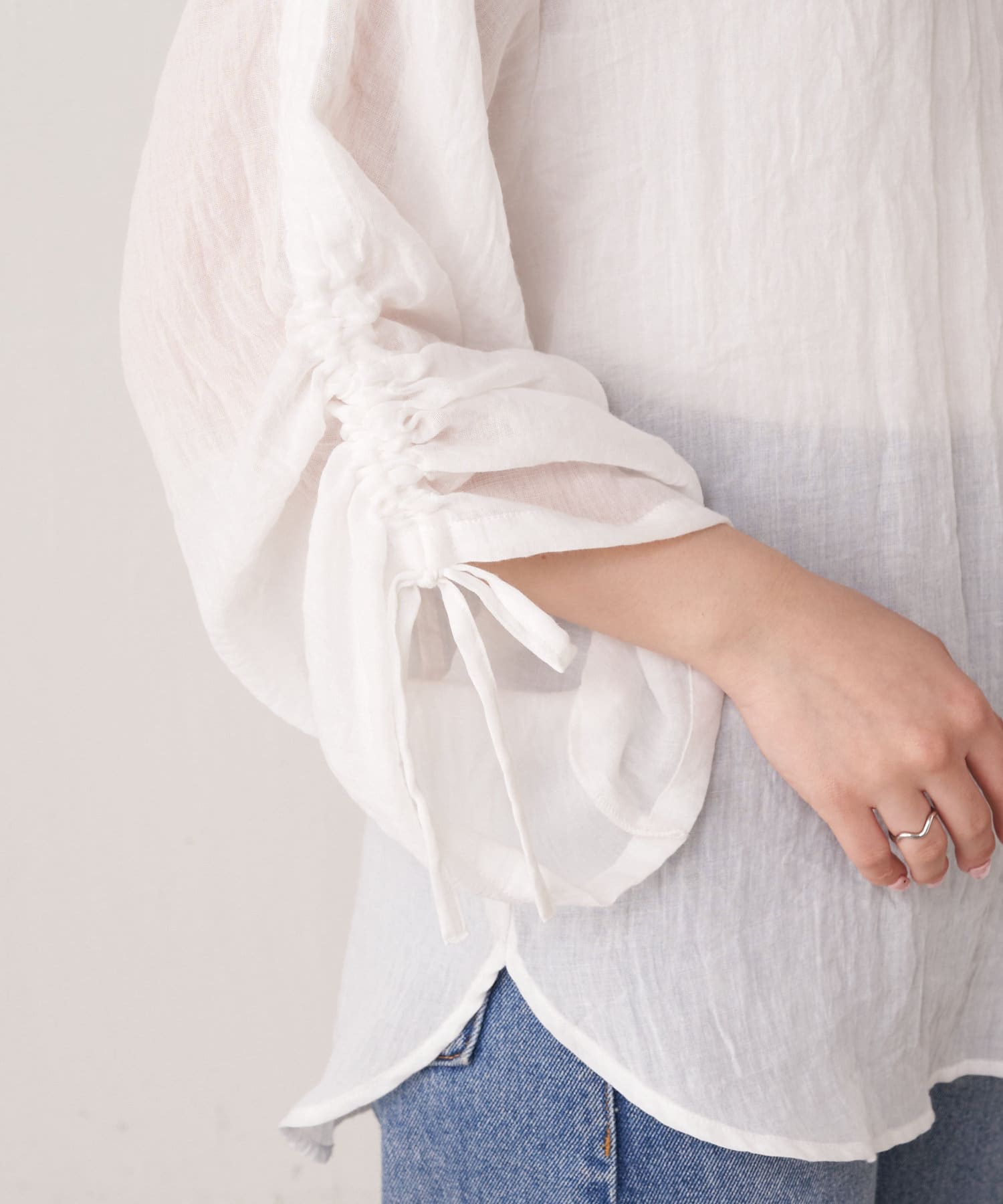 ・袖にドローストリングを施した、ボリュームスリーブがポイントの着映えブラウス。