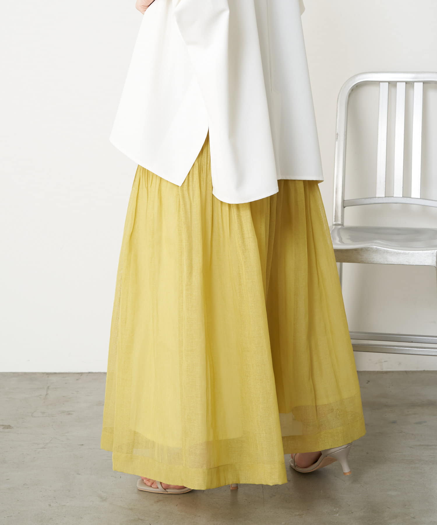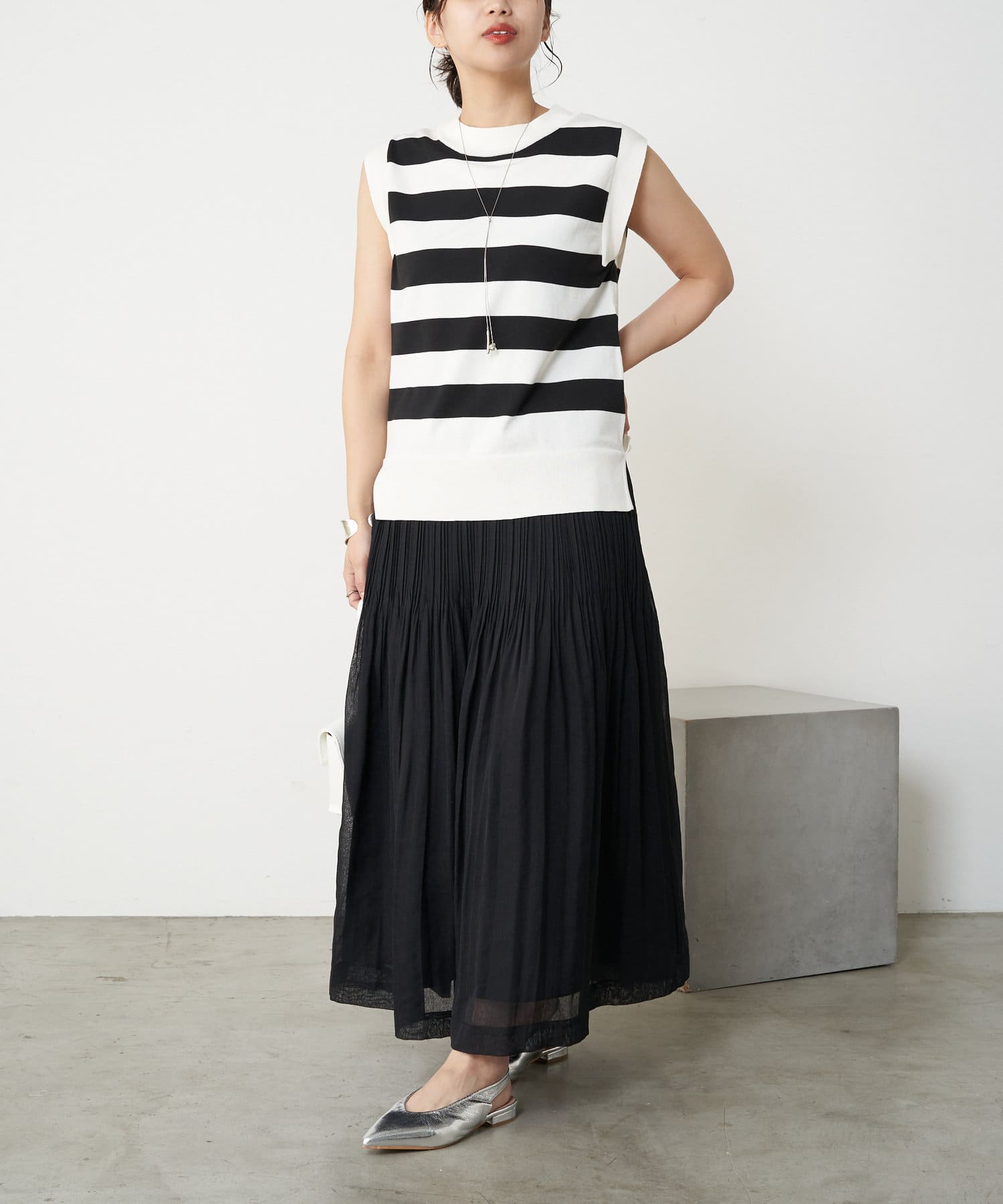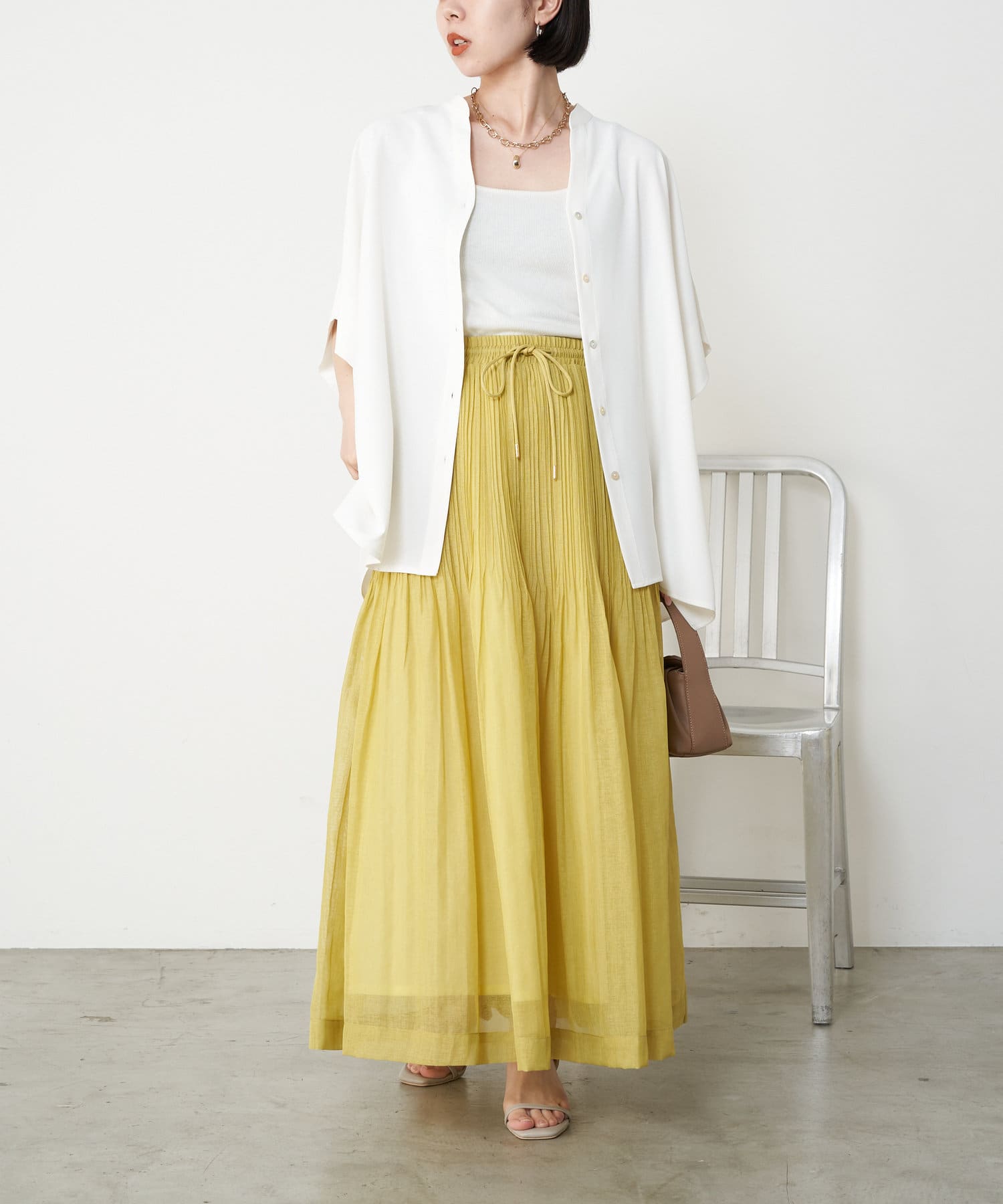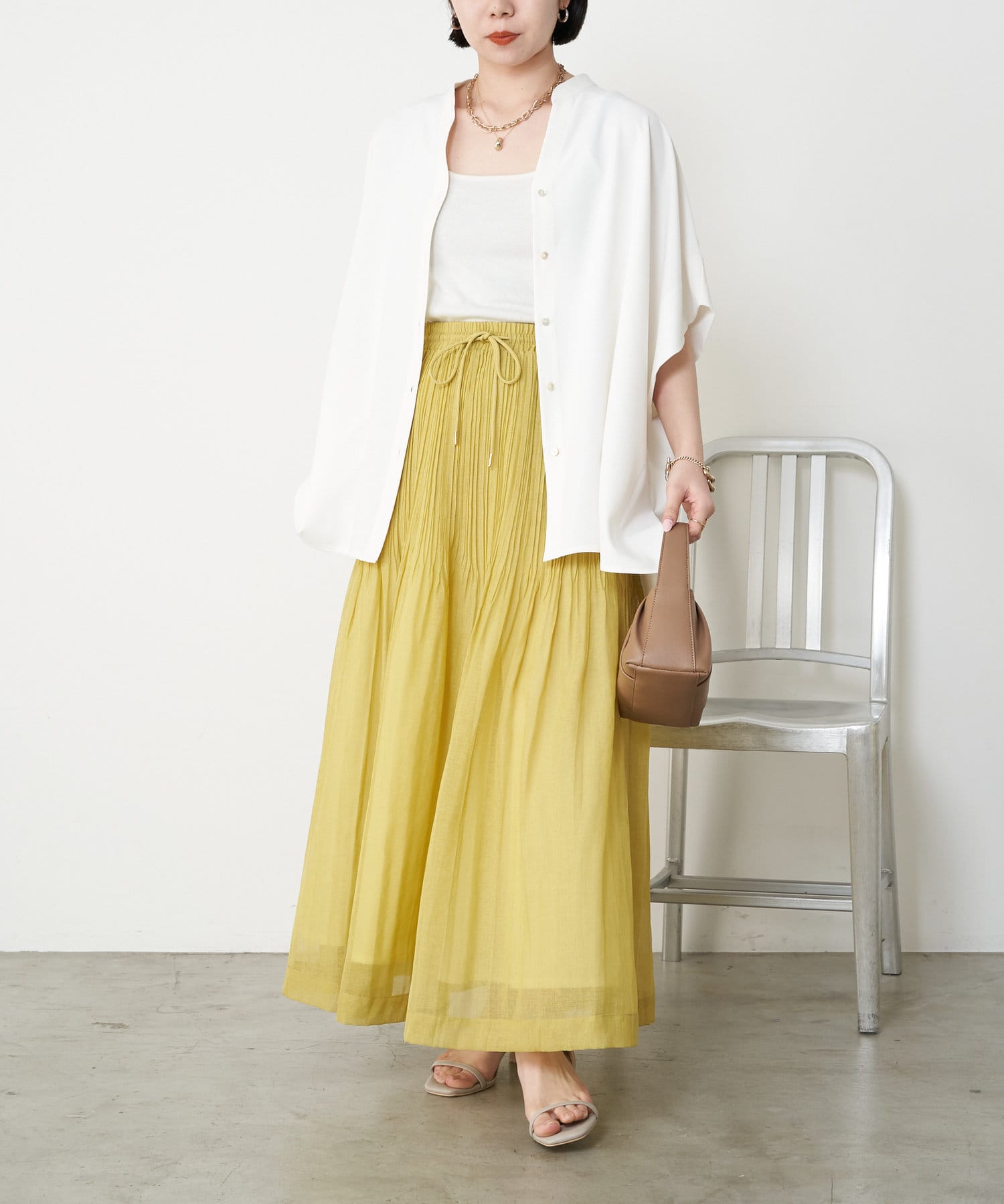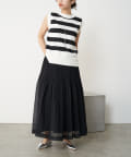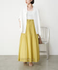 ・足元がフワっとなる女性らしいフレアスカートなので、タンクトップや短丈トップスと合わせるのがおすすめです。