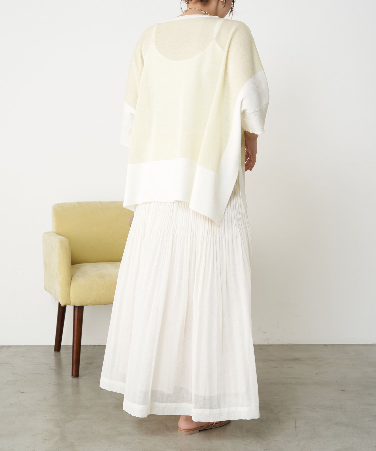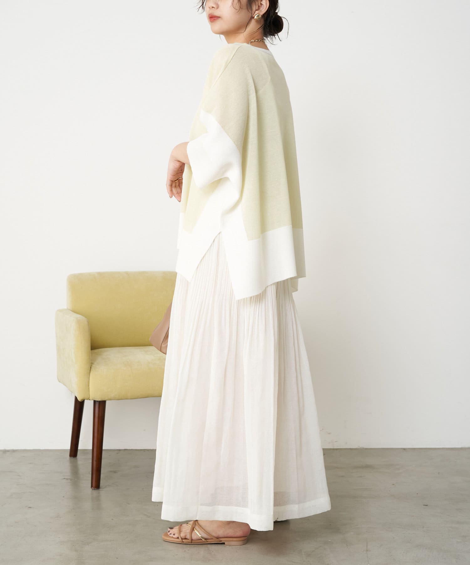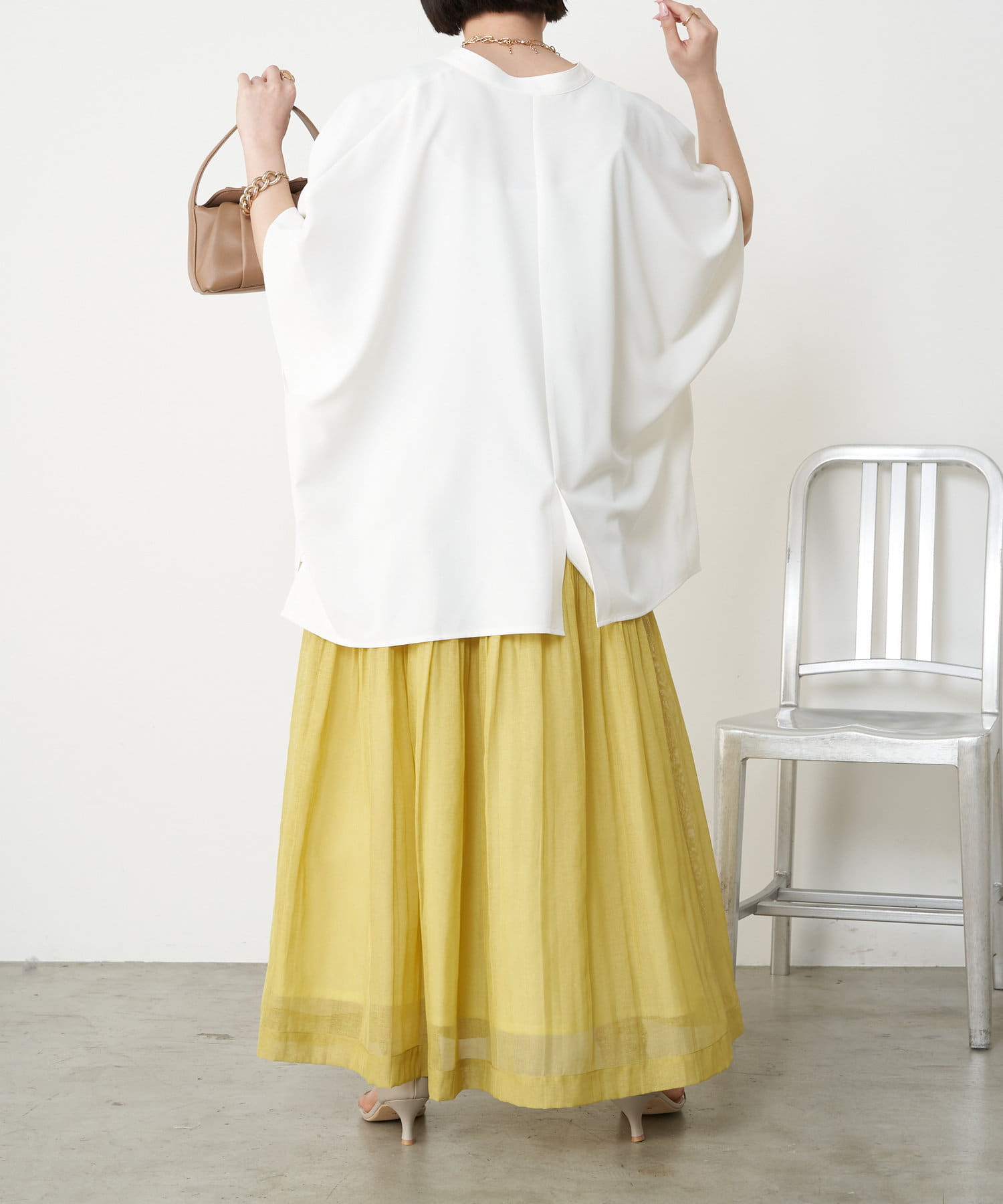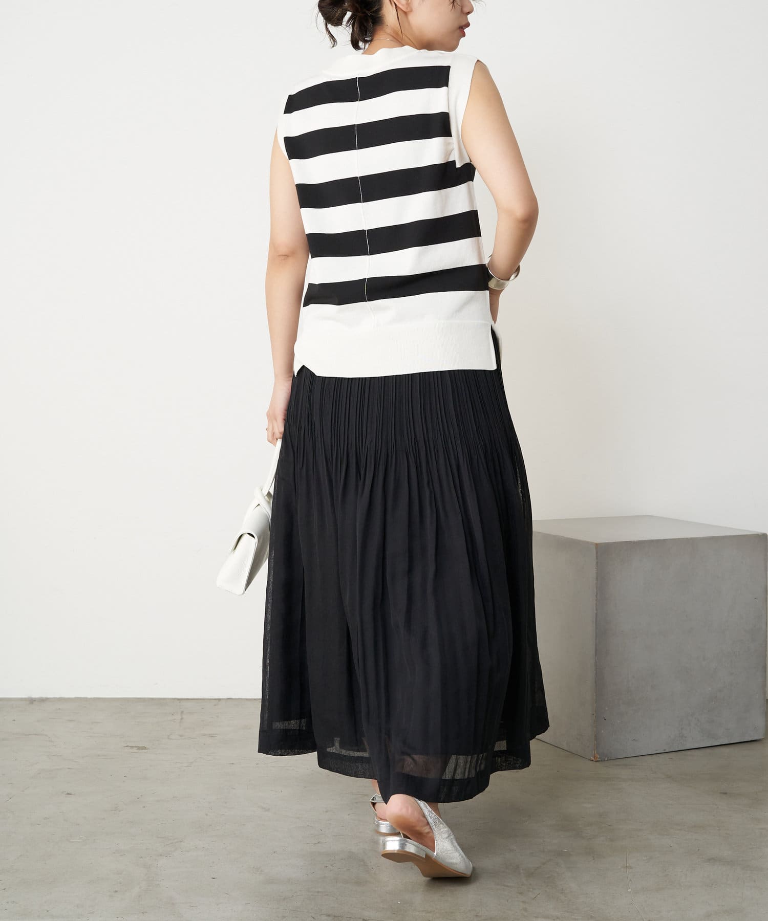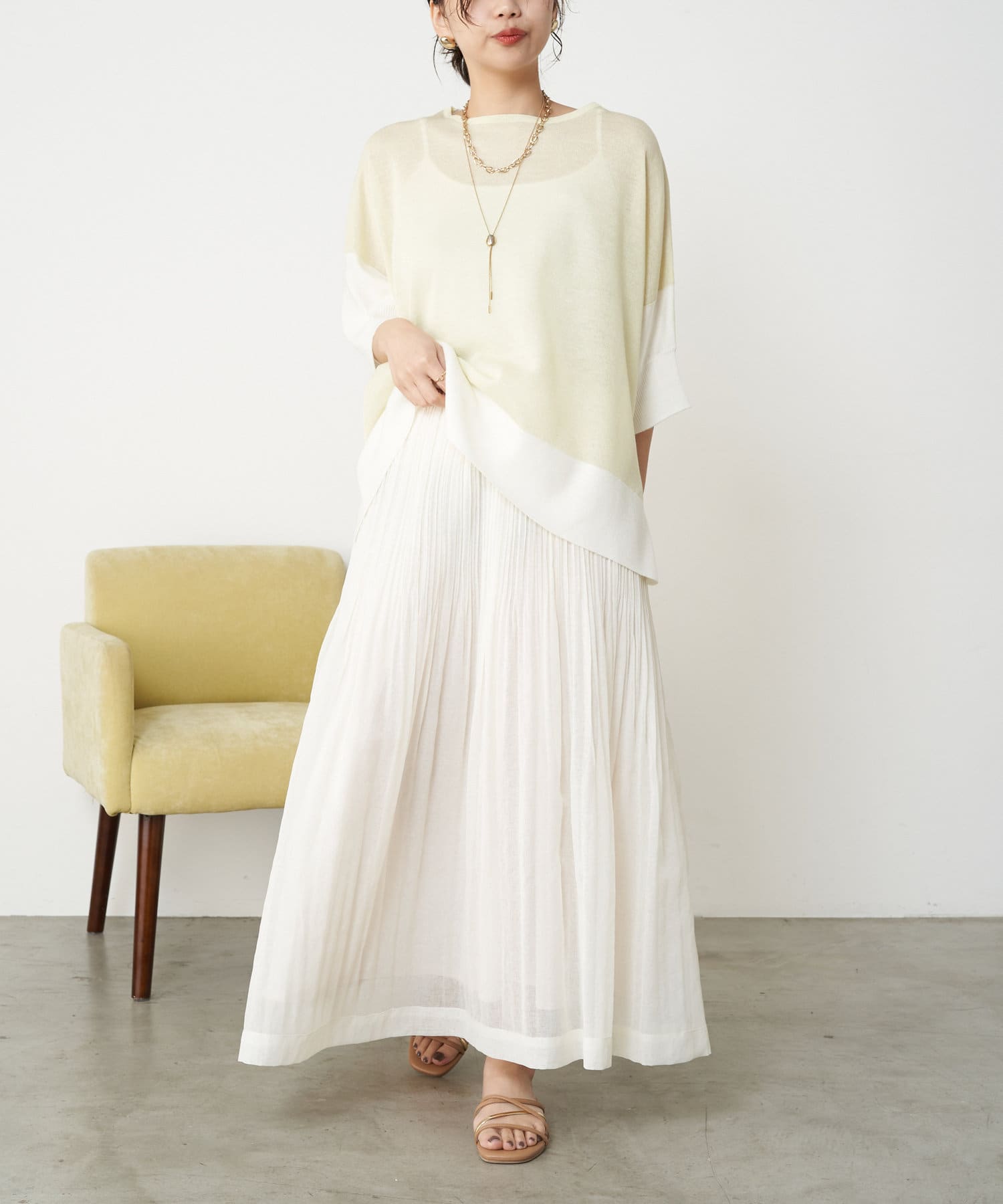 ・足元がフワっとなる女性らしいフレアスカートなので、タンクトップや短丈トップスと合わせるのがおすすめです。