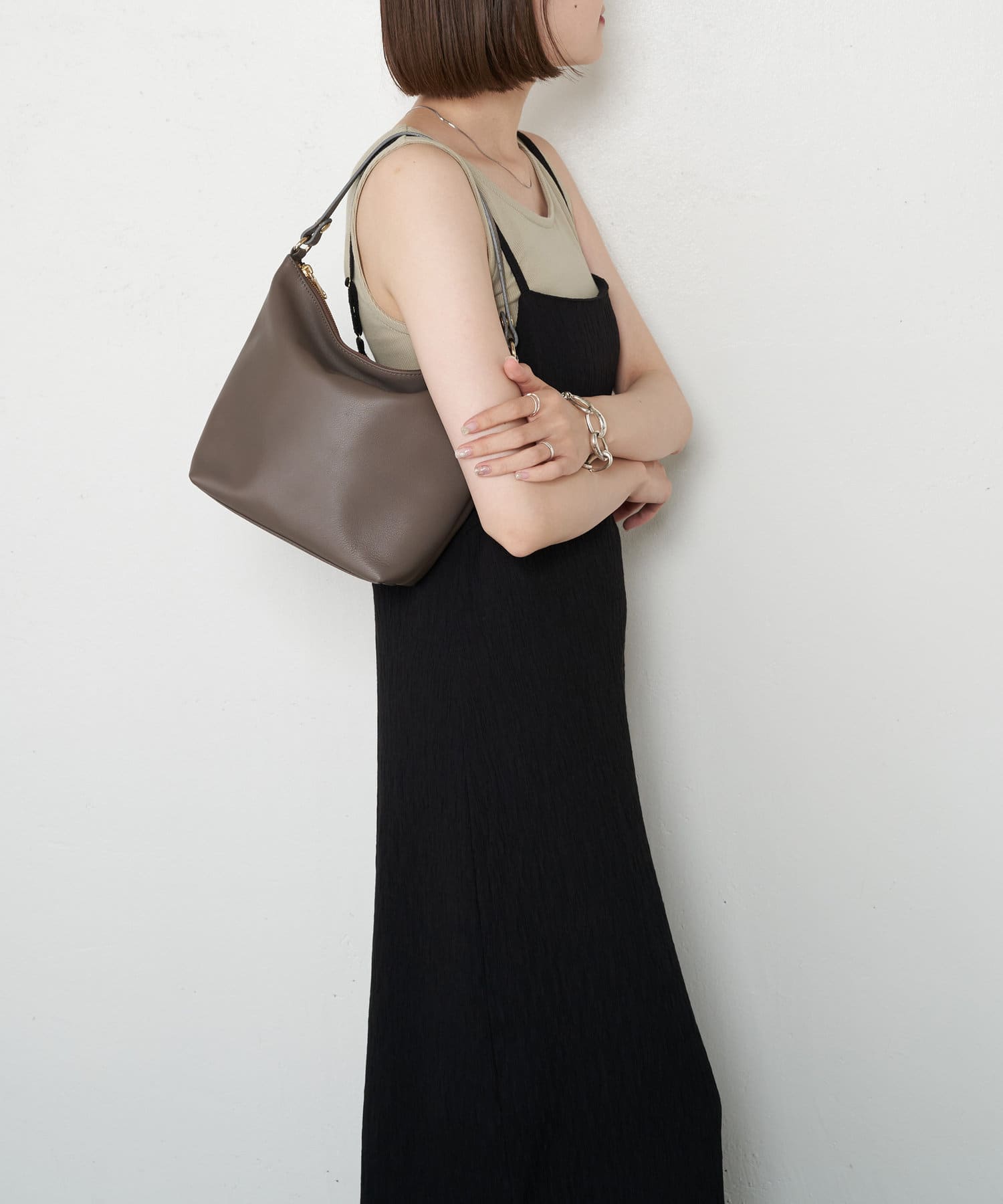 ・首元の空き具合や、サイドのスリットが大人の抜け感を演出。