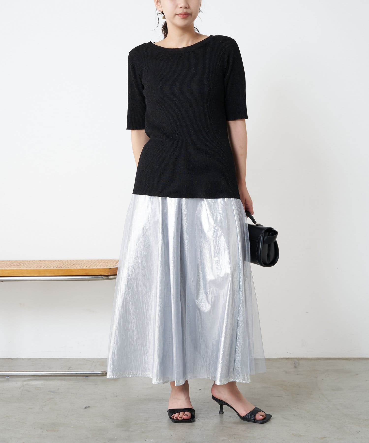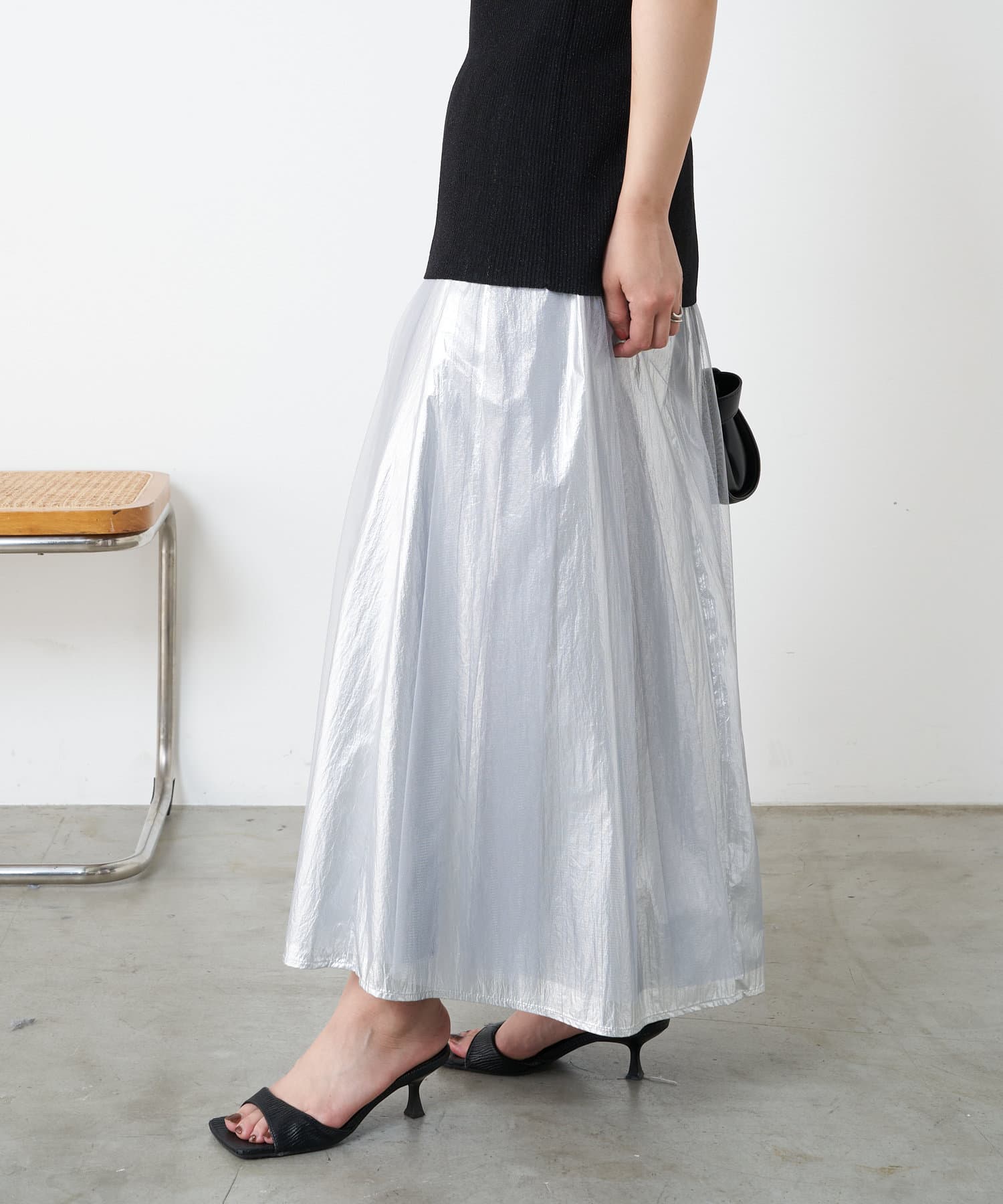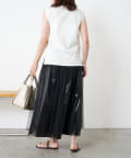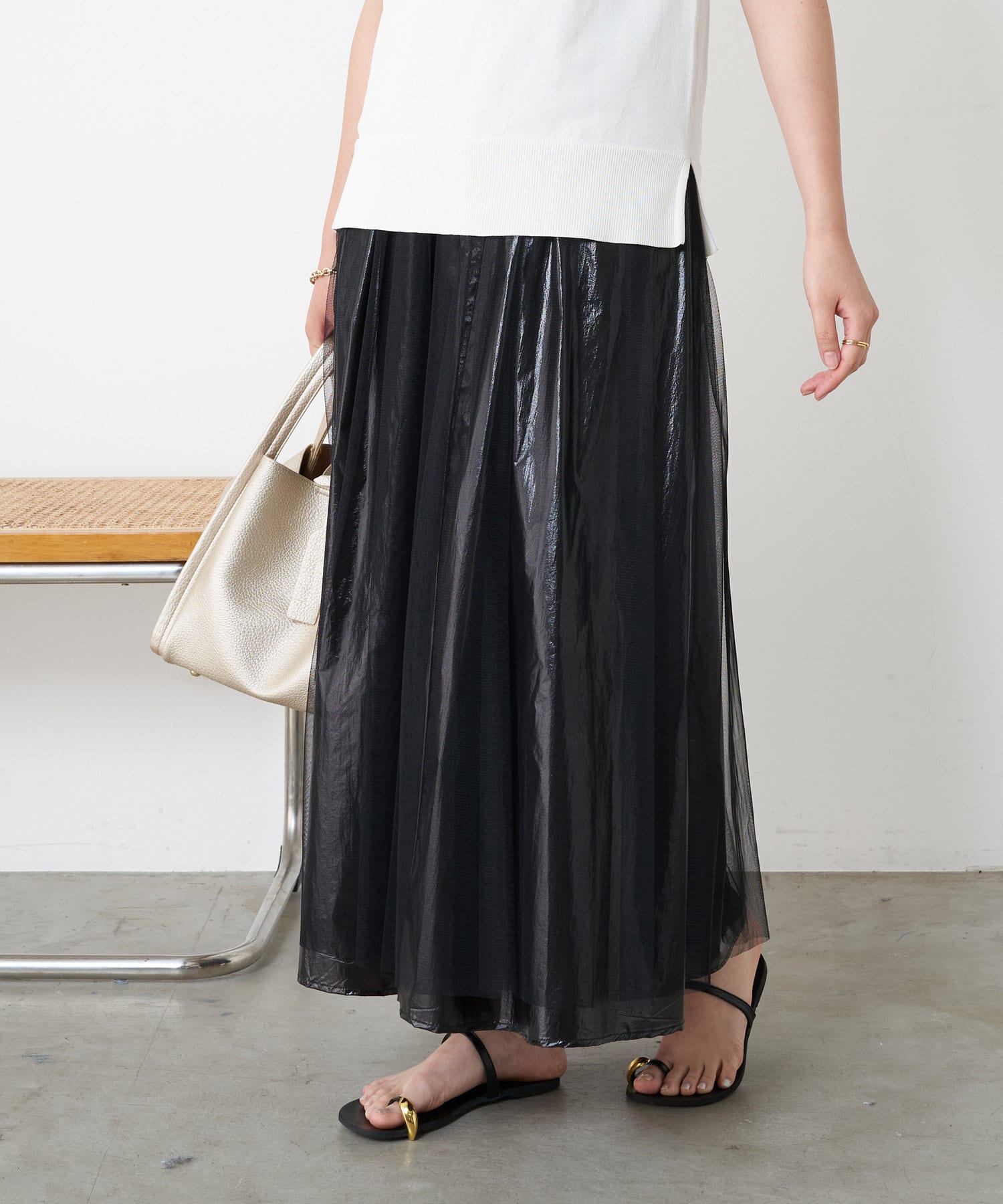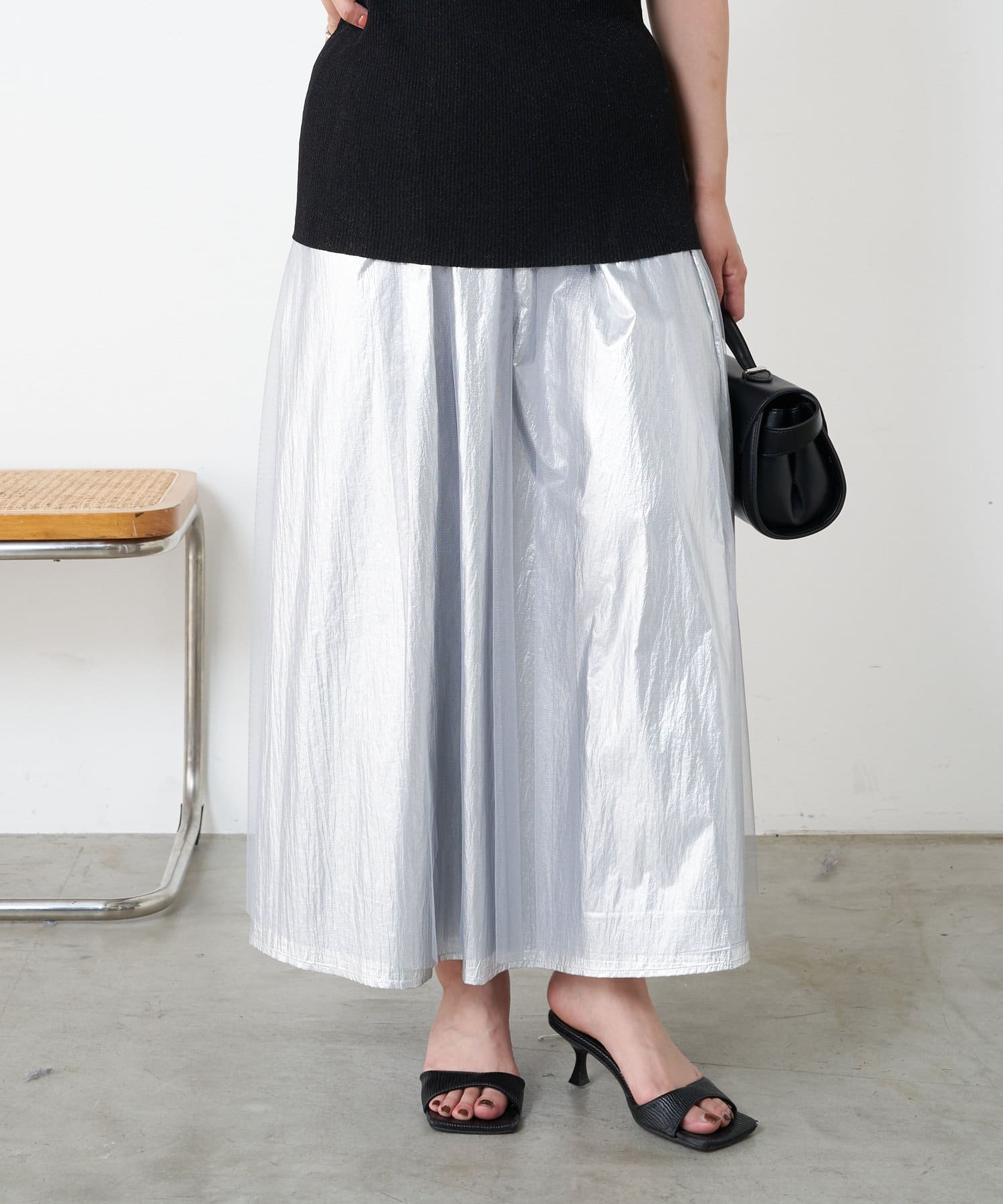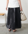 ・キラっと光る表情豊かなメタリック素材と、チュール素材を組み合わせた大人のメタリックスカート。