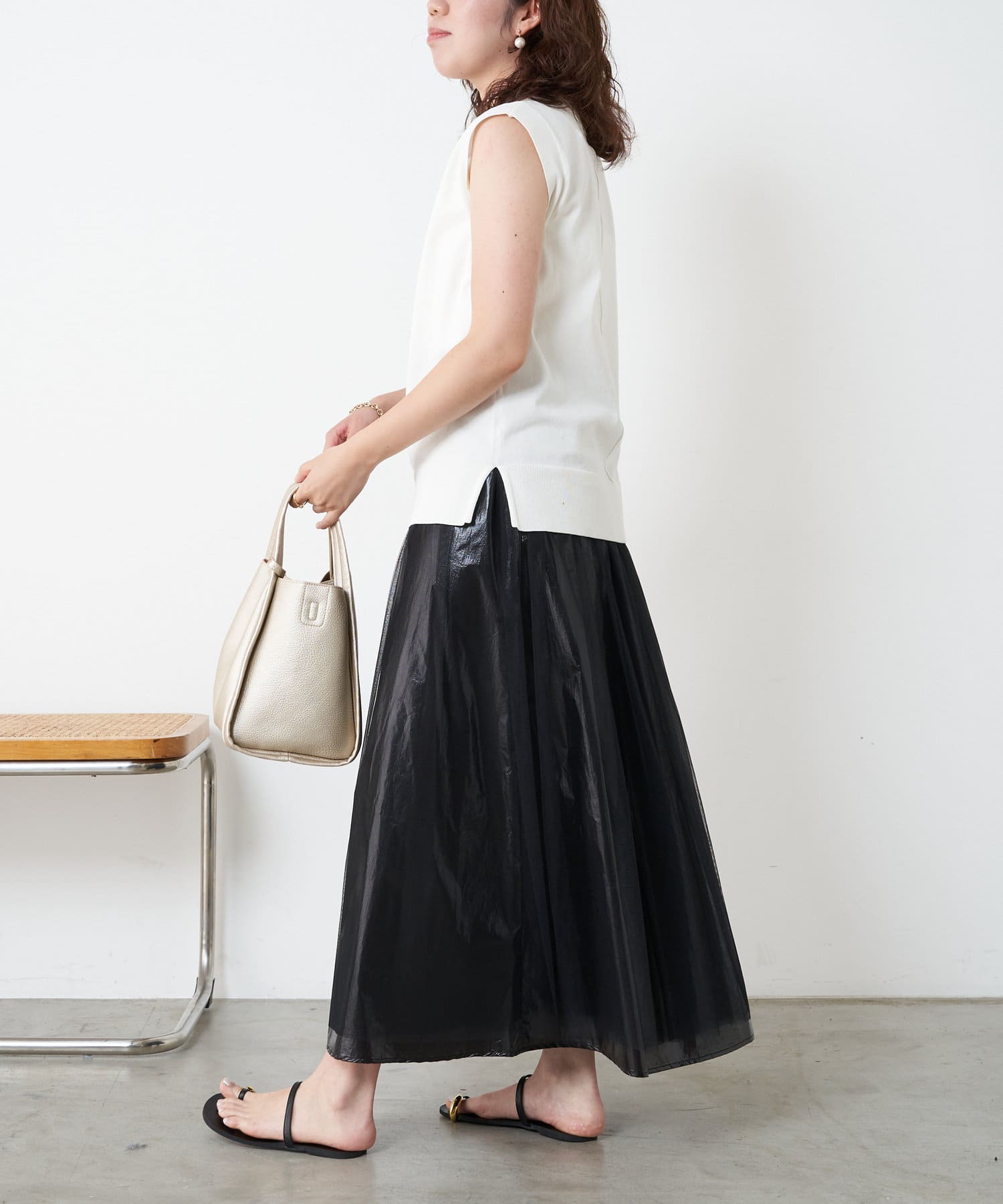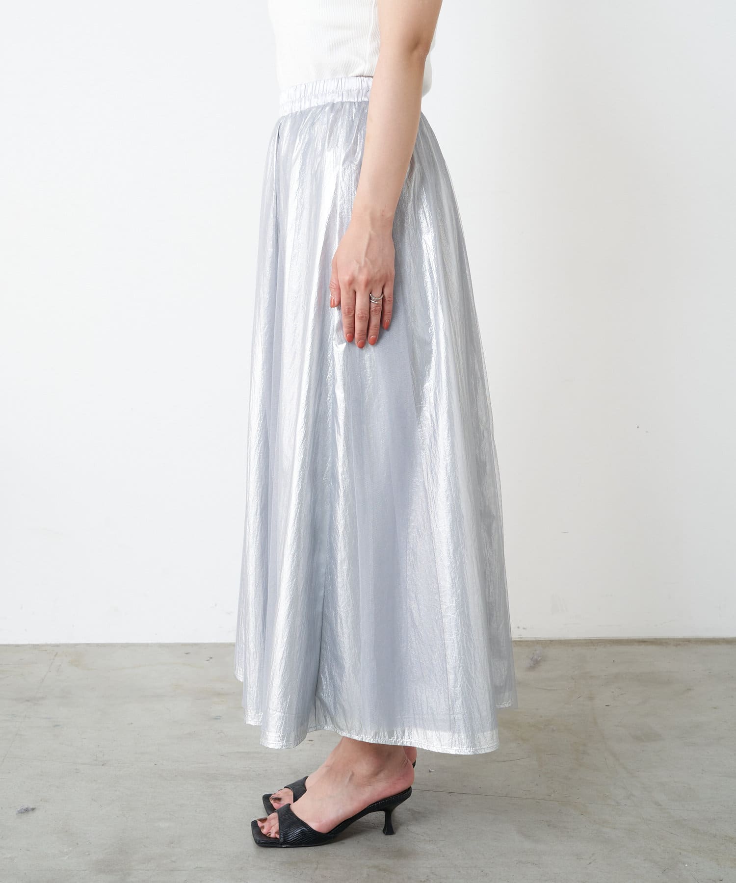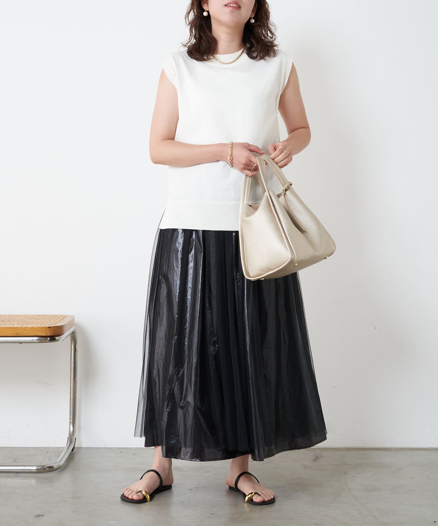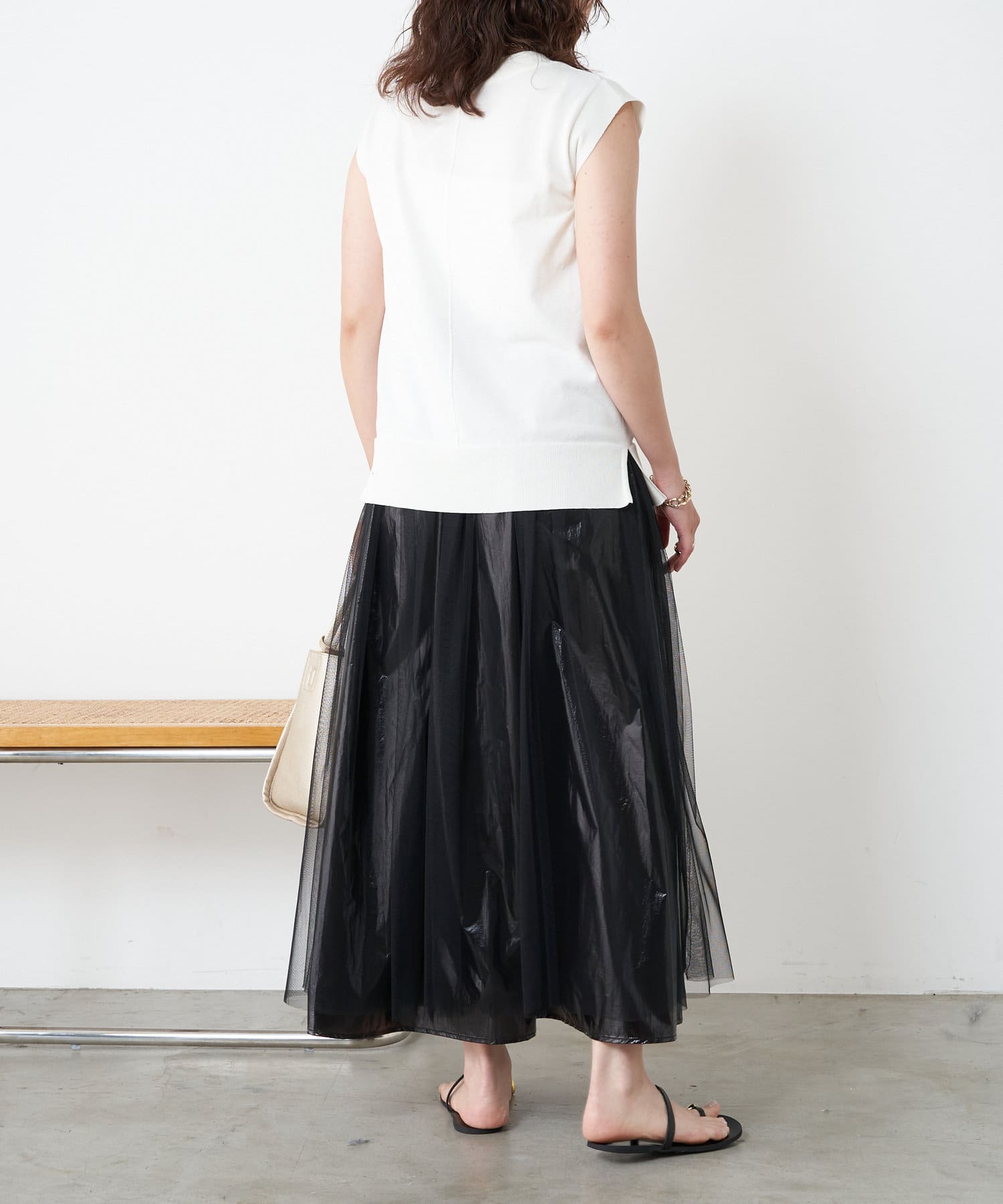・キラっと光る表情豊かなメタリック素材と、チュール素材を組み合わせた大人のメタリックスカート。