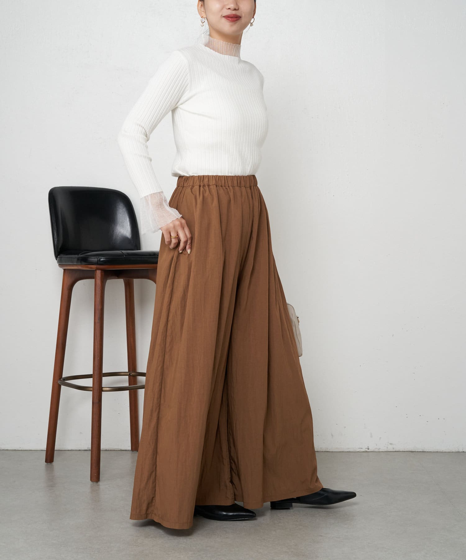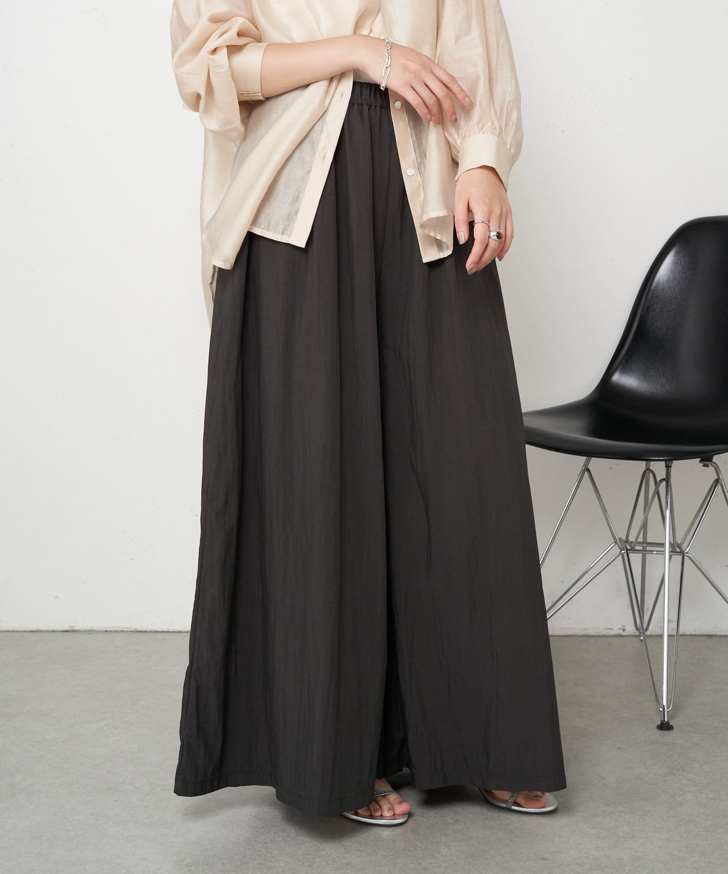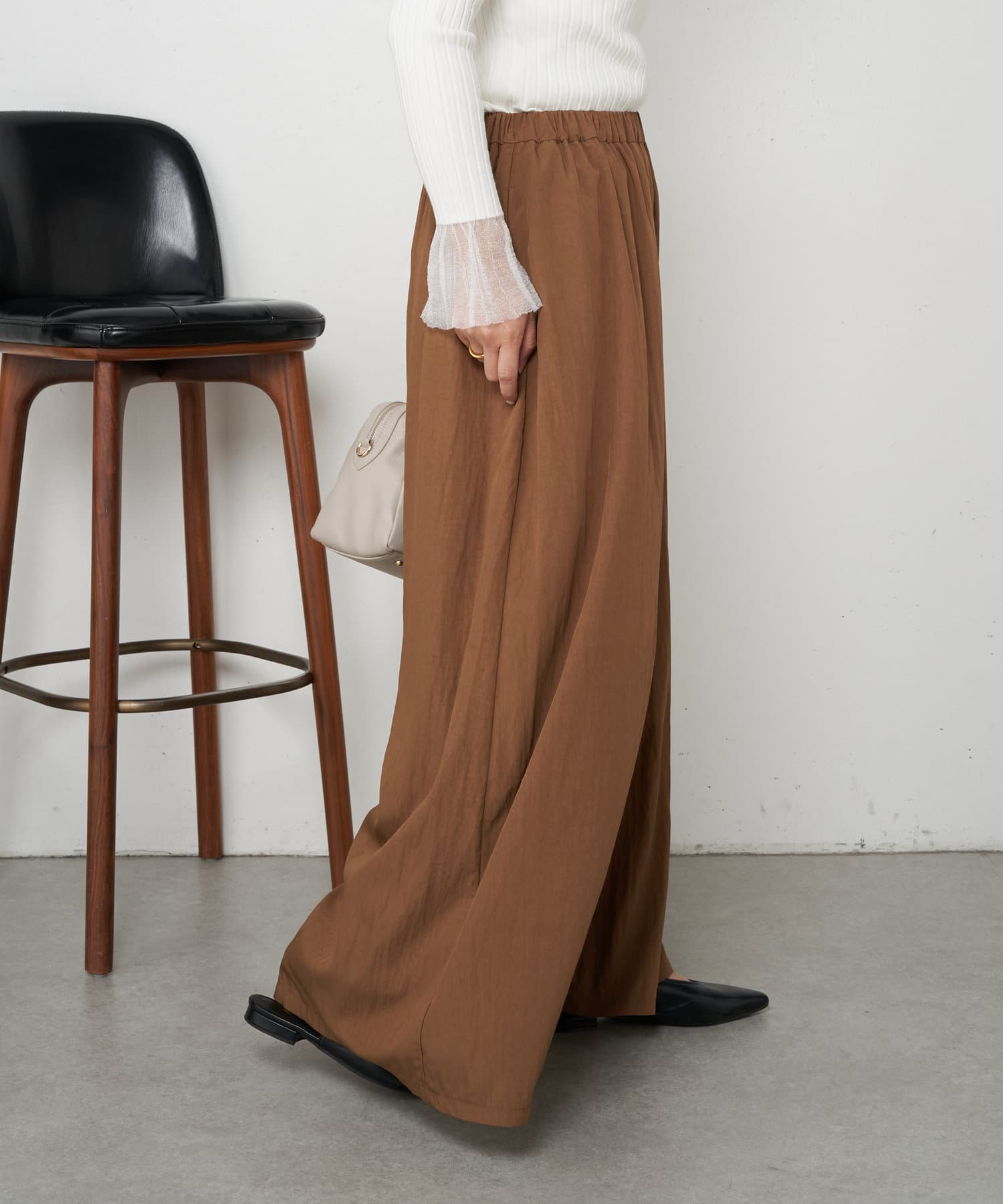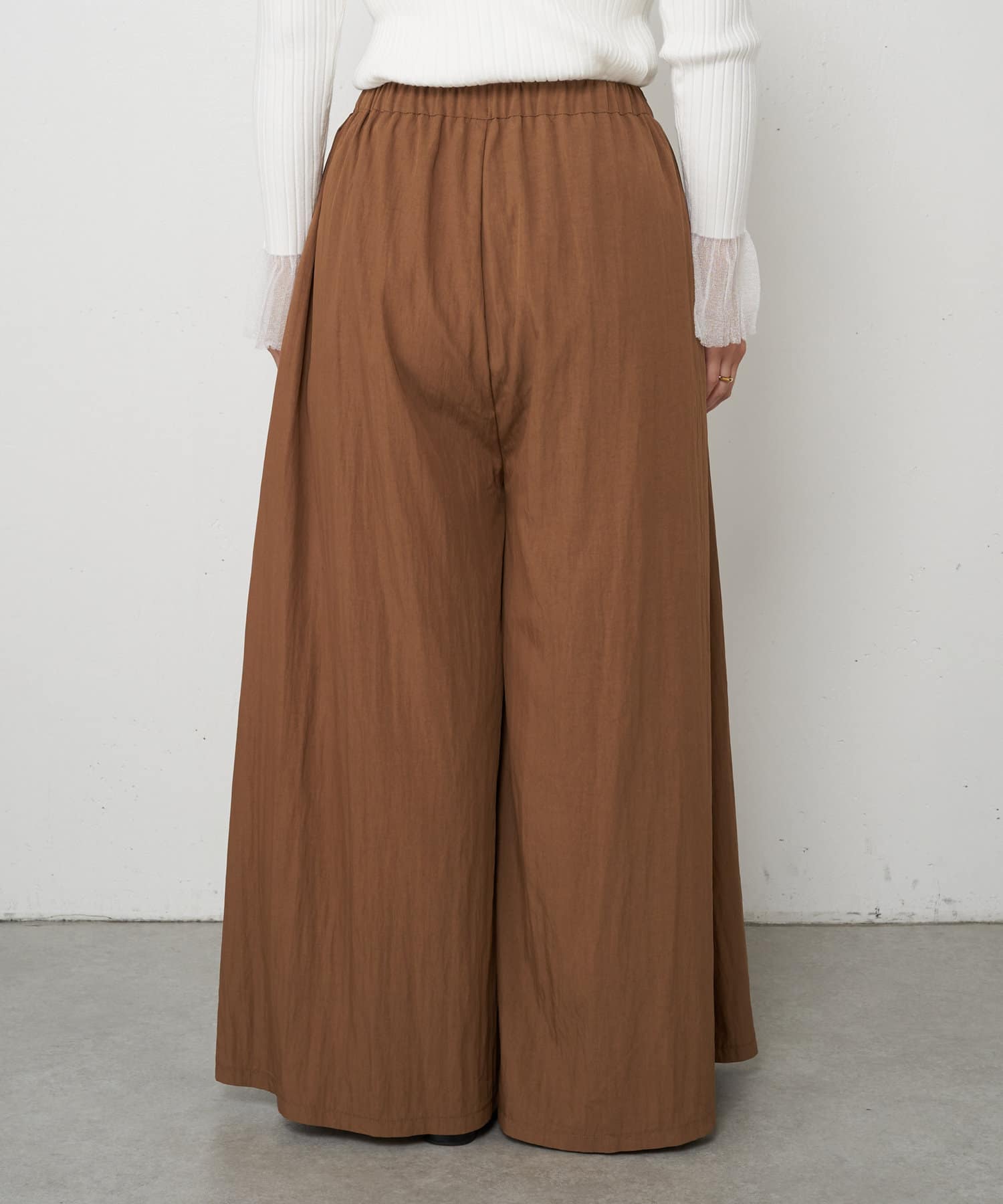 ・シルエットはスカートらしく、艶感がありエレガンスさがありながらも、パンツなので動きやすい。