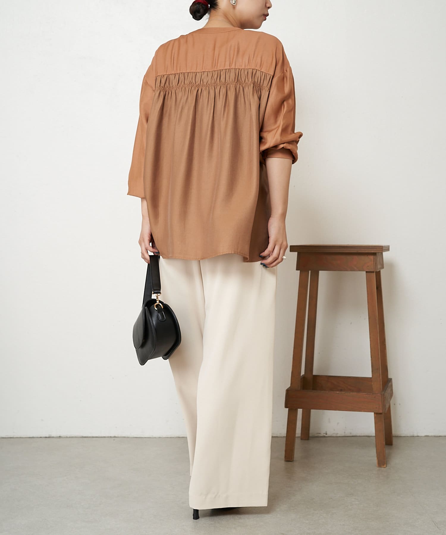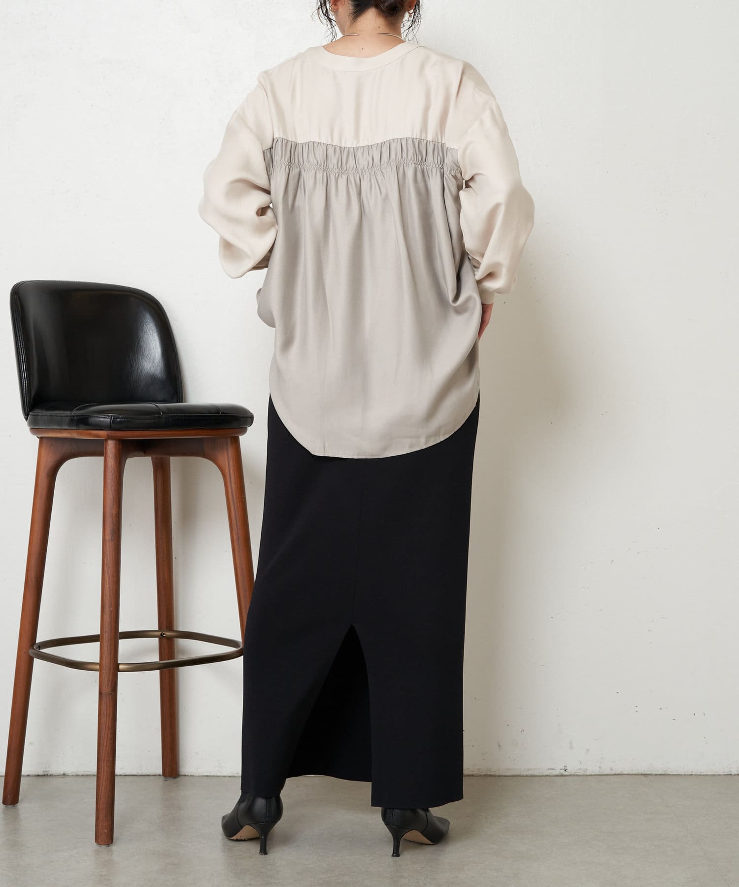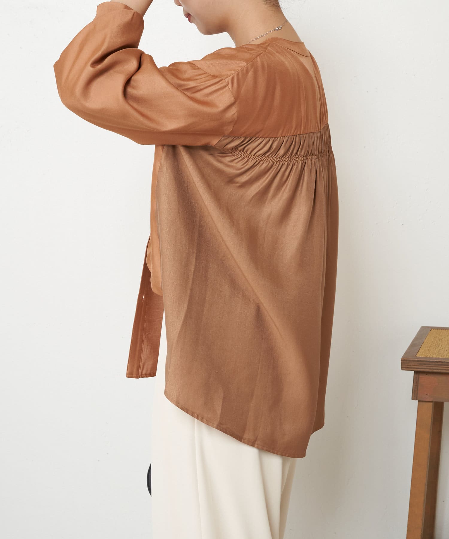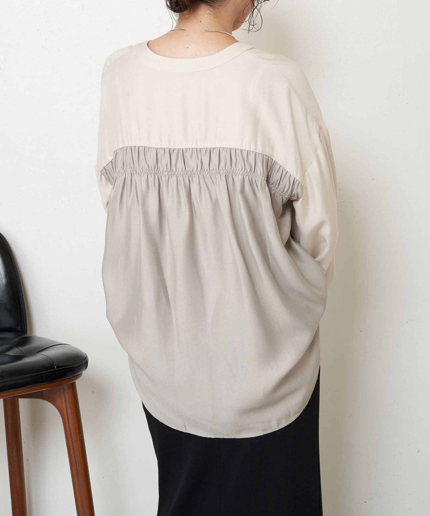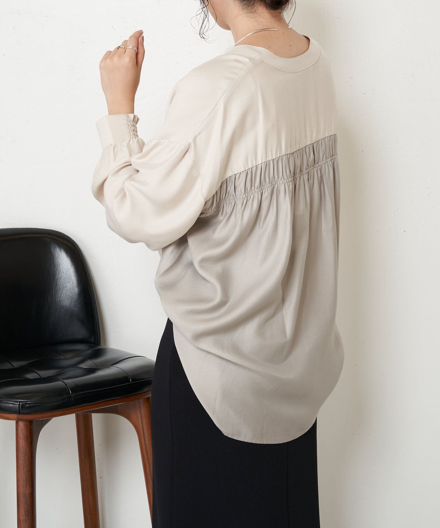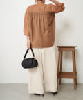 ・バックのシャーリングが目を惹くオトナブラウス。