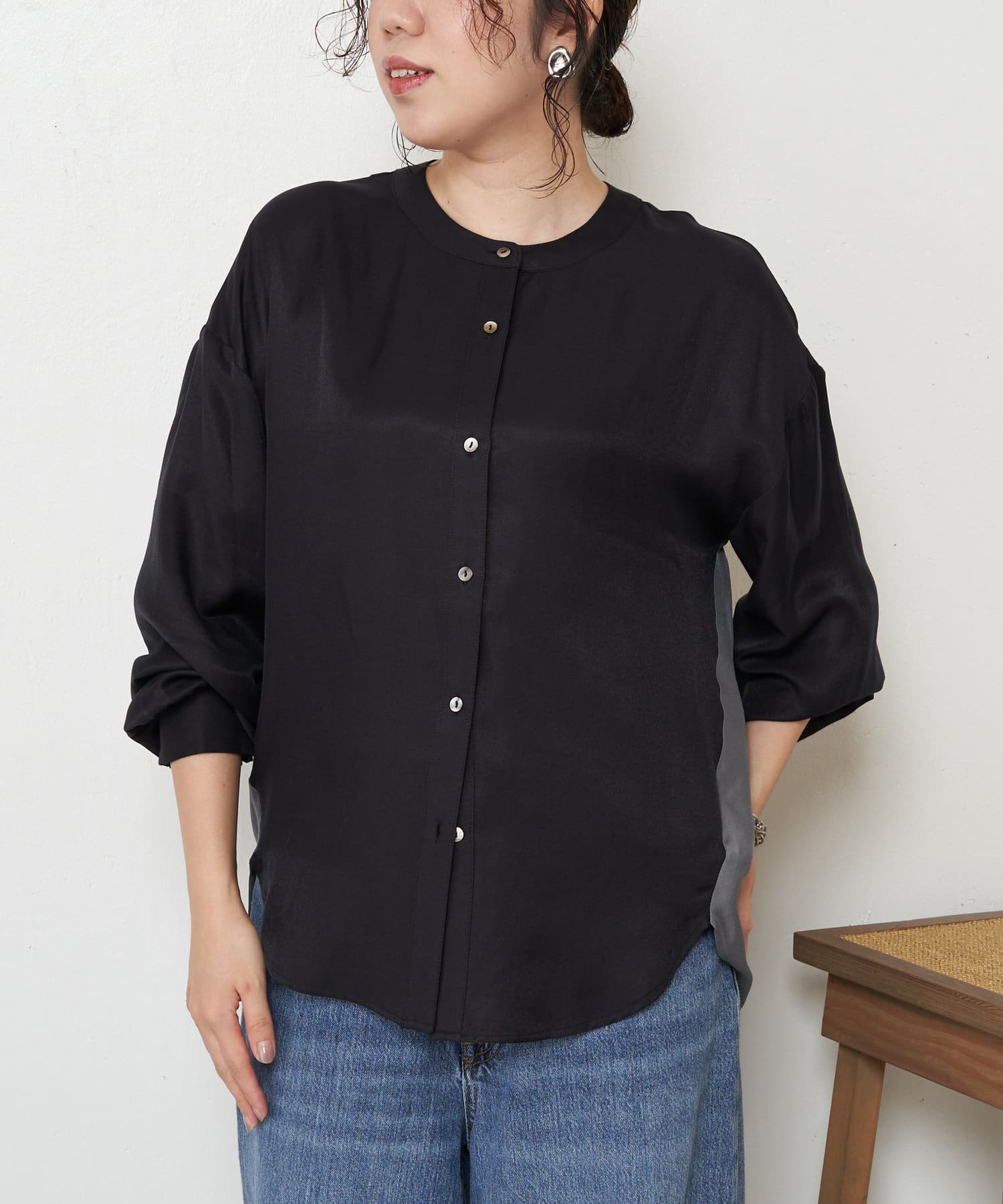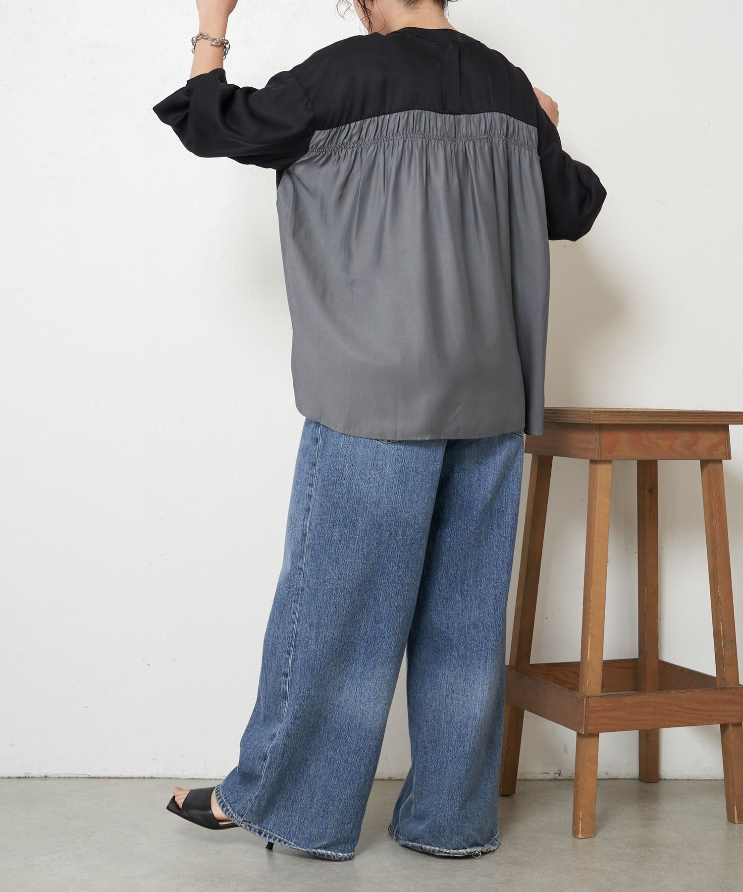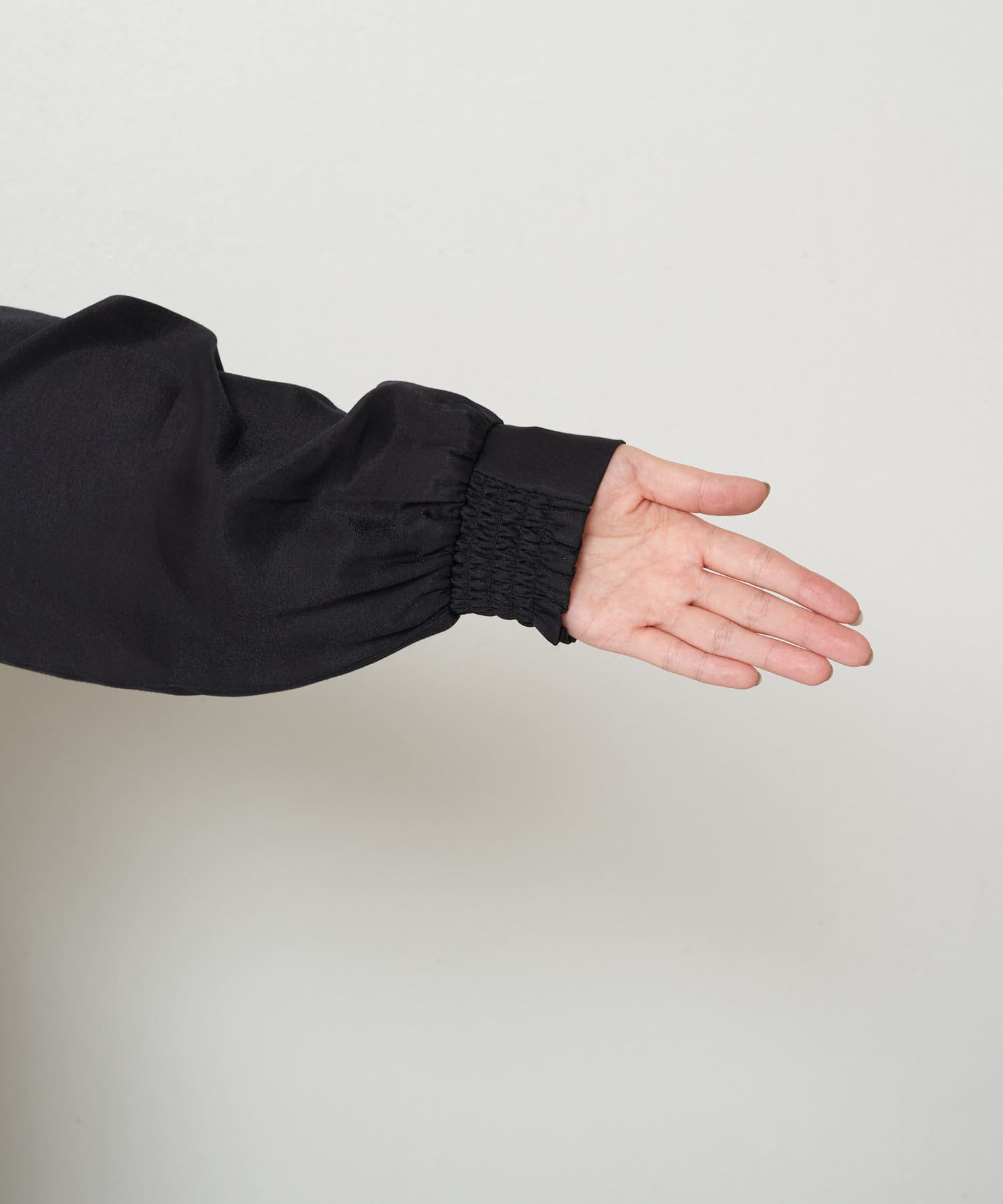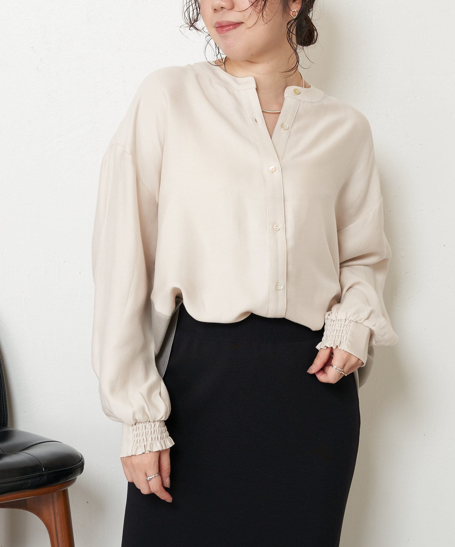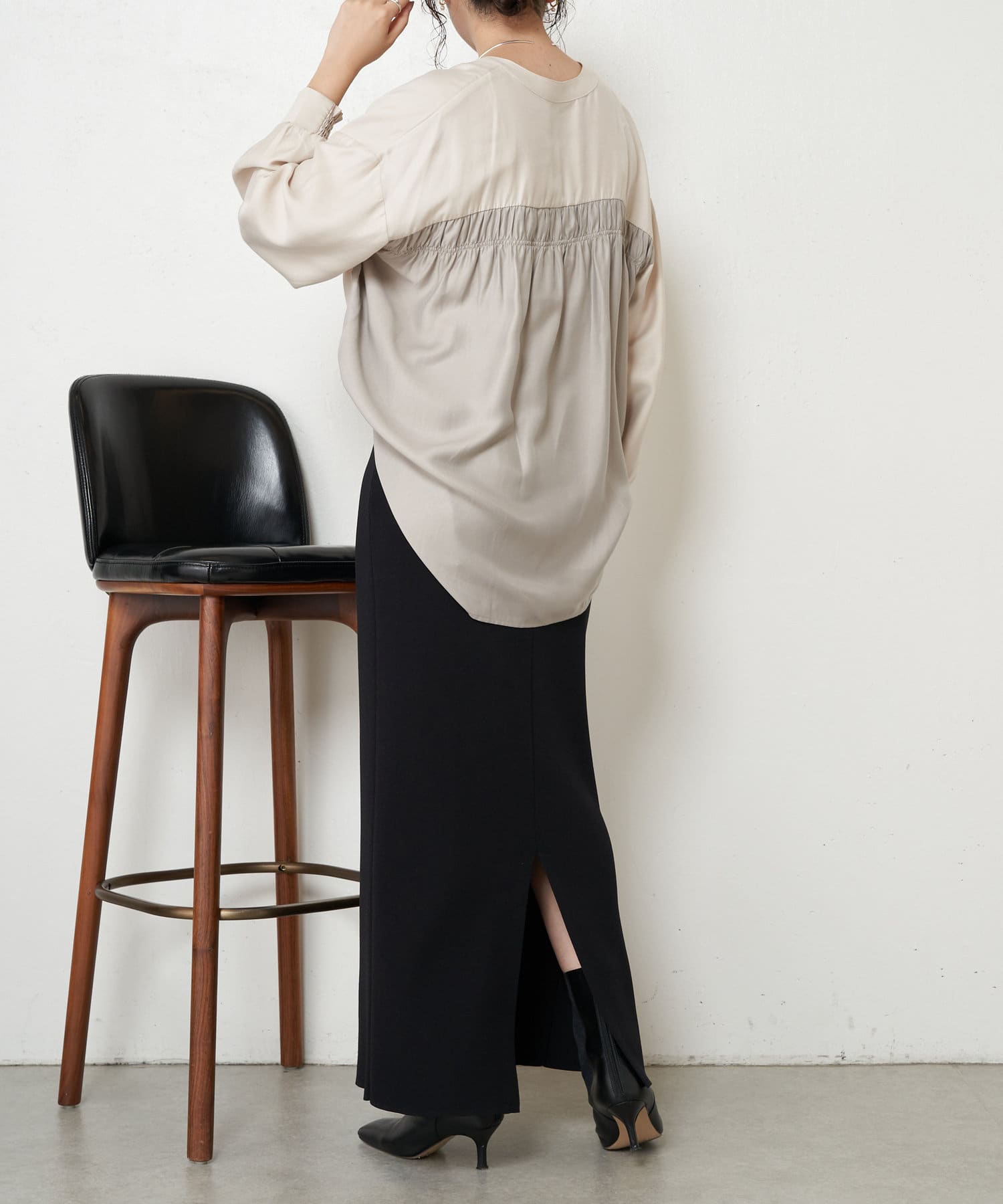 ・バックのシャーリングが目を惹くオトナブラウス。
