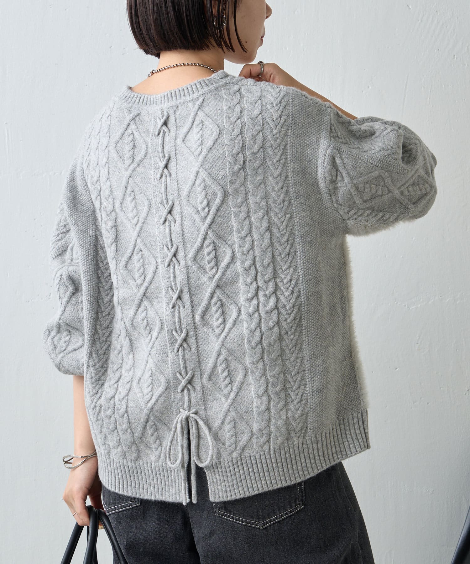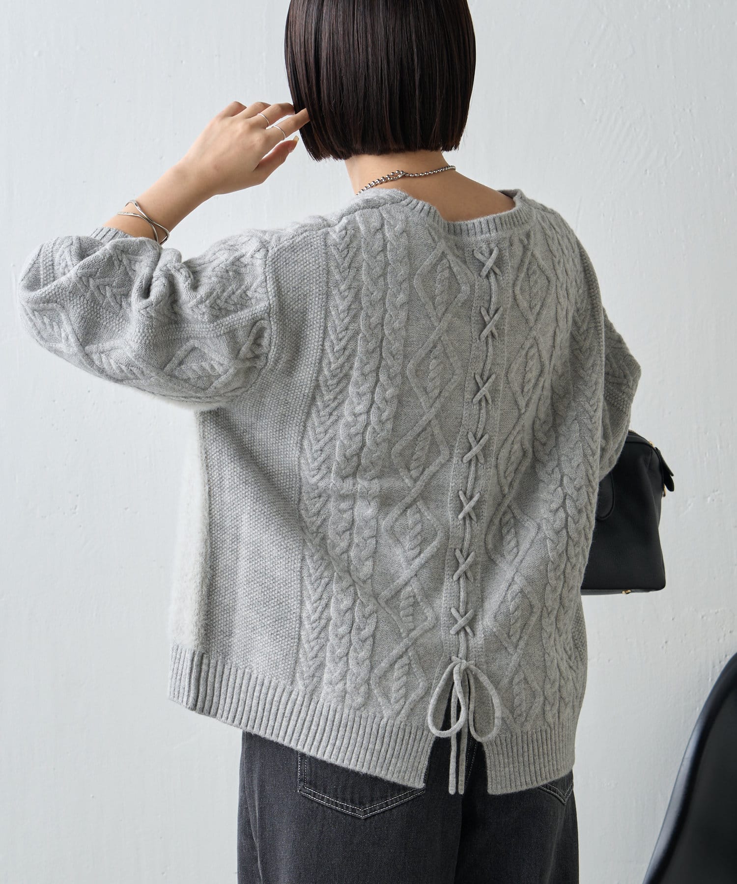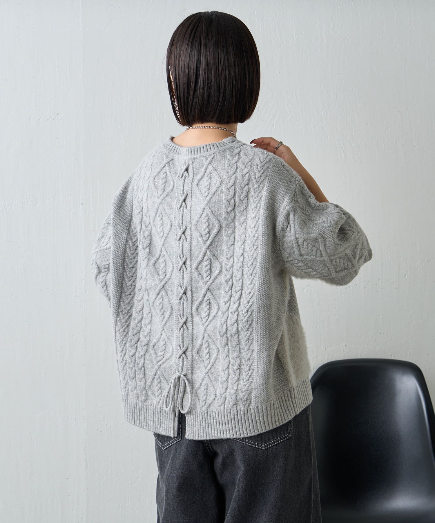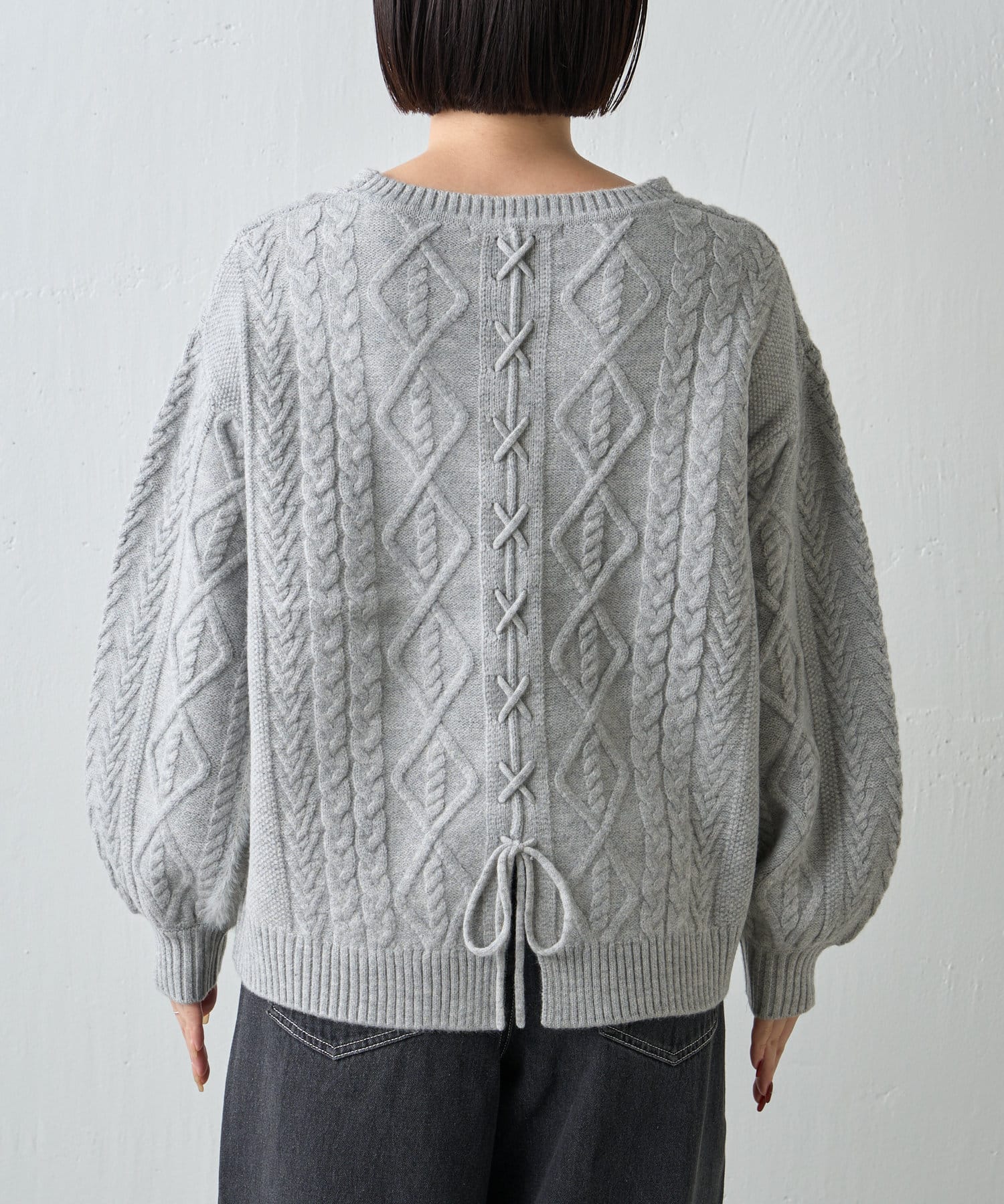 ・バックスタイルまで抜かりなく、トレンドのレースアップがポイントになったニット。
