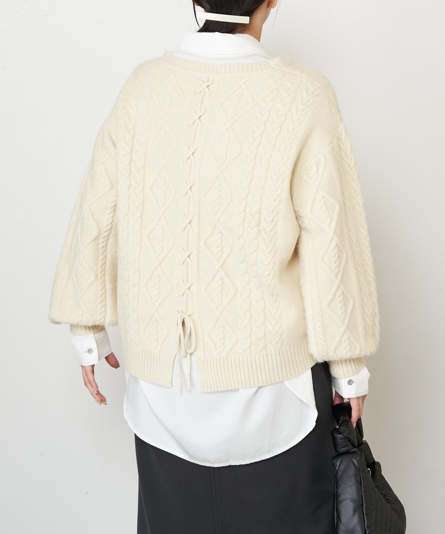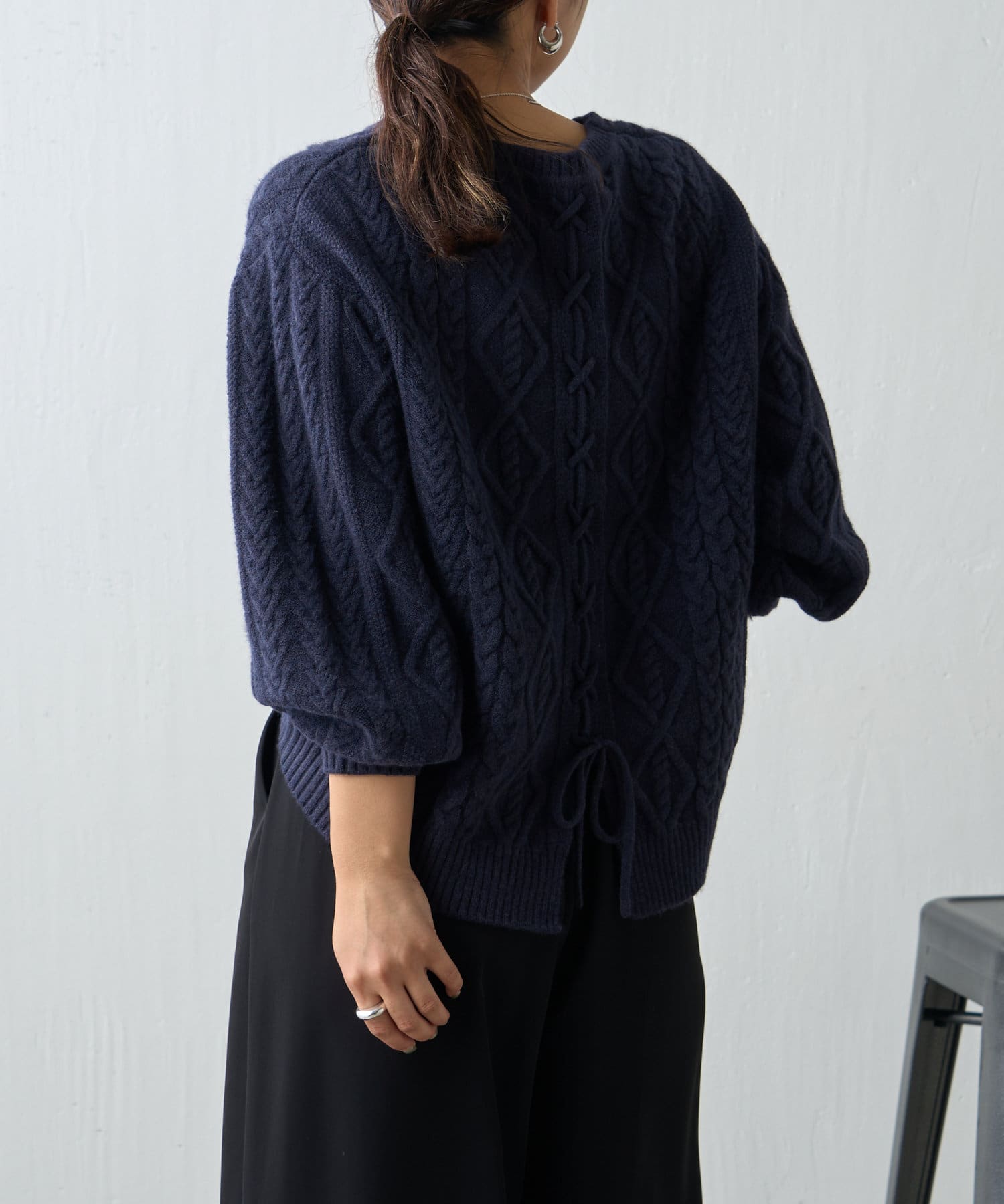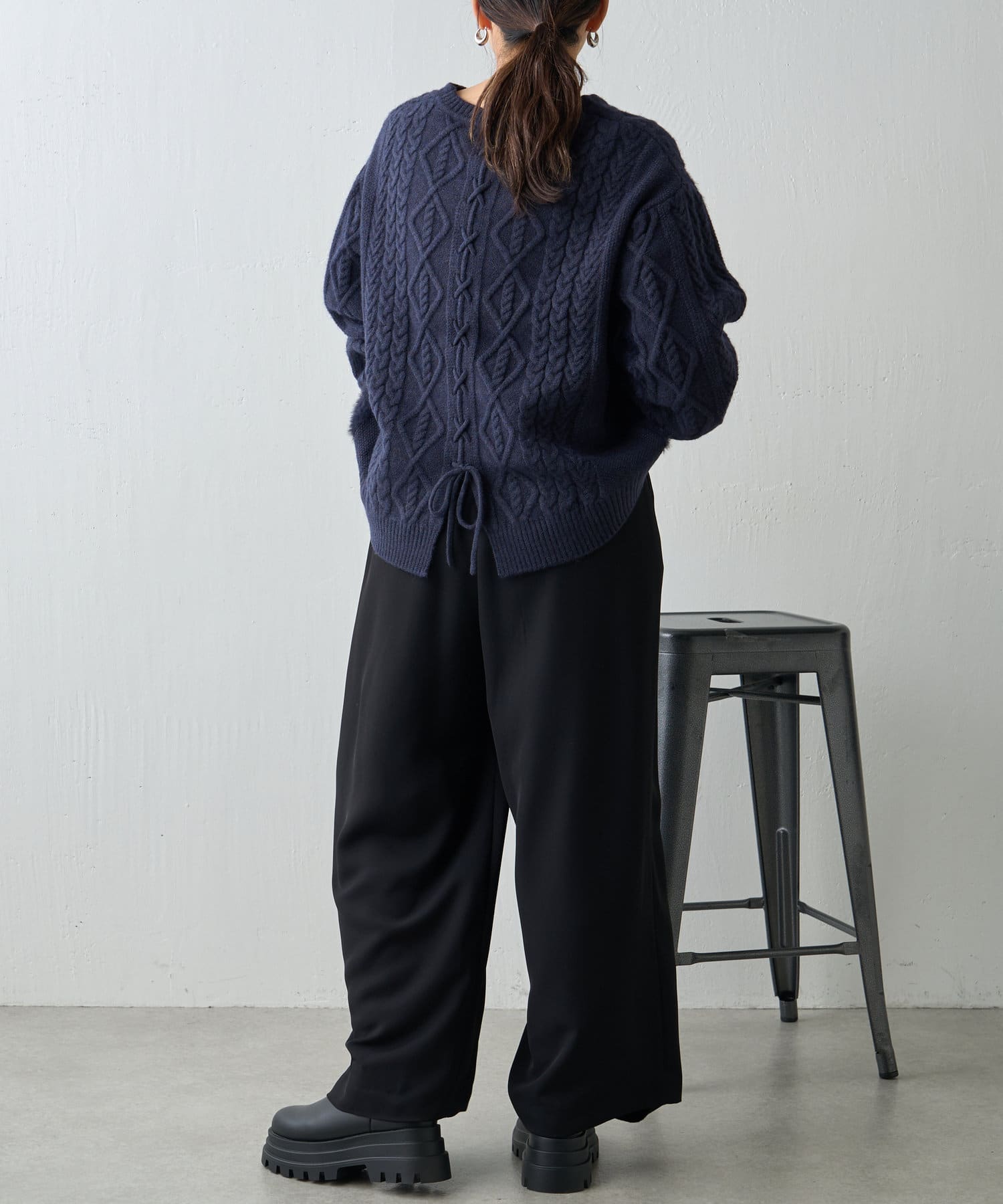 ・バックスタイルまで抜かりなく、トレンドのレースアップがポイントになったニット。
