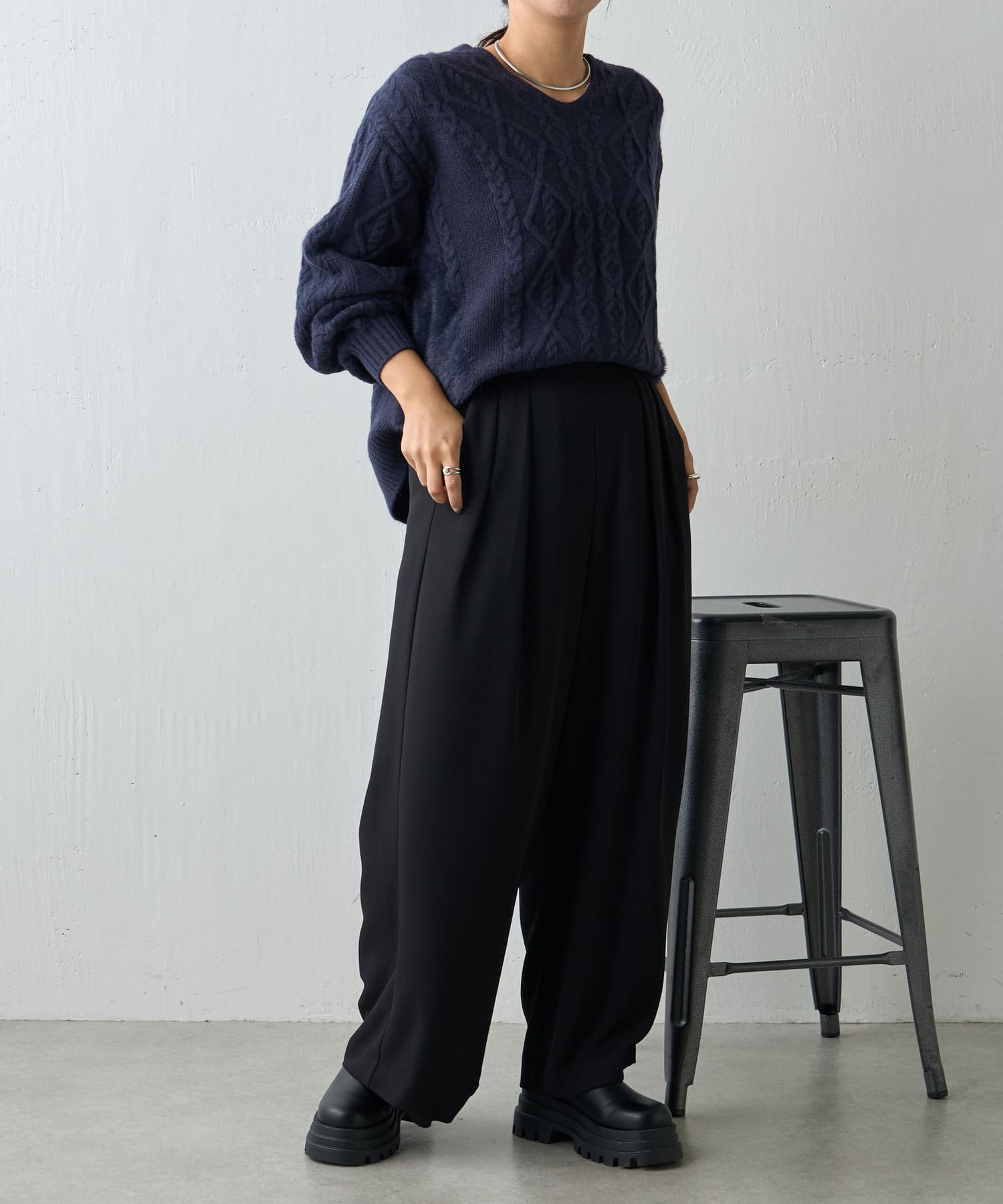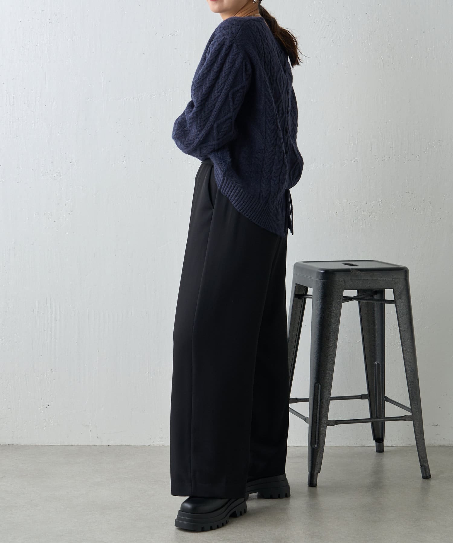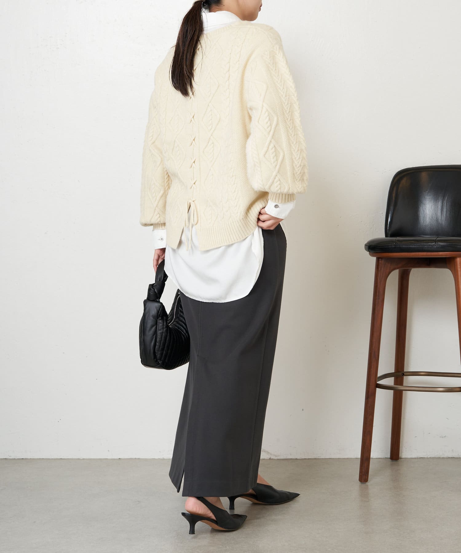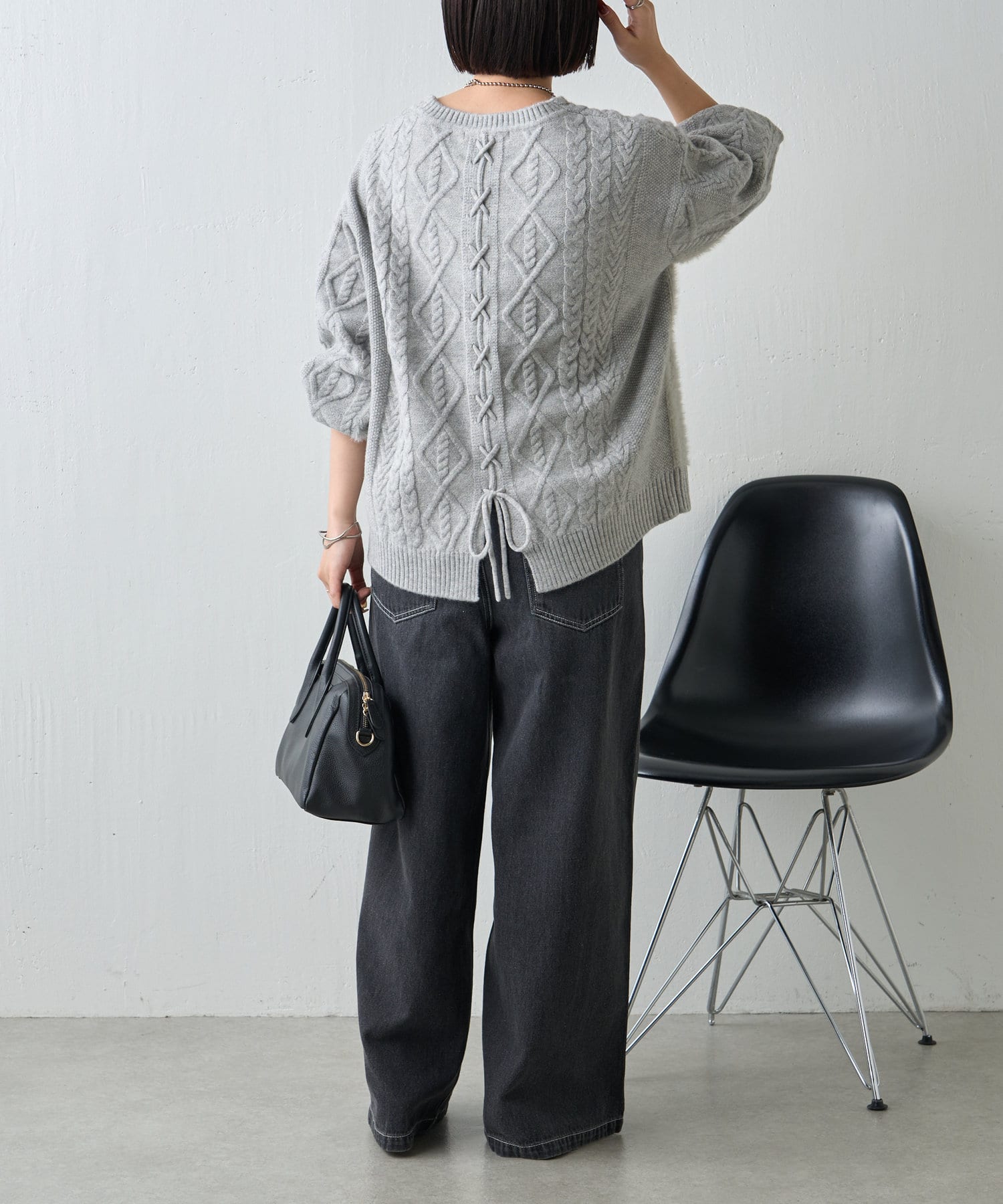 ・バックスタイルまで抜かりなく、トレンドのレースアップがポイントになったニット。