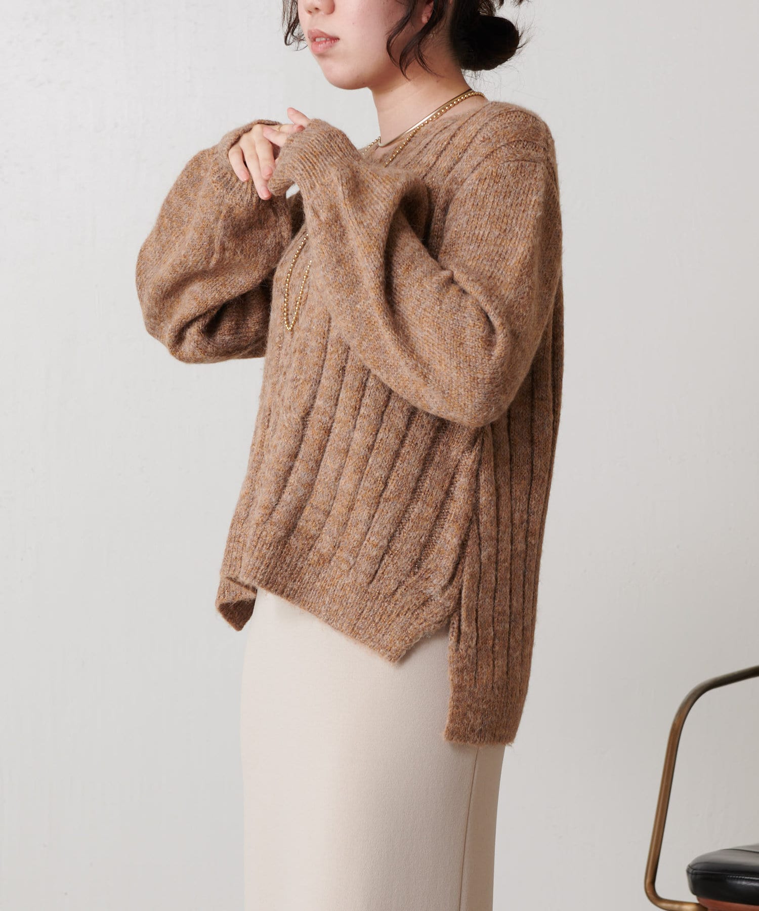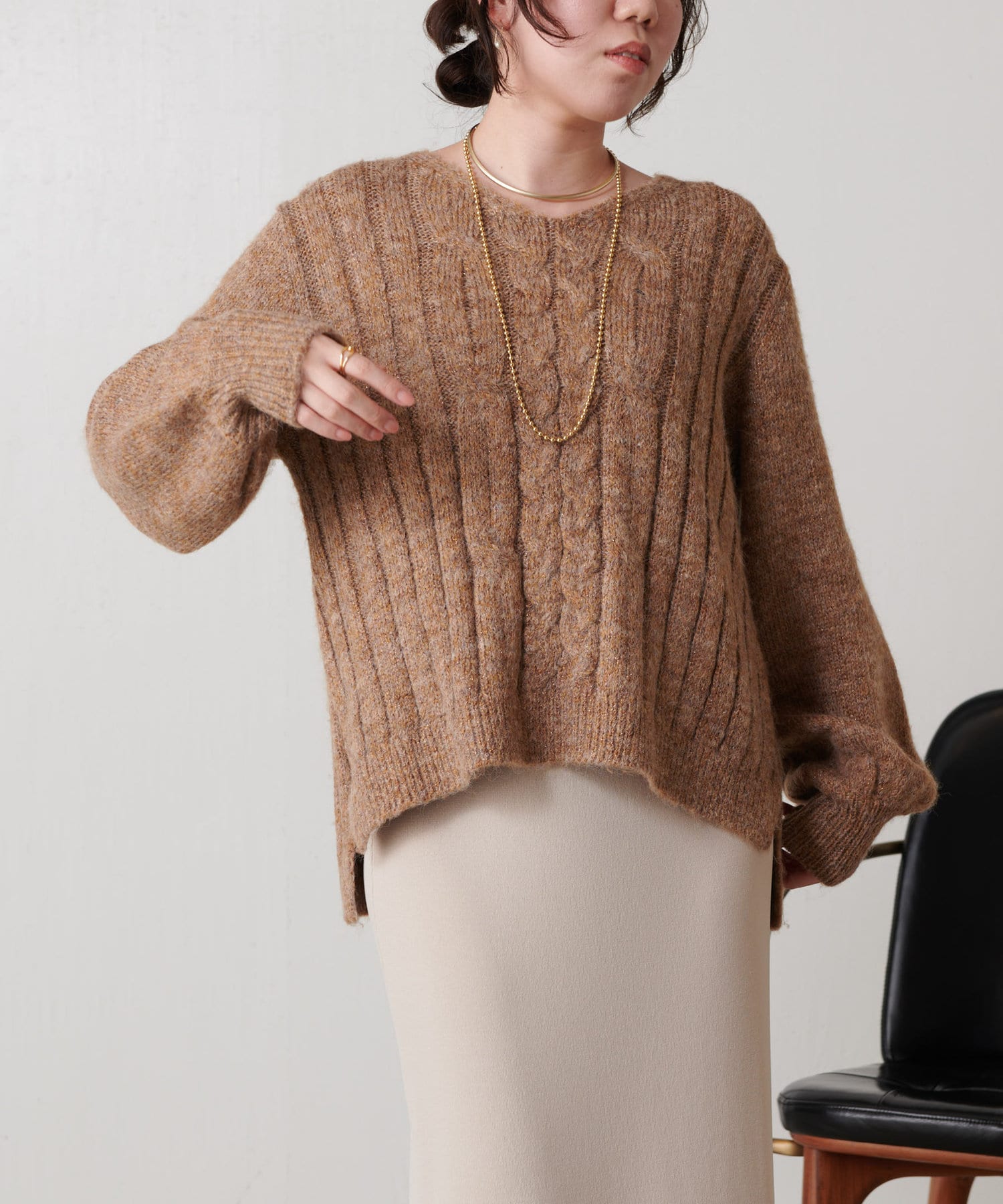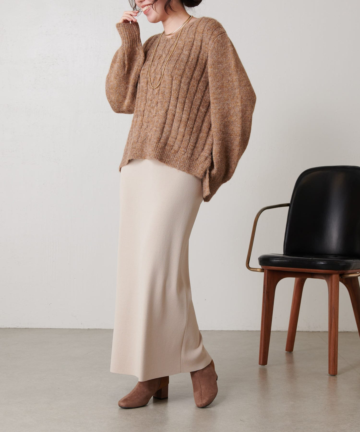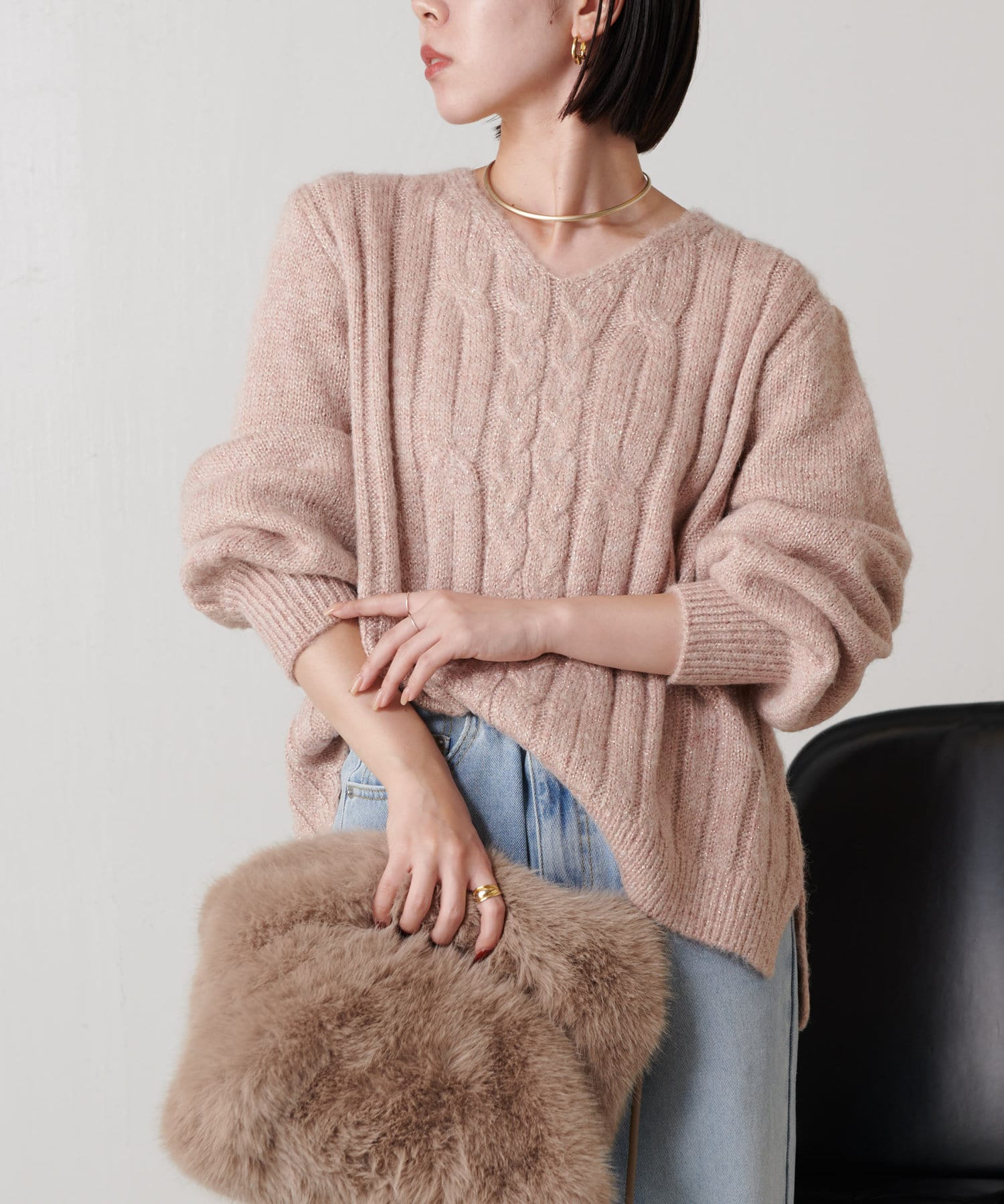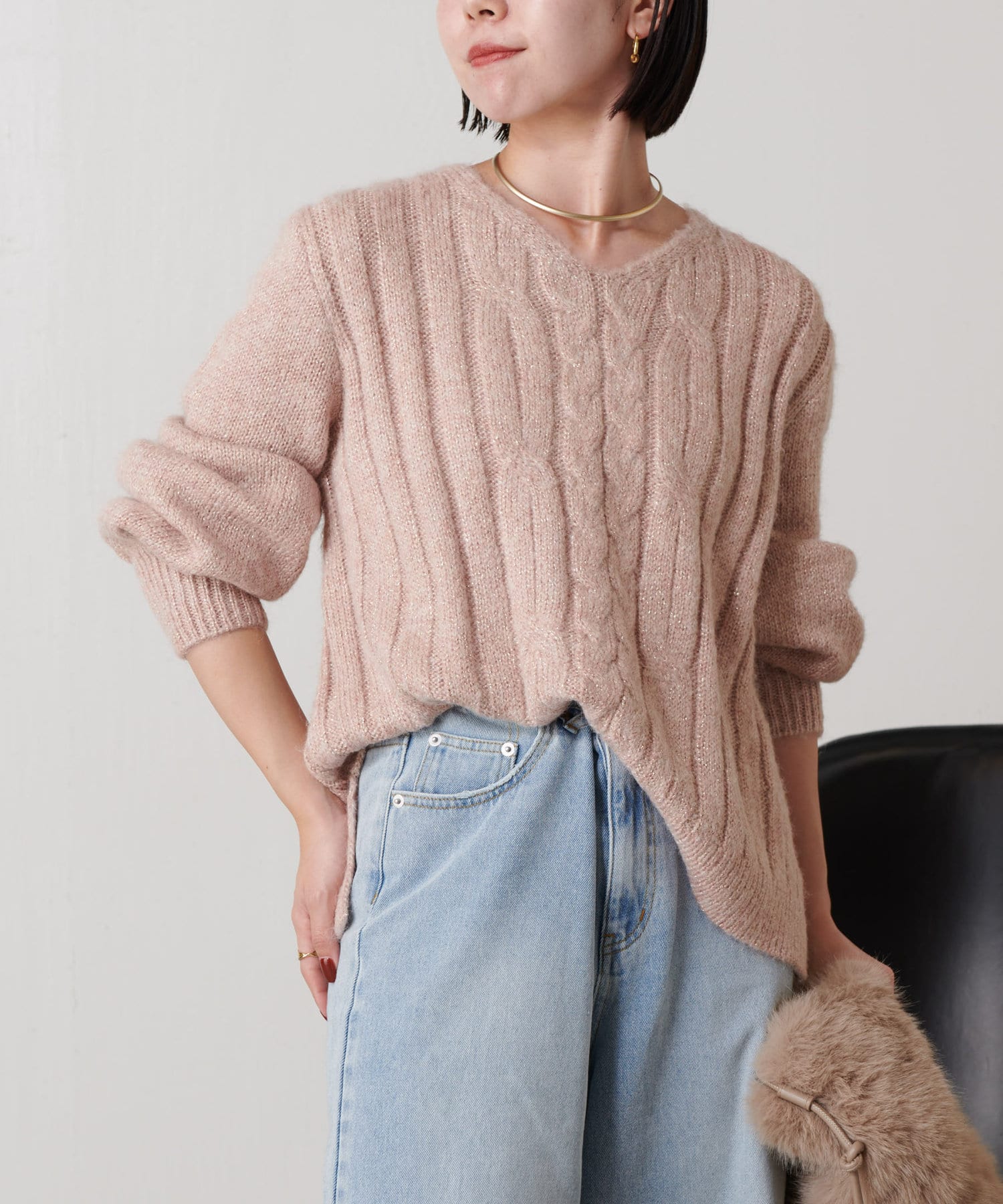 ・ざっくりとした編地と華やかななラメ生地が、カジュアルにもキレイめにも映えるニット。