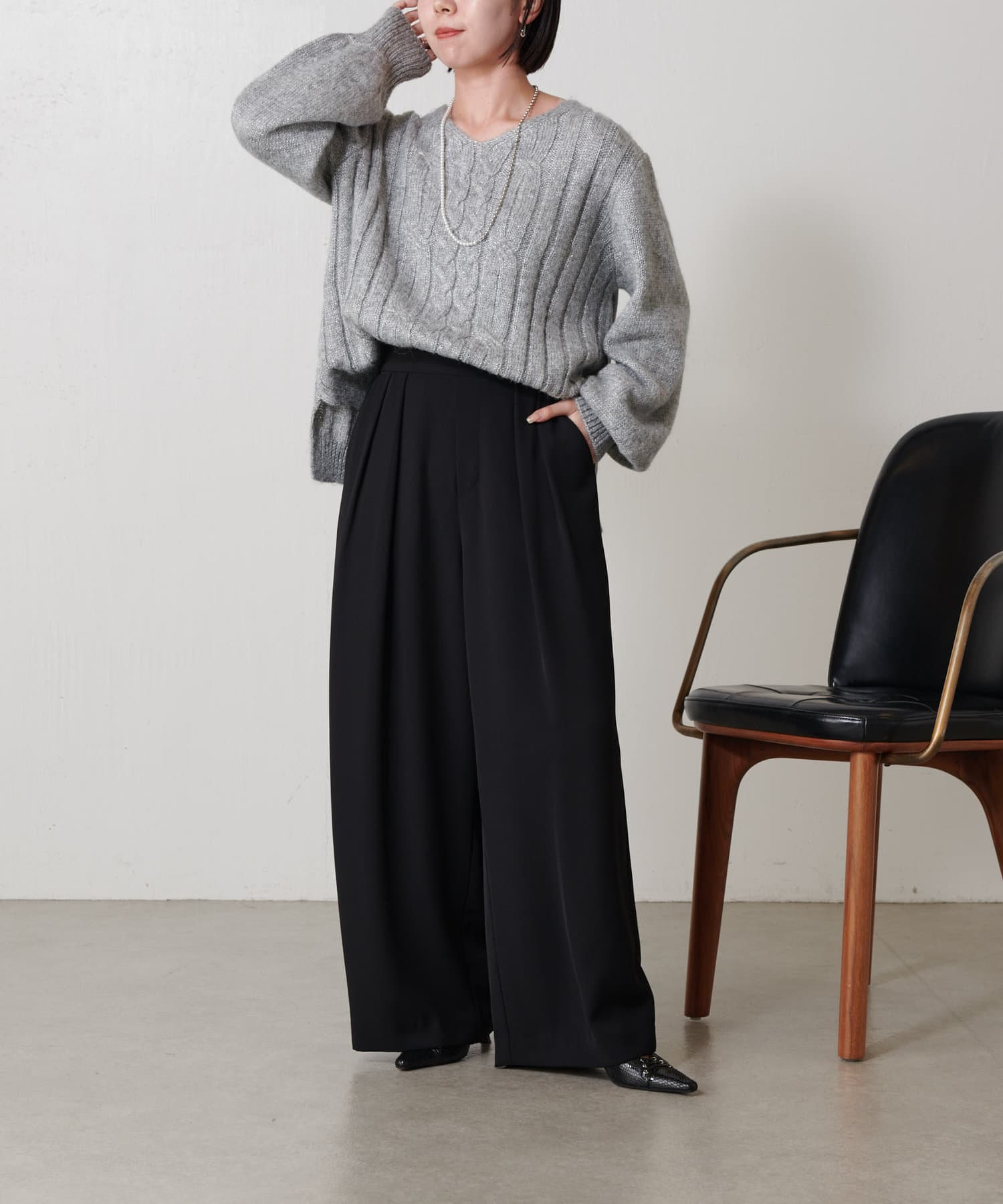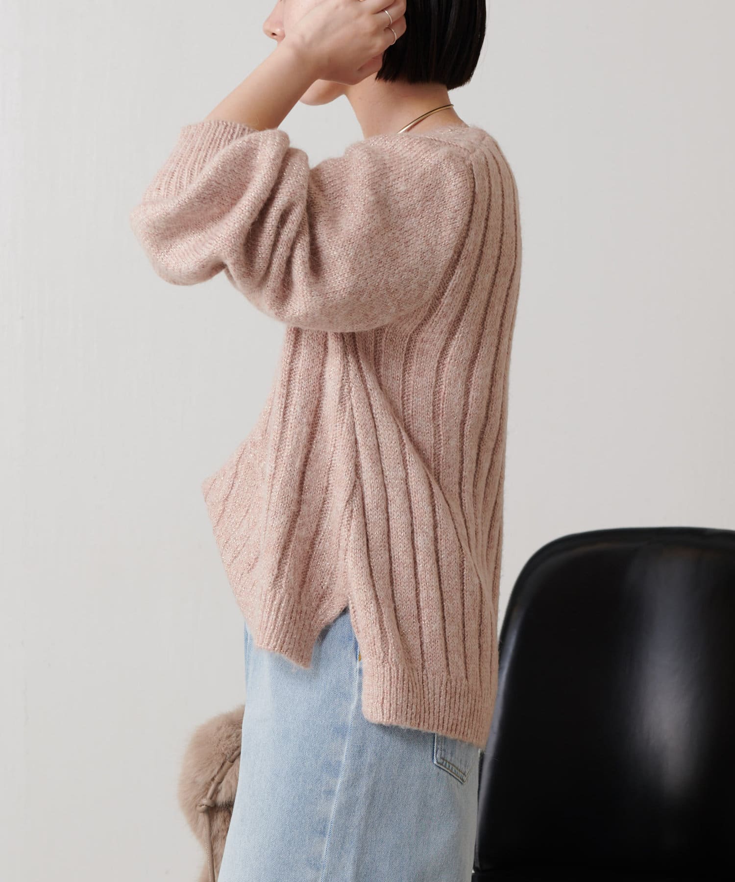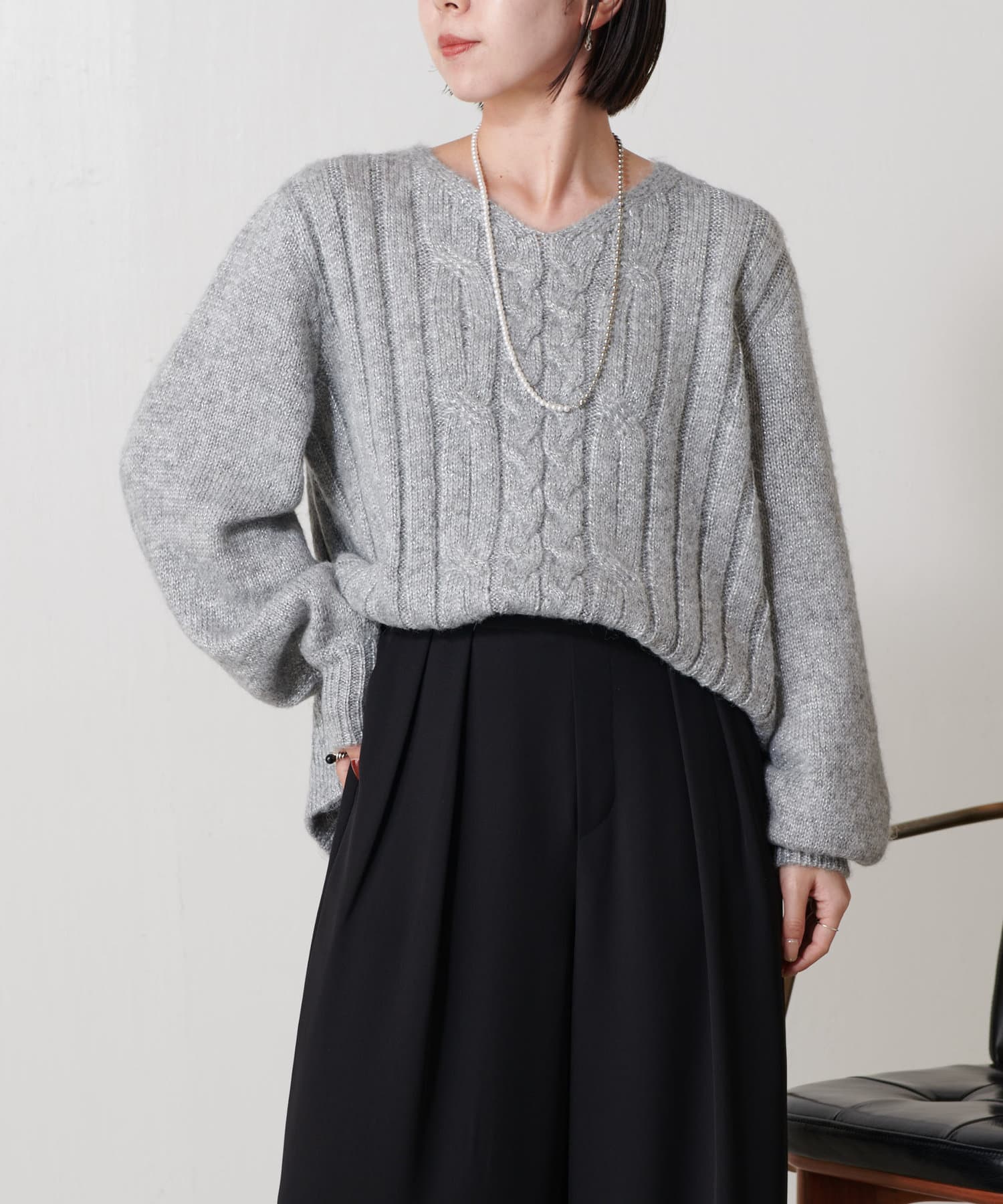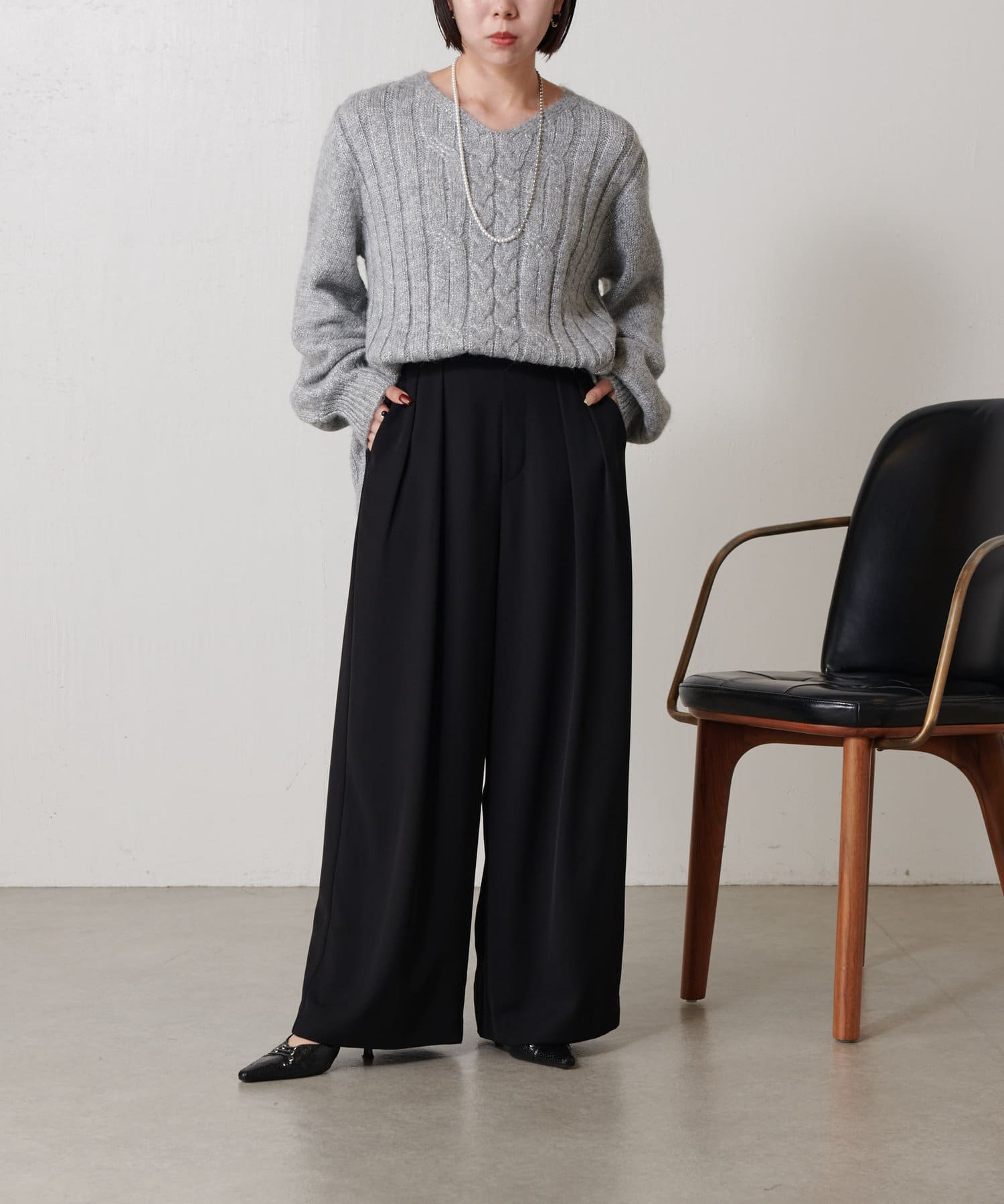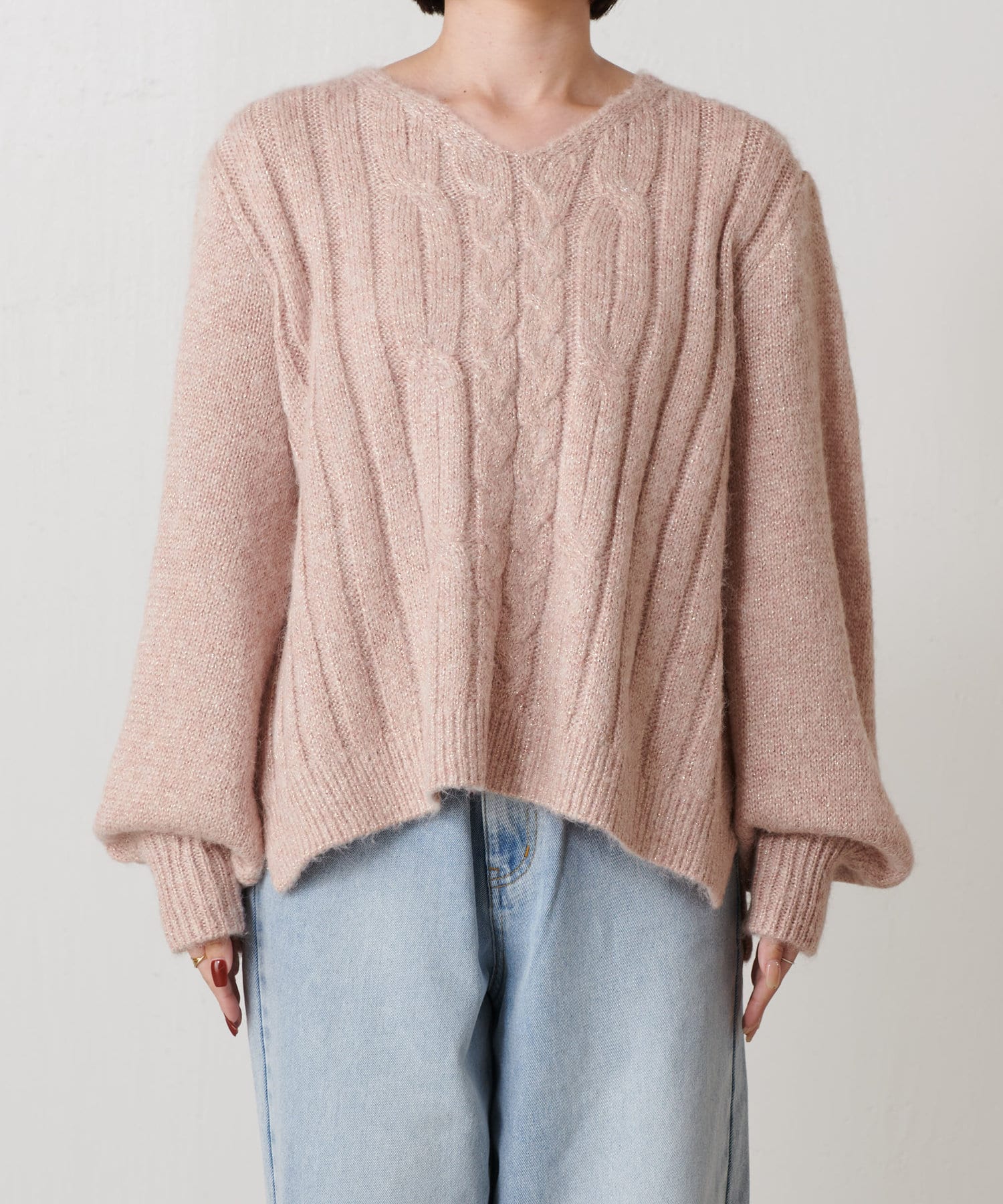 ・ざっくりとした編地と華やかななラメ生地が、カジュアルにもキレイめにも映えるニット。
