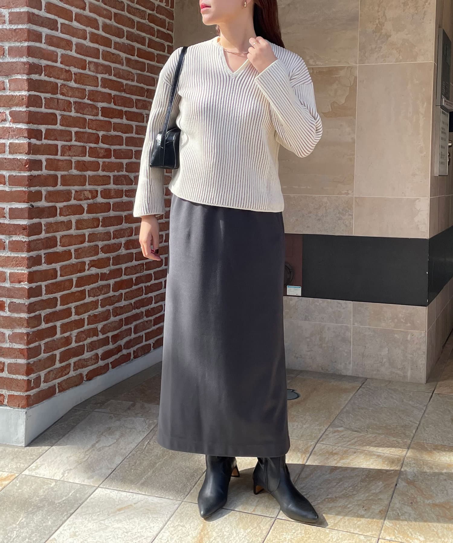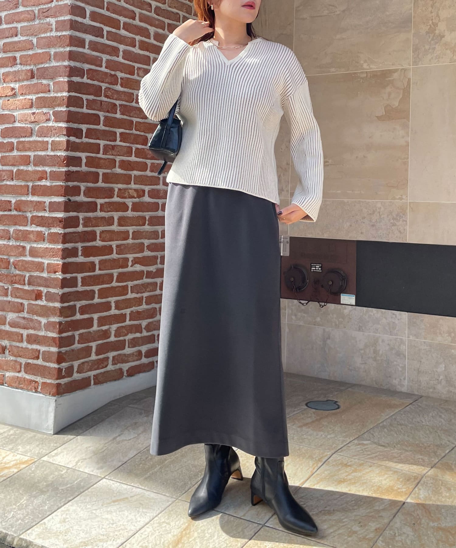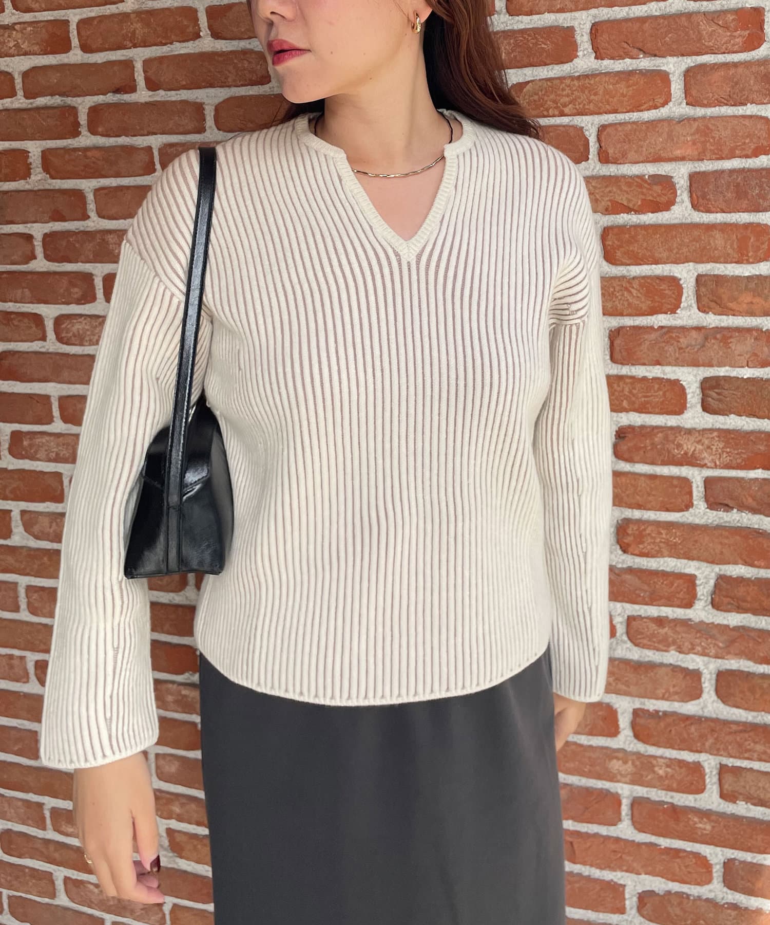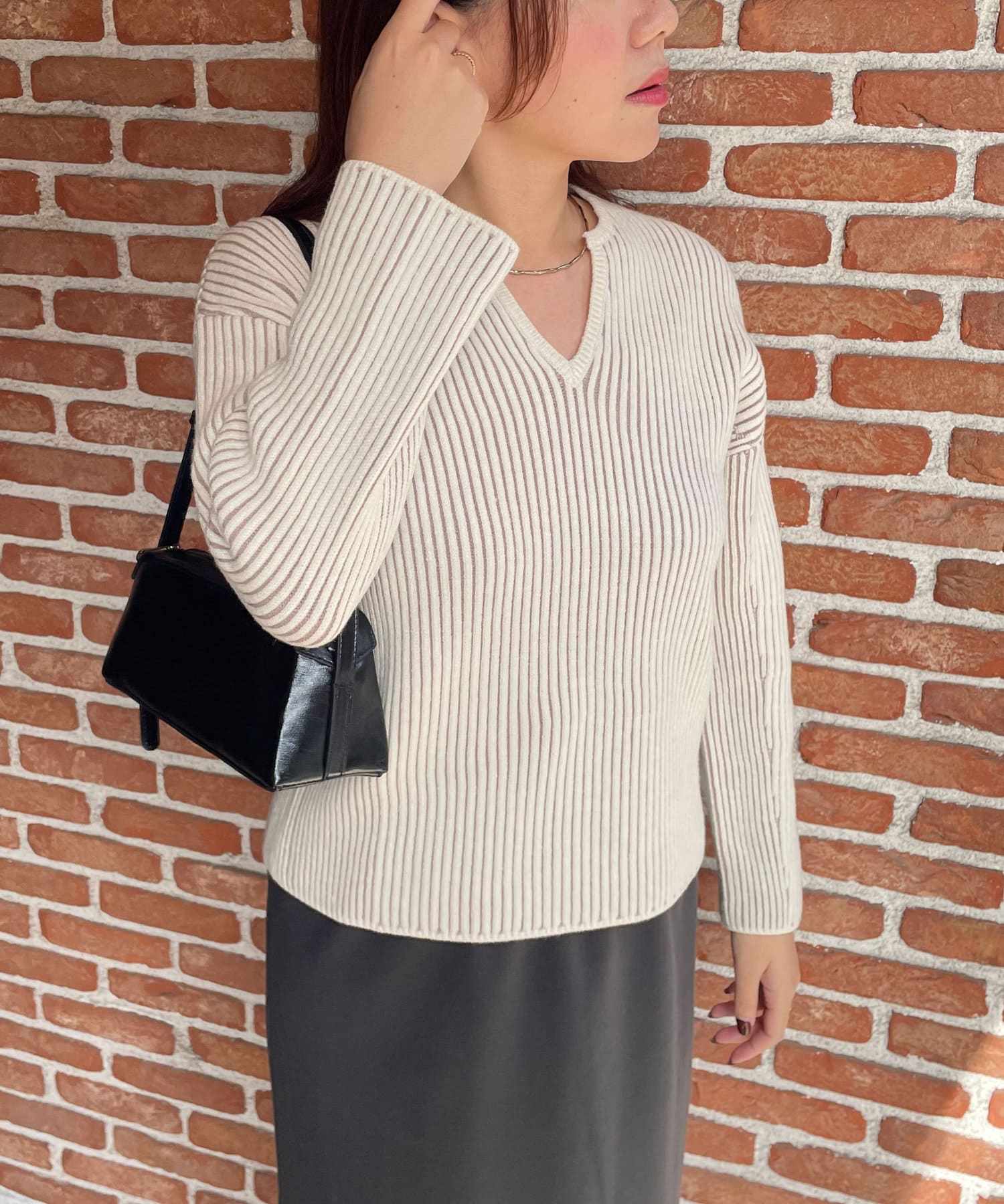 ・深めのVネックがトレンドライクですっきりとした印象に仕上がります。