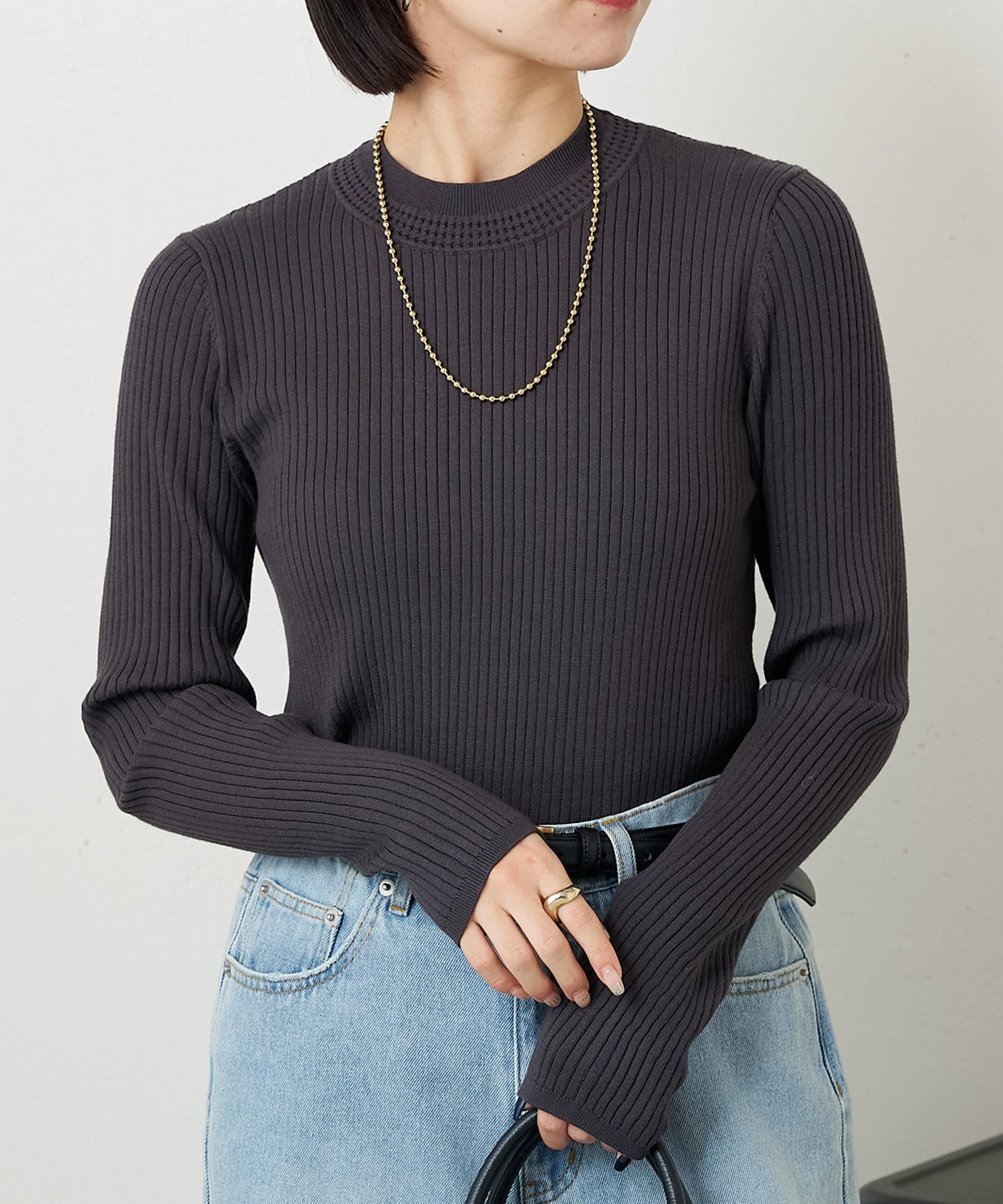 ・スッキリとした首元に仕上げたモックネックデザイン。