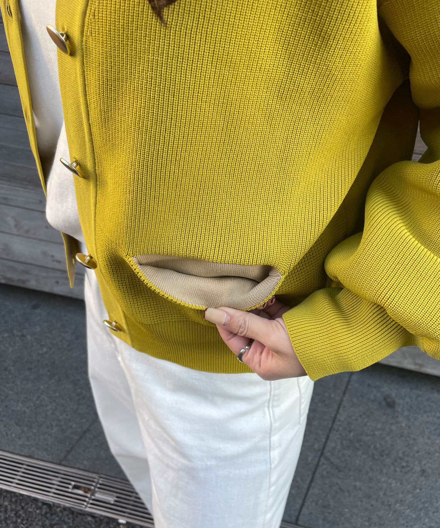 ・フロントのミニポケットがオトナ可愛いポイントに。ちらっと見える配色遣いが◎