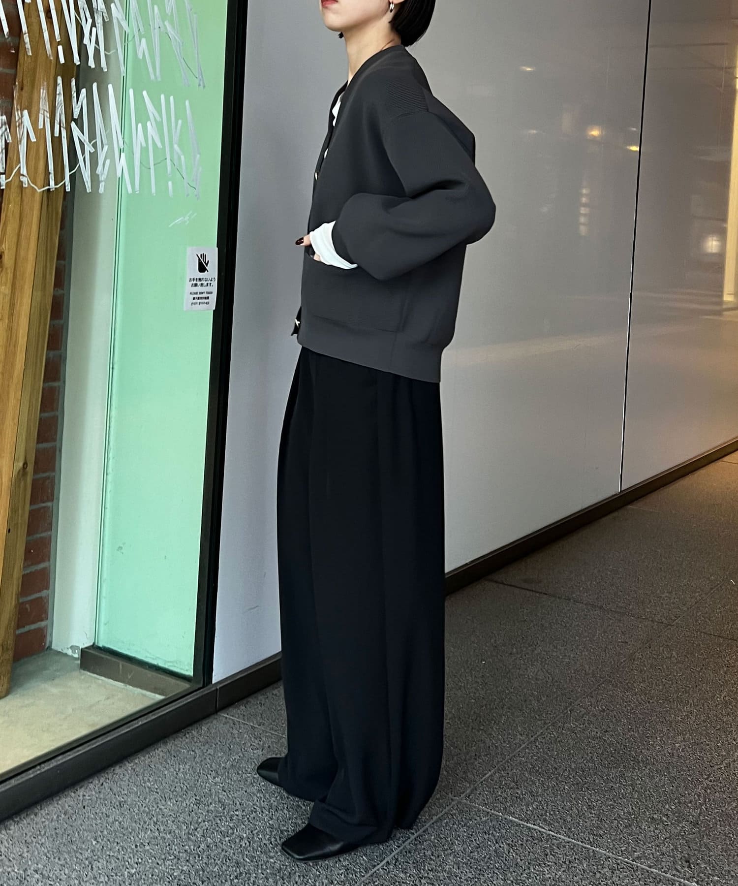 ・ノーカラーで顔周りをすっきりした印象に仕上げてくれます。
