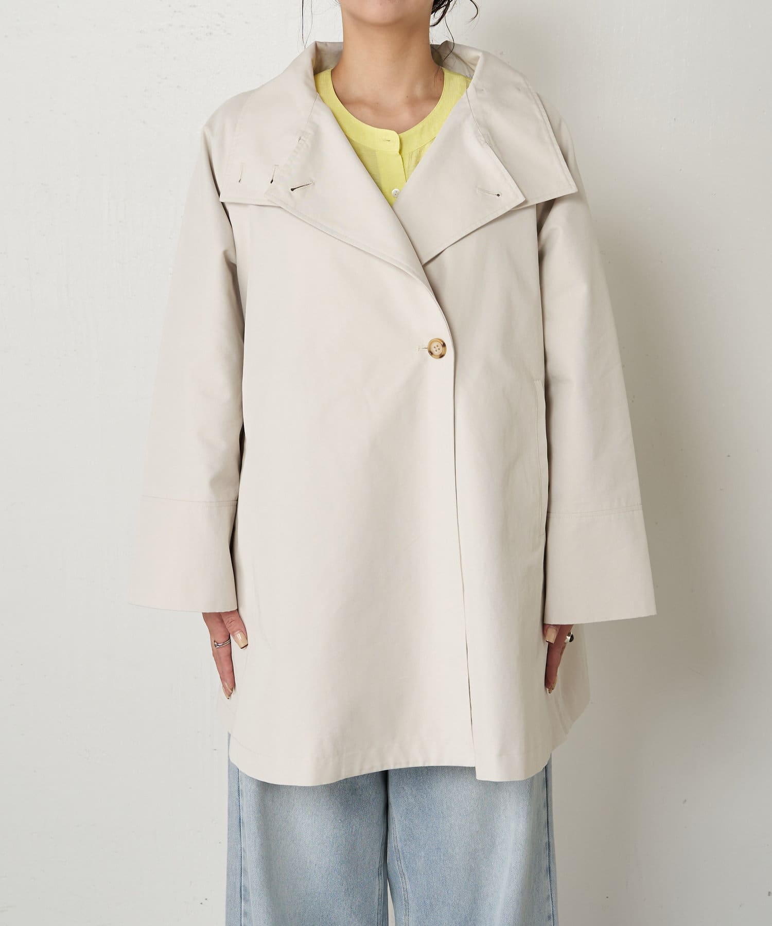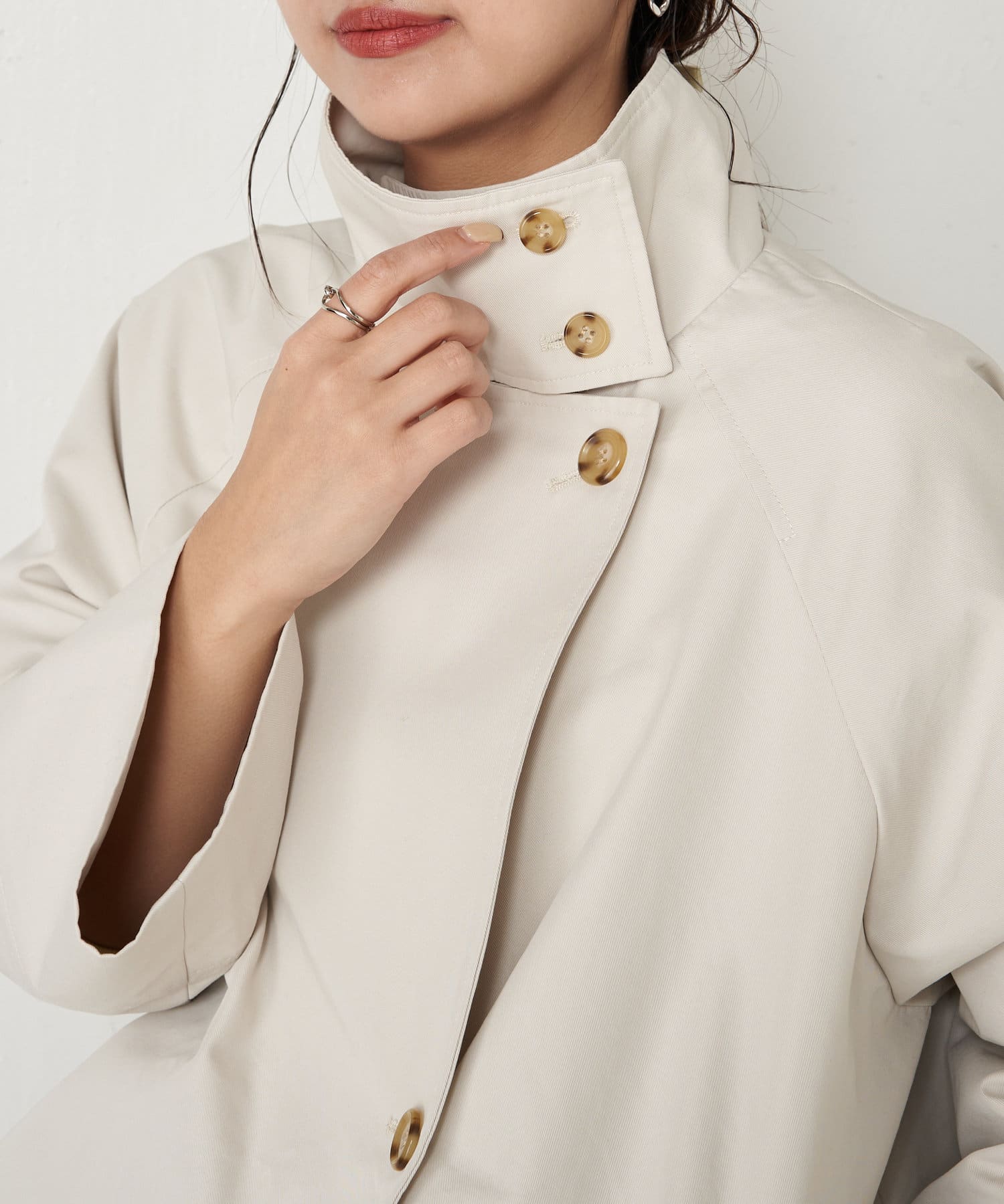 ボタンを外し深めのシングルブレストのような着こなしなど、ボタン使いで顔周りの表情が変わるデザインです。
