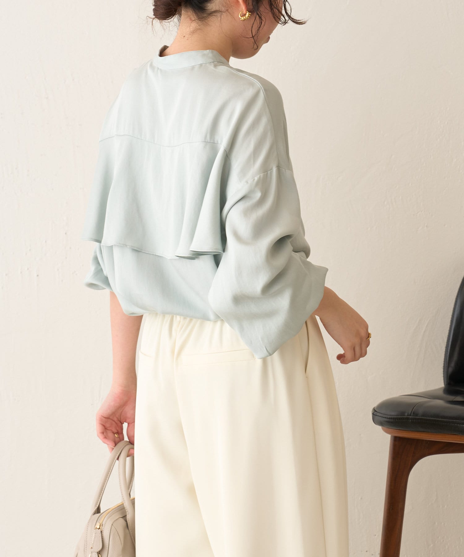 ・バックコンシャスデザインが目を惹く、大人のブラウスがトロミ素材で登場。