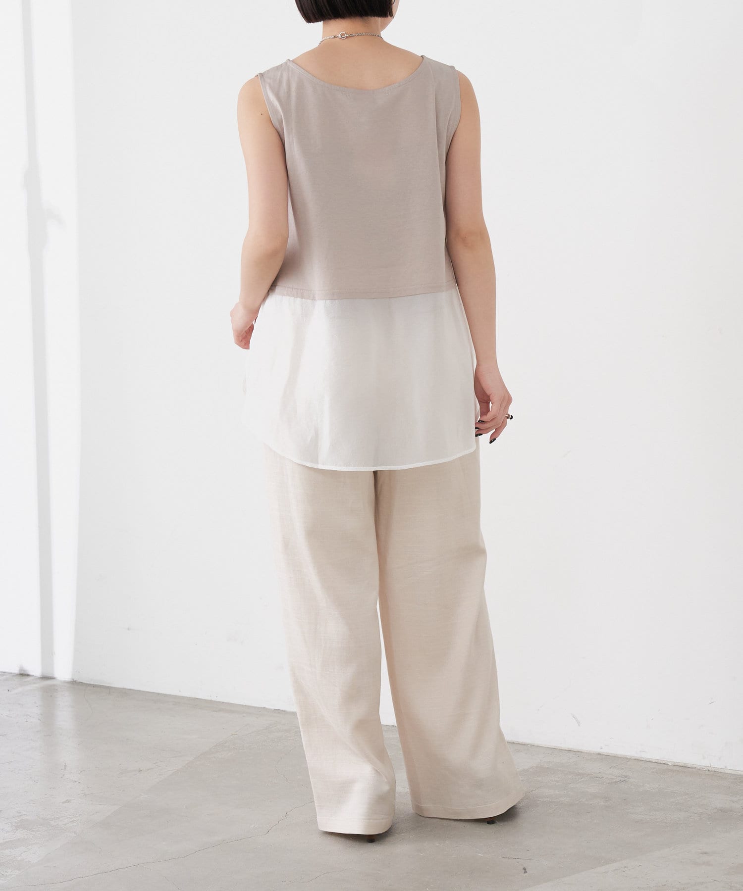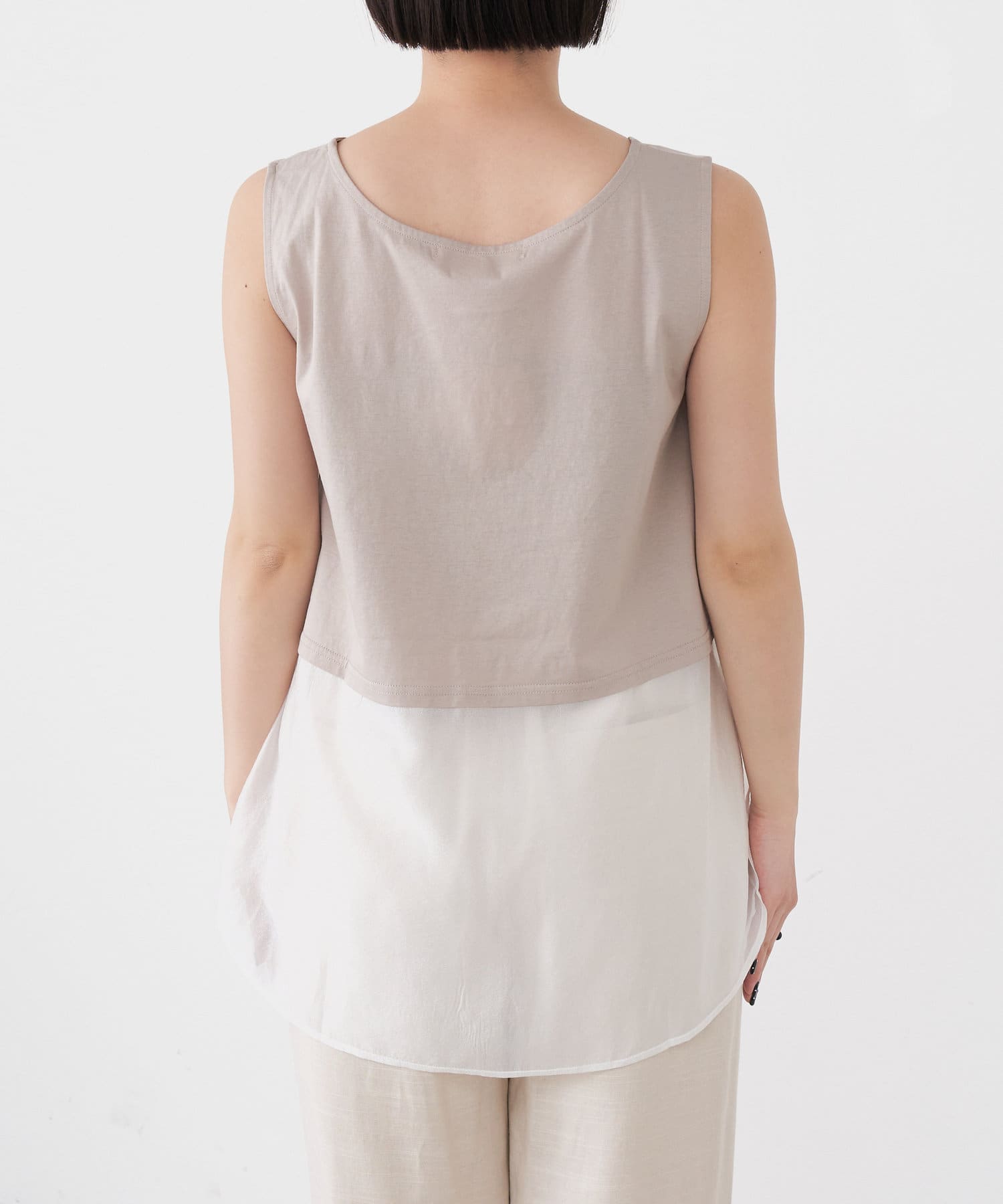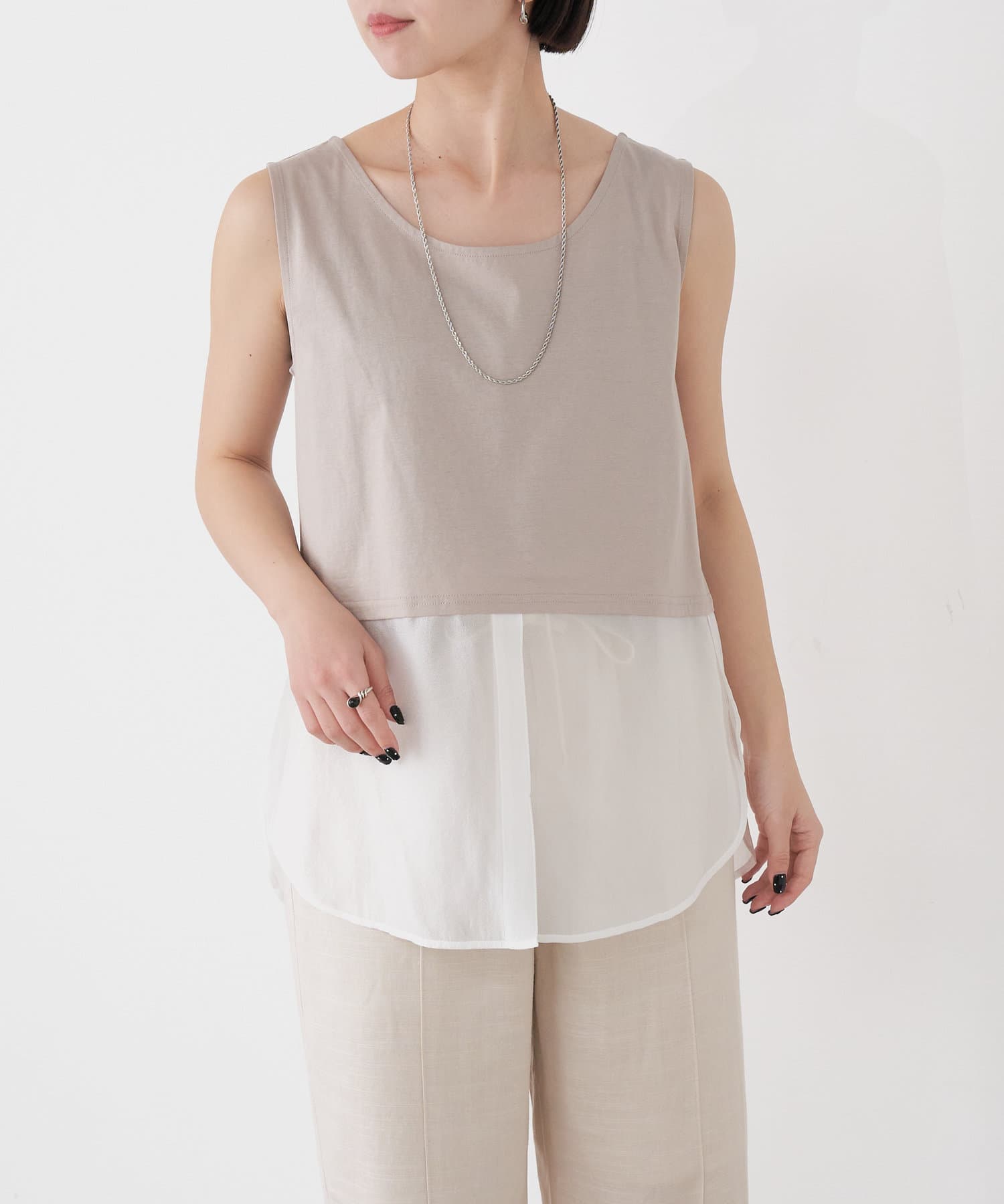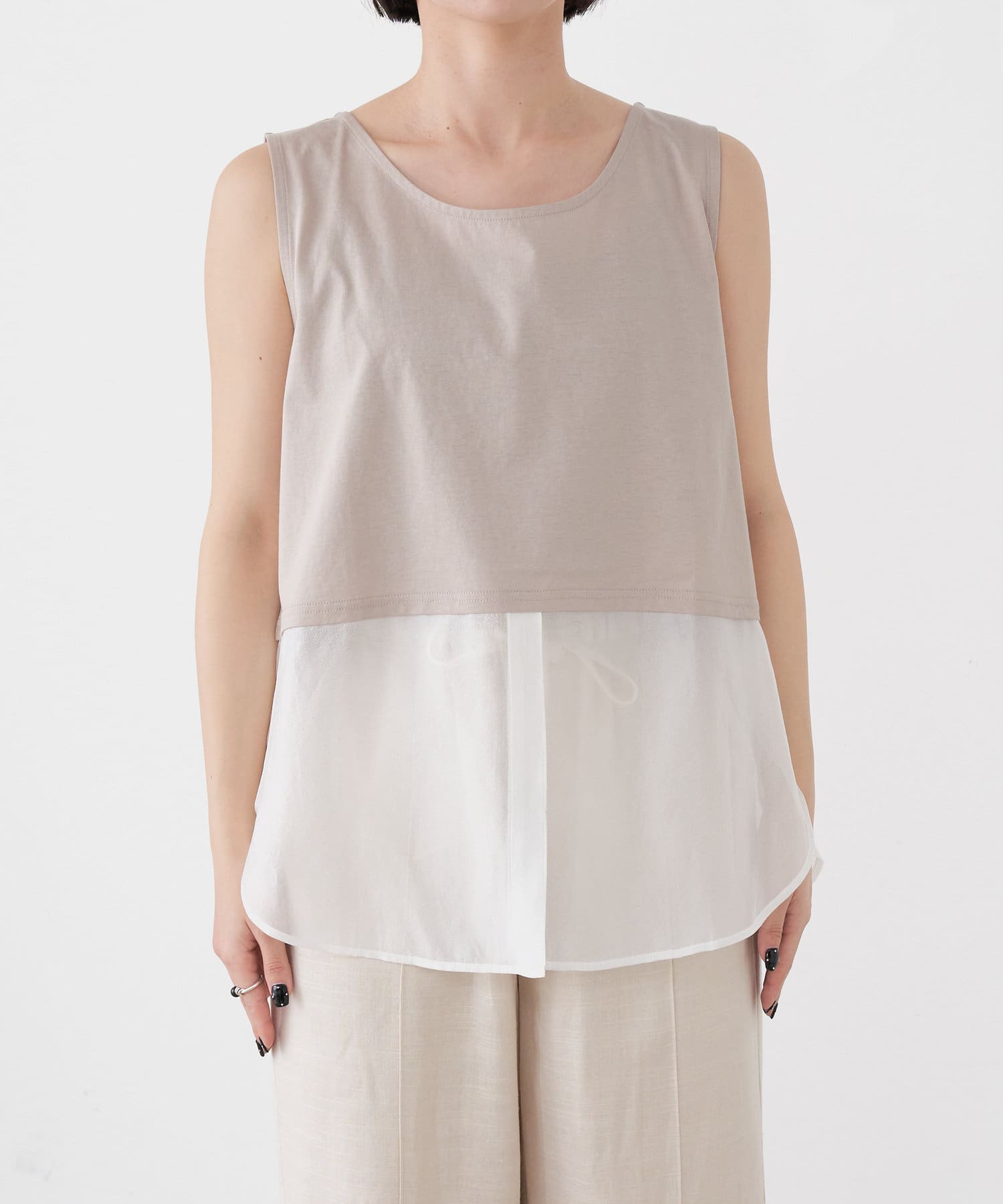 ・レイヤード風の裾切り替えがポイントのタンクトップ。