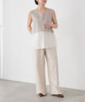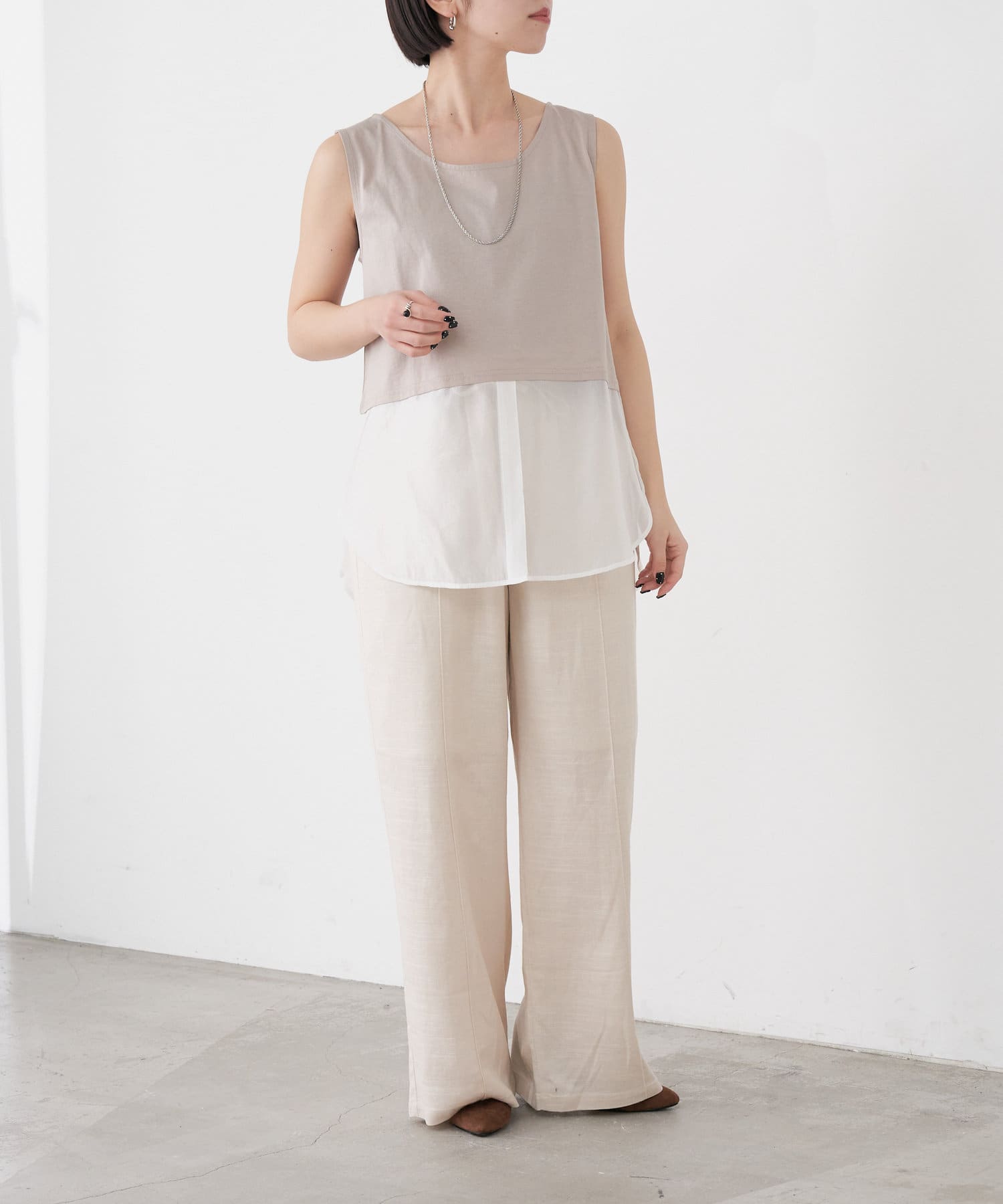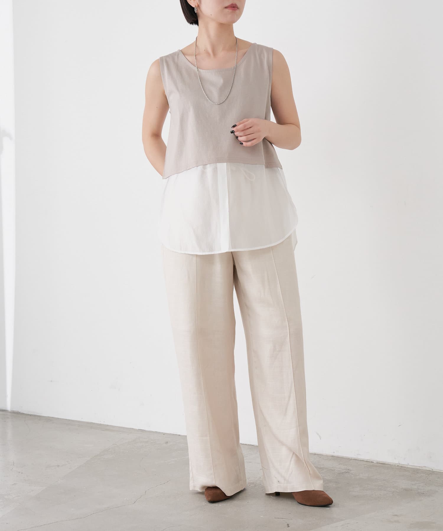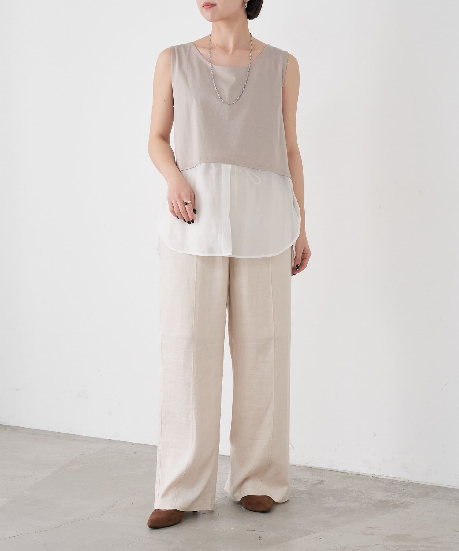 ・レイヤード風の裾切り替えがポイントのタンクトップ。