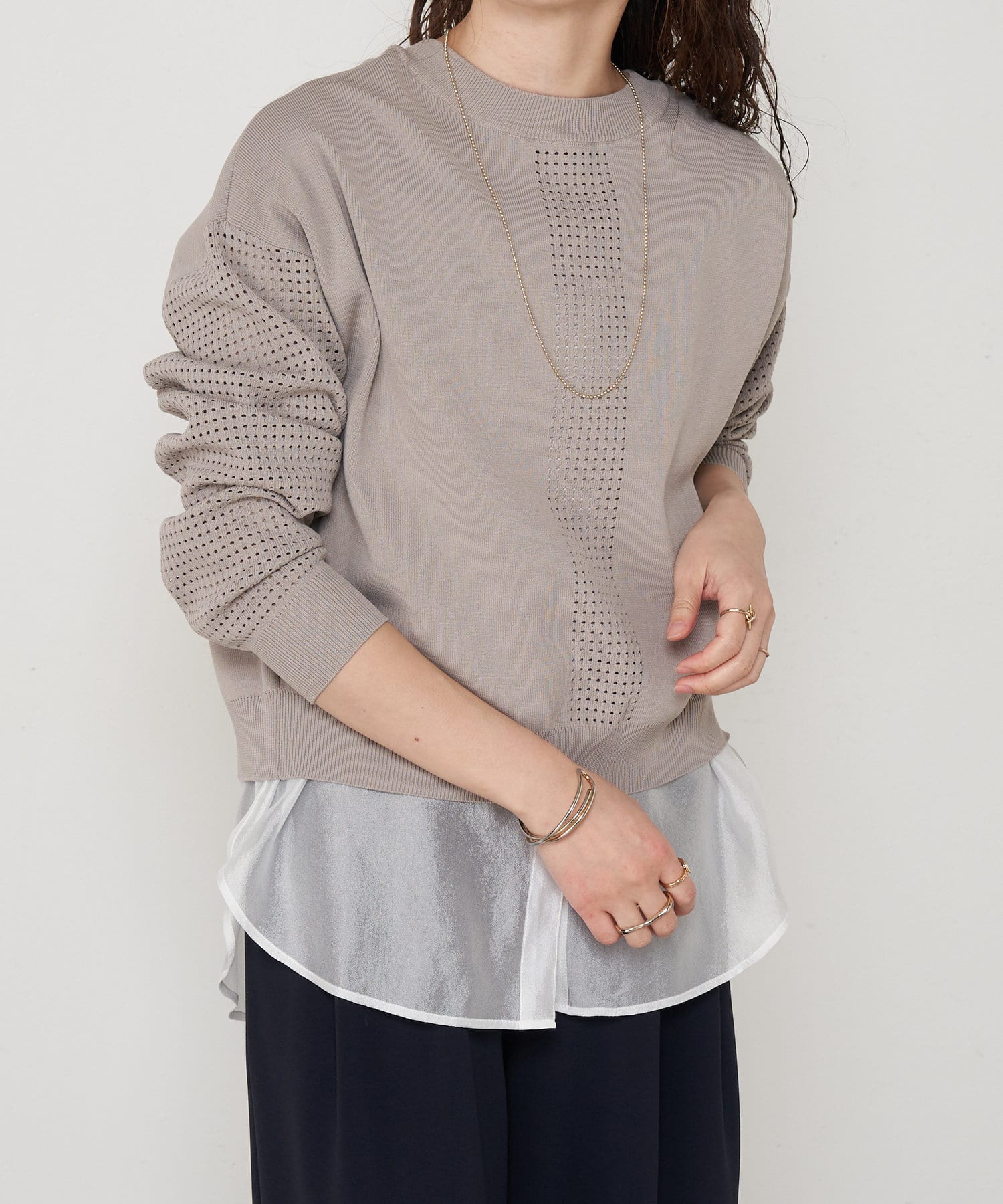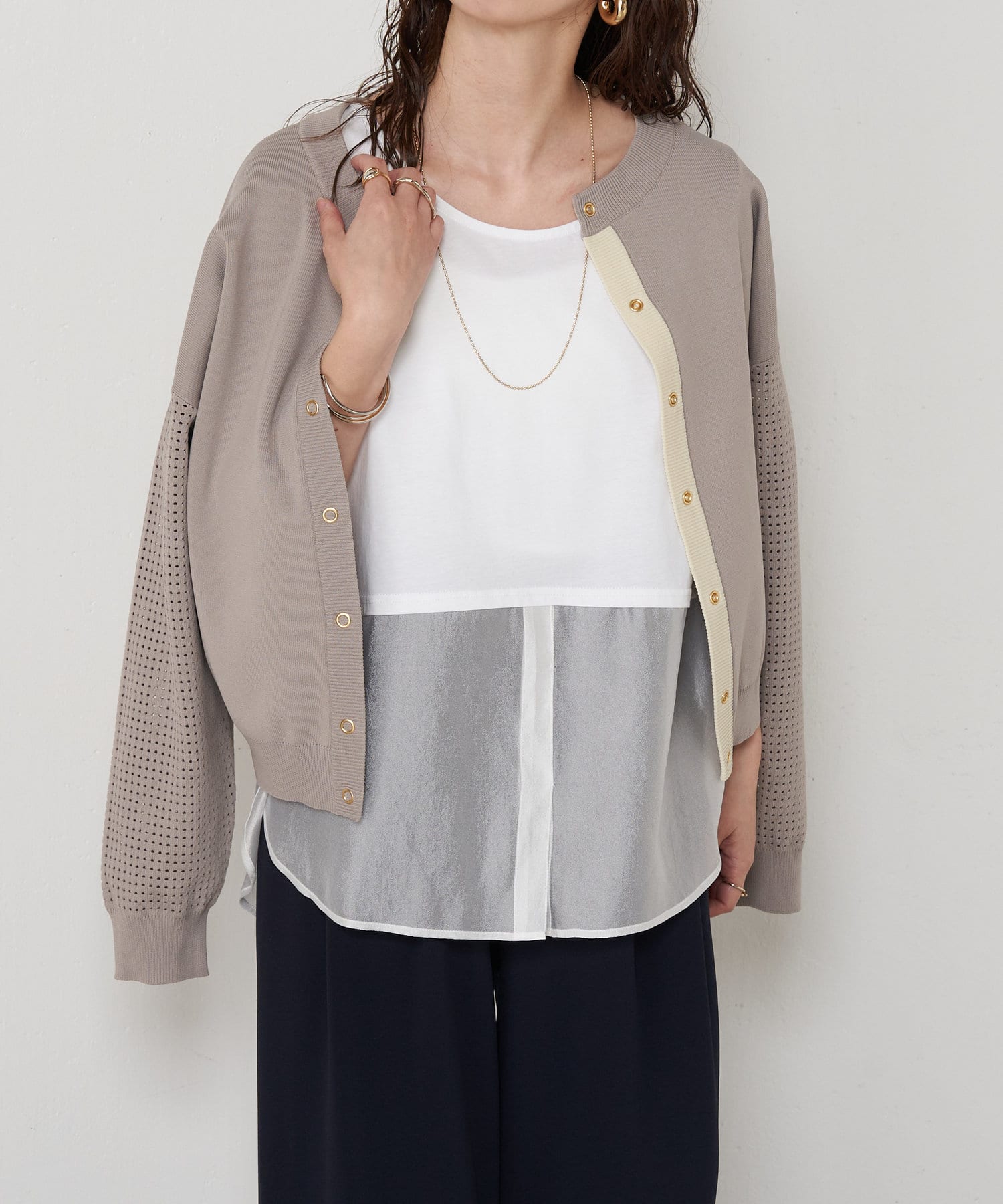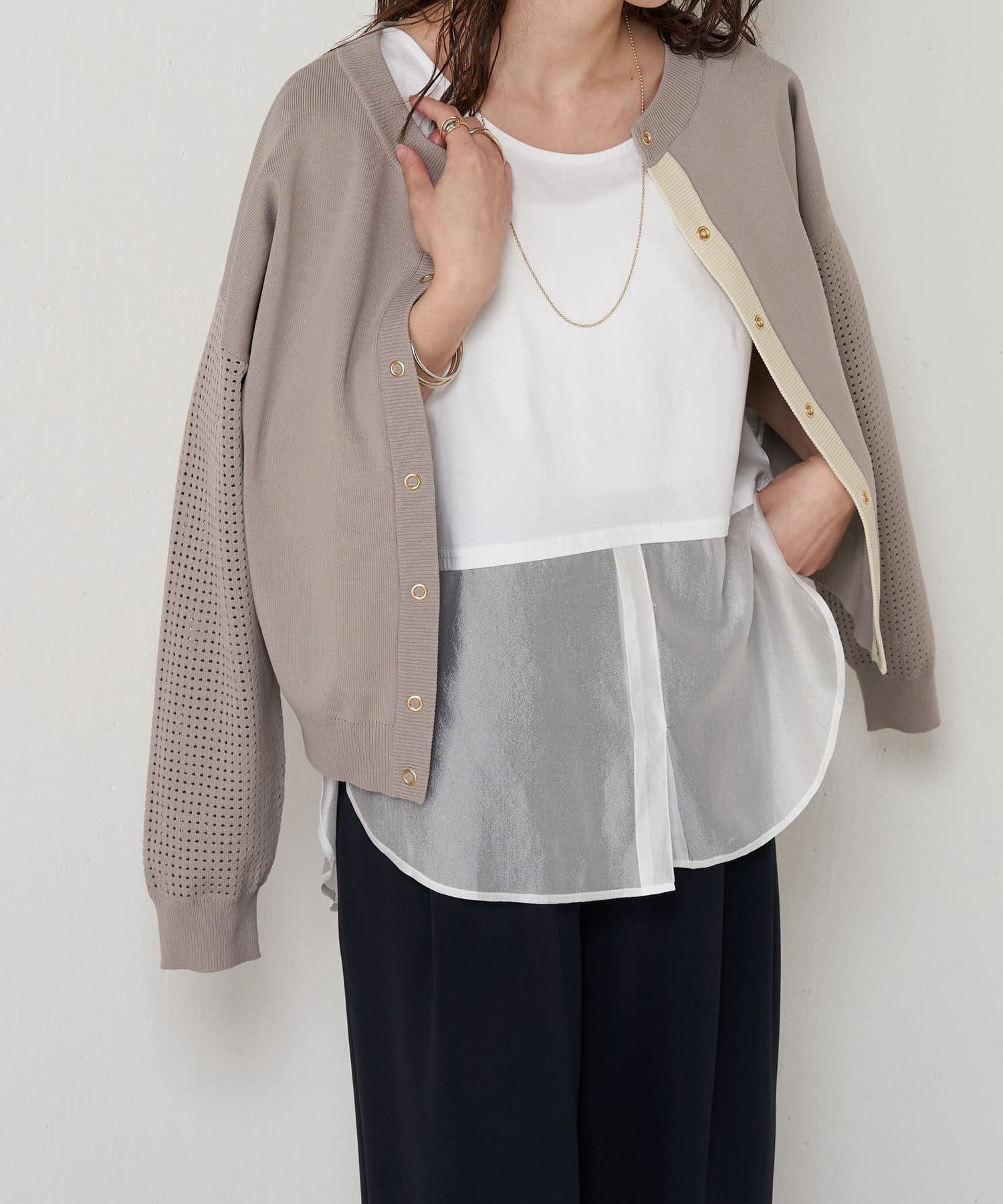 ・お手持ちのトップスの下に忍ばせて裾からチラッと見せるのがポイント。
