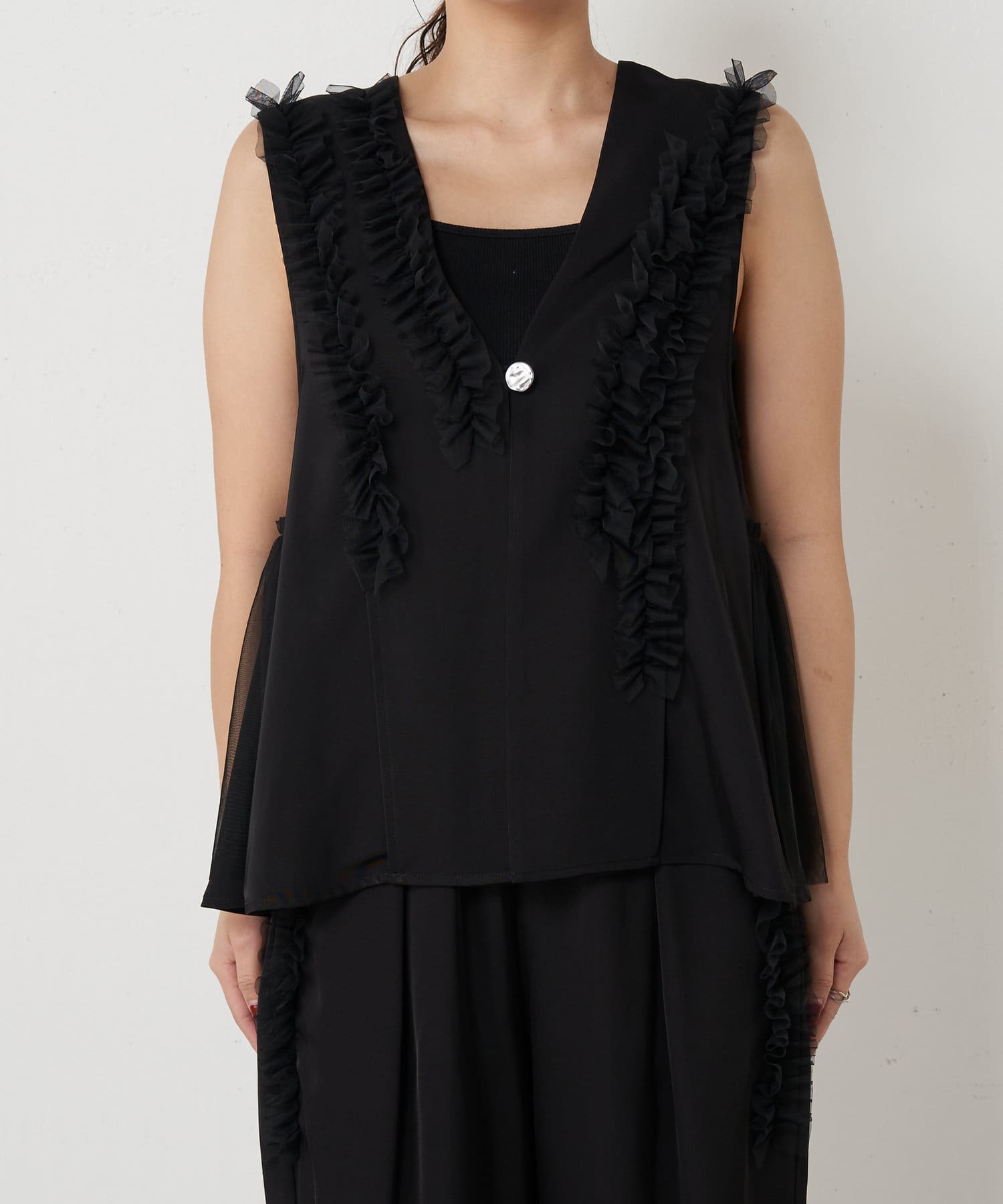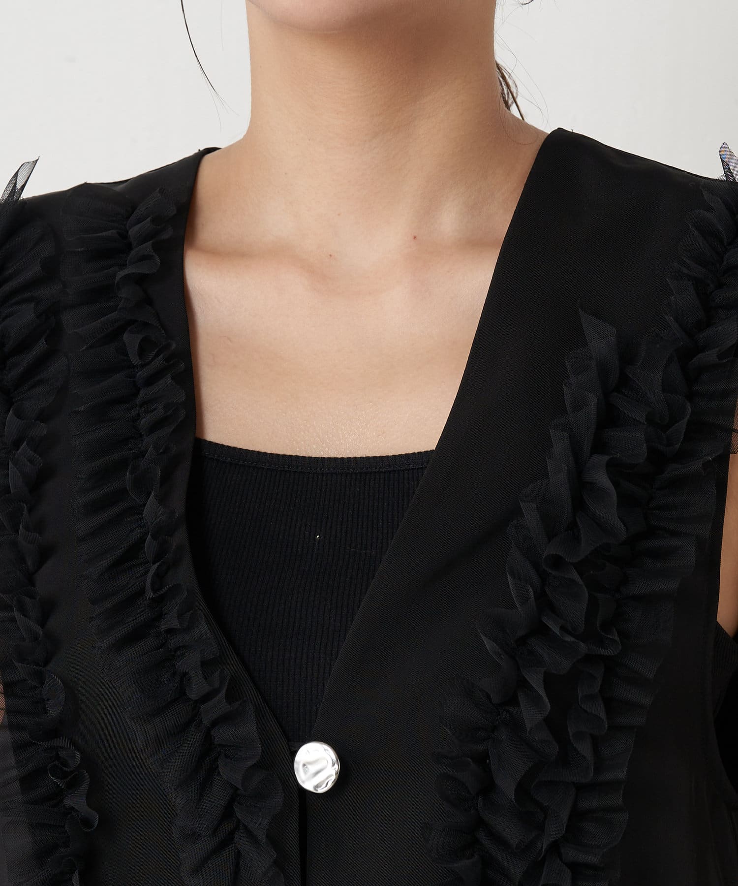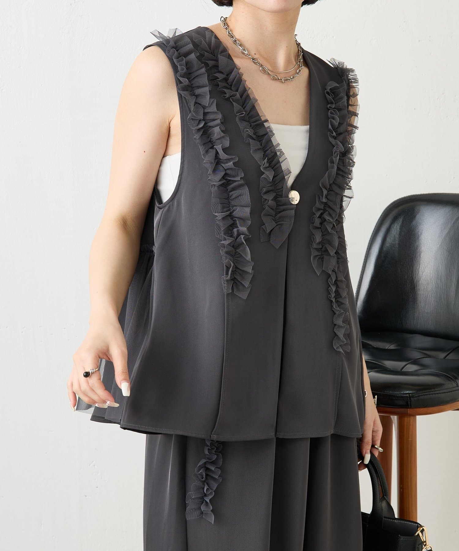 ・フリルを重ねたチュールベストが目を惹くデザインのオケージョンアイテムです。