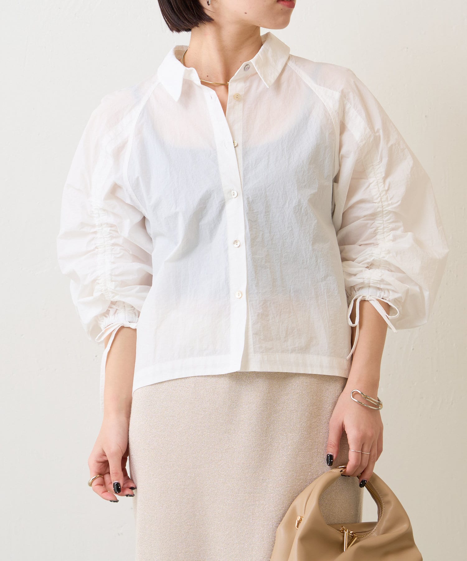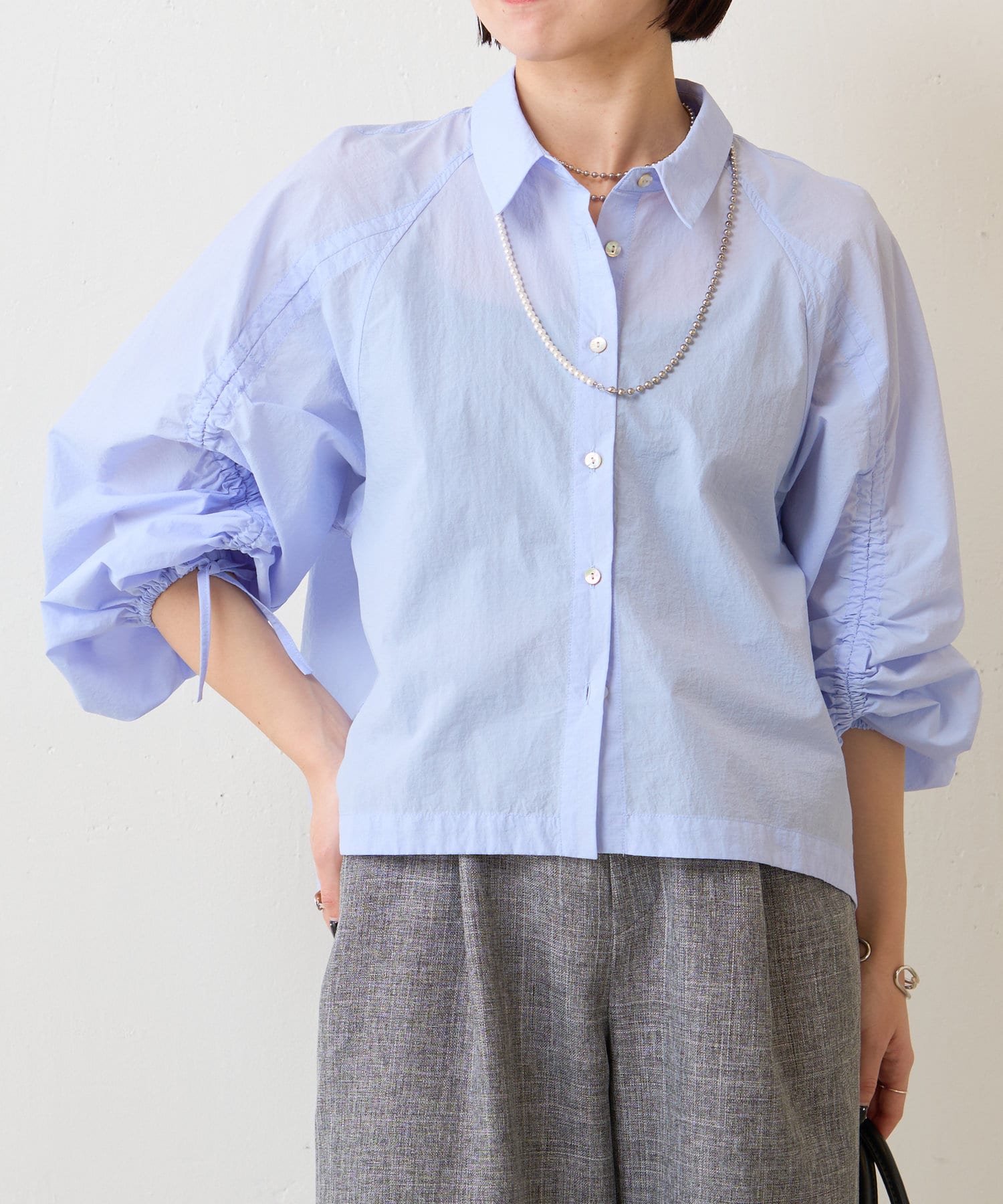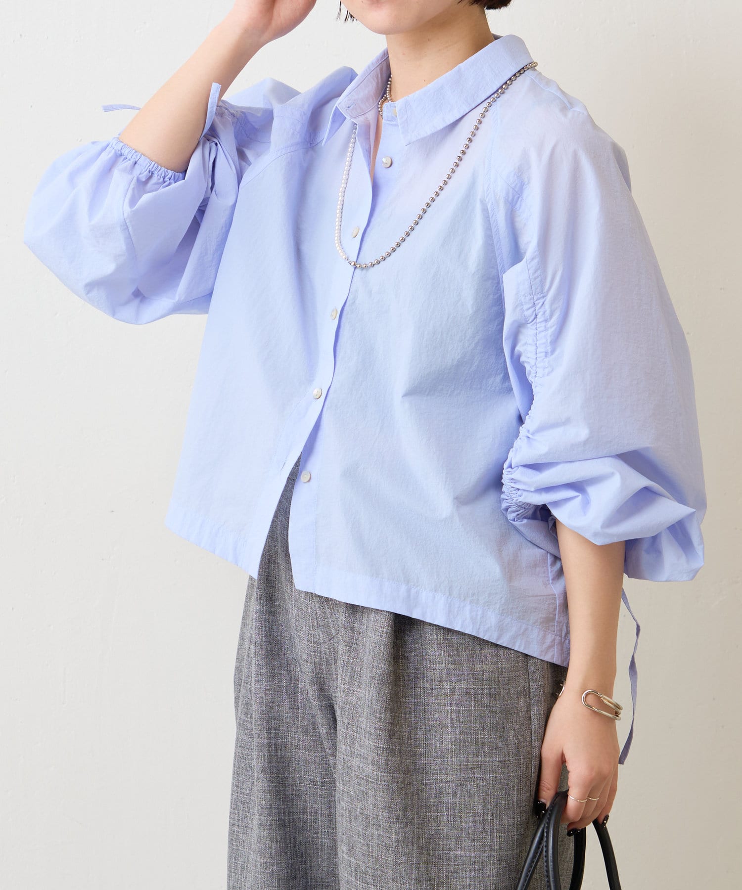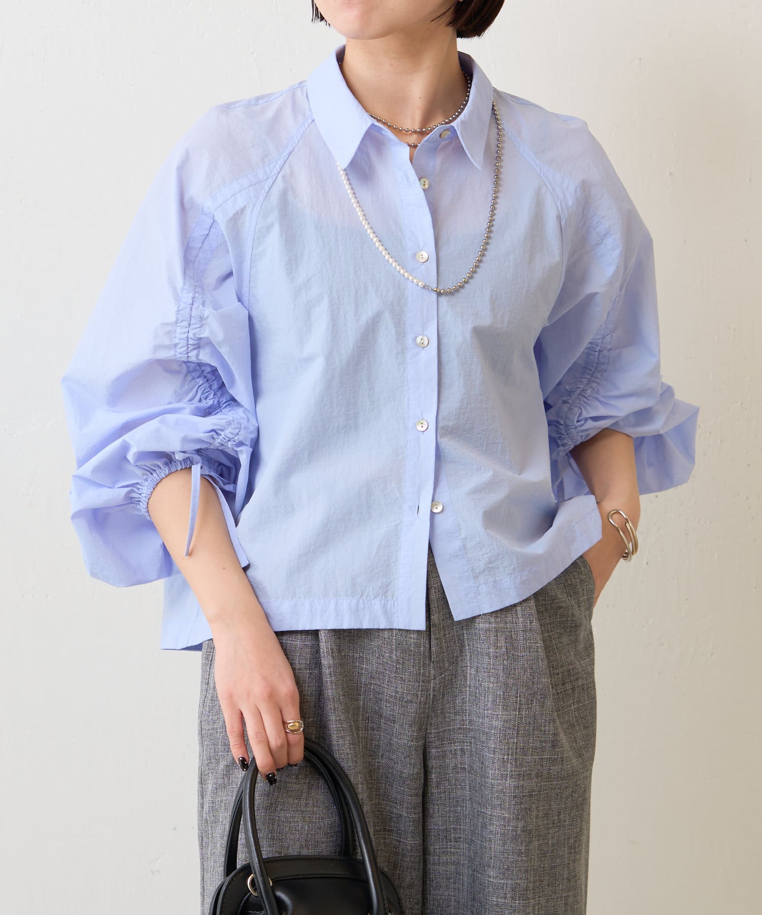 ・袖のシャーリングが特徴的なデザインのブラウスです。