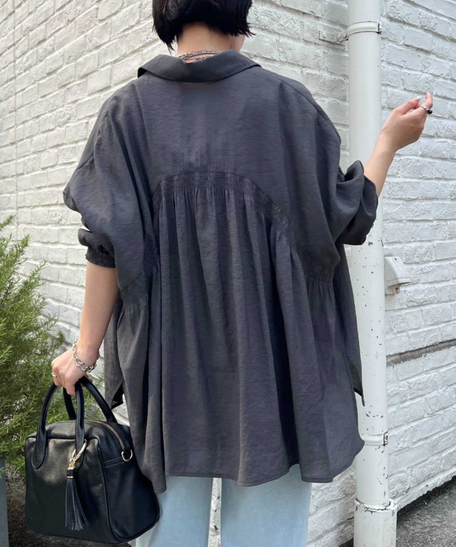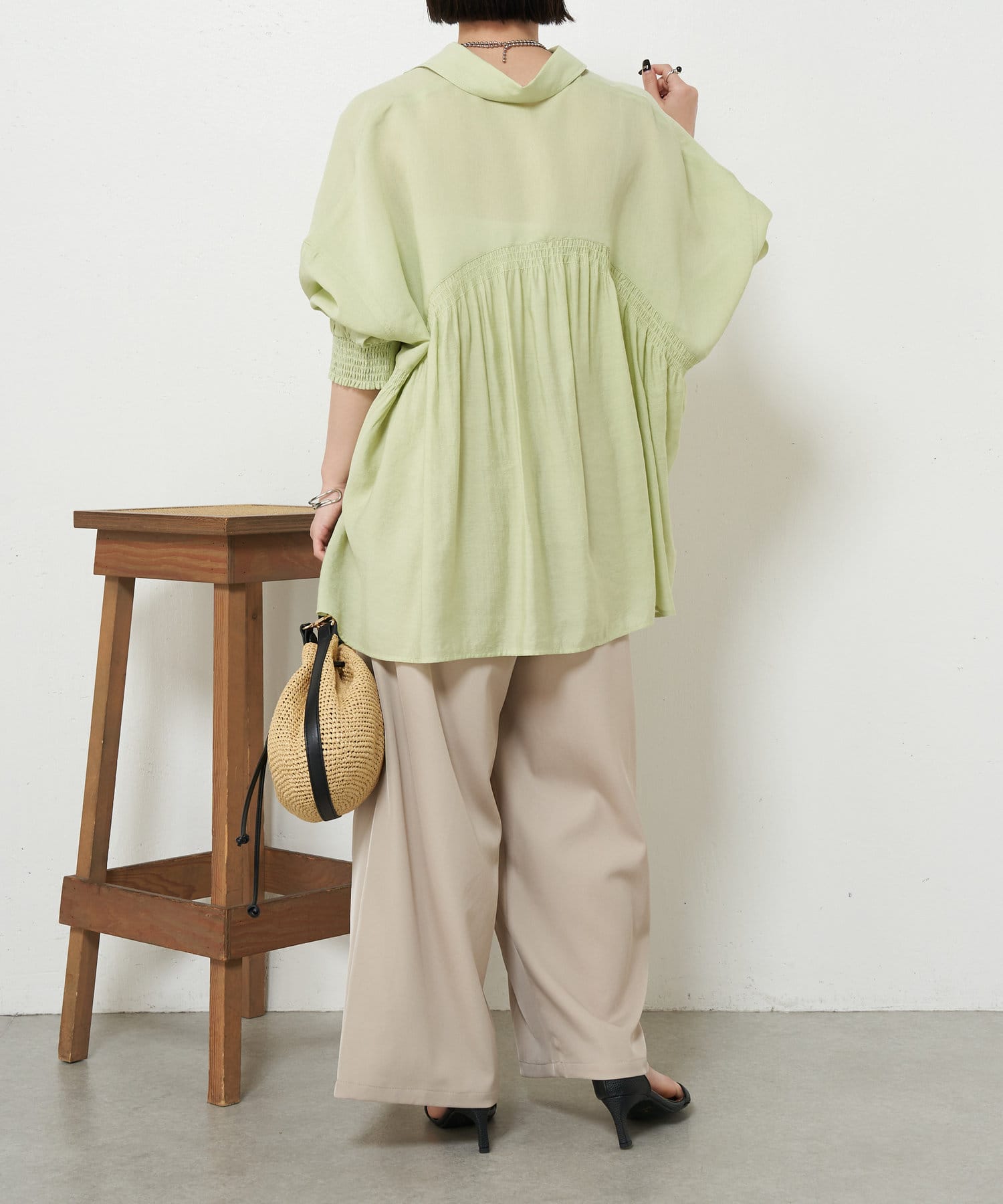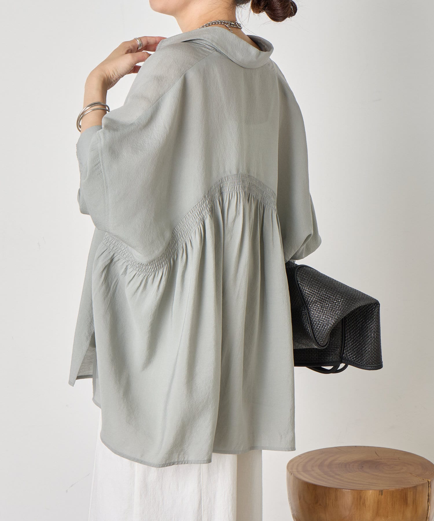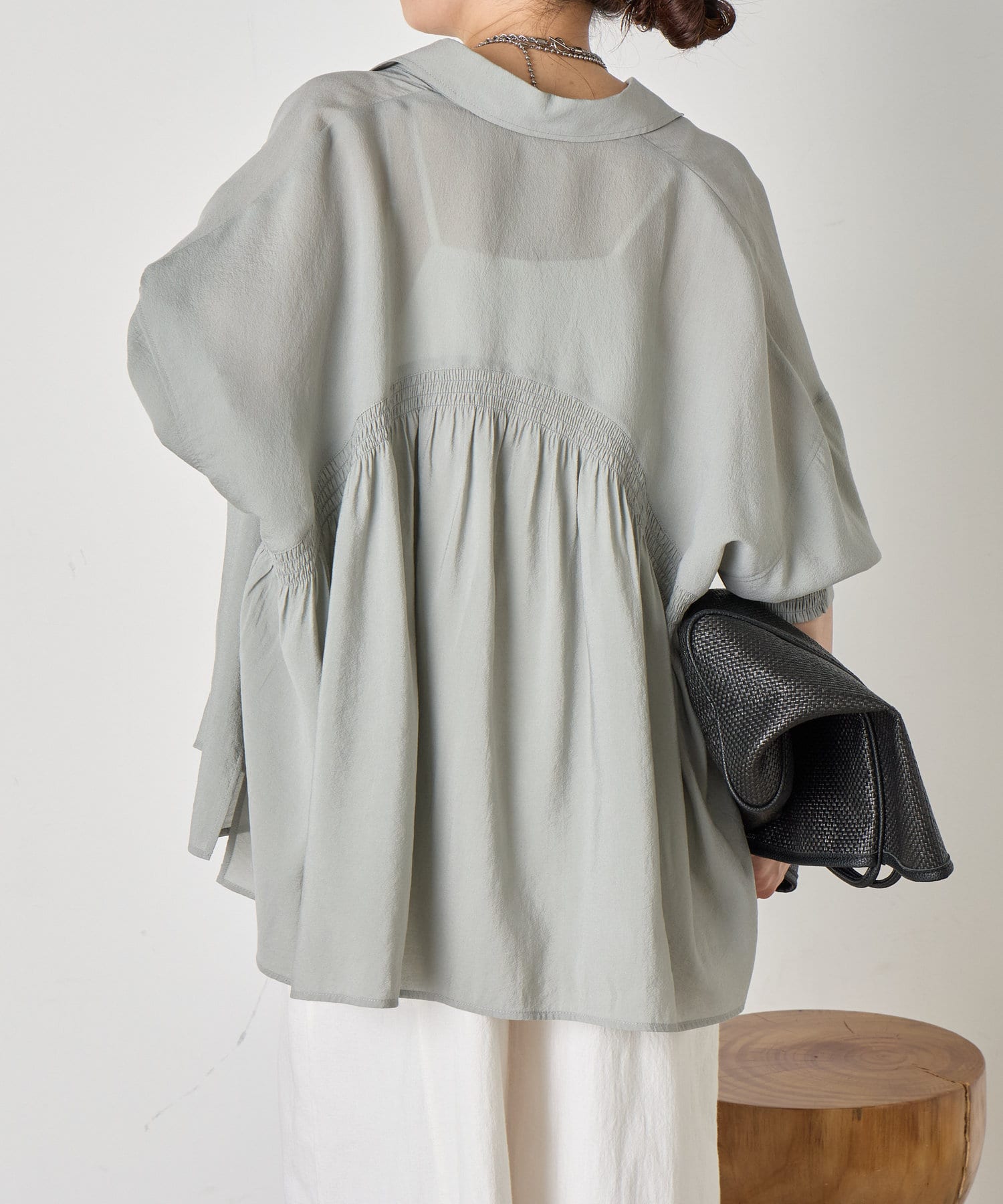 ・さらりとした肌触りで暑い季節でも快適、かつバックのシャーリングが目を惹くオトナブラウス。