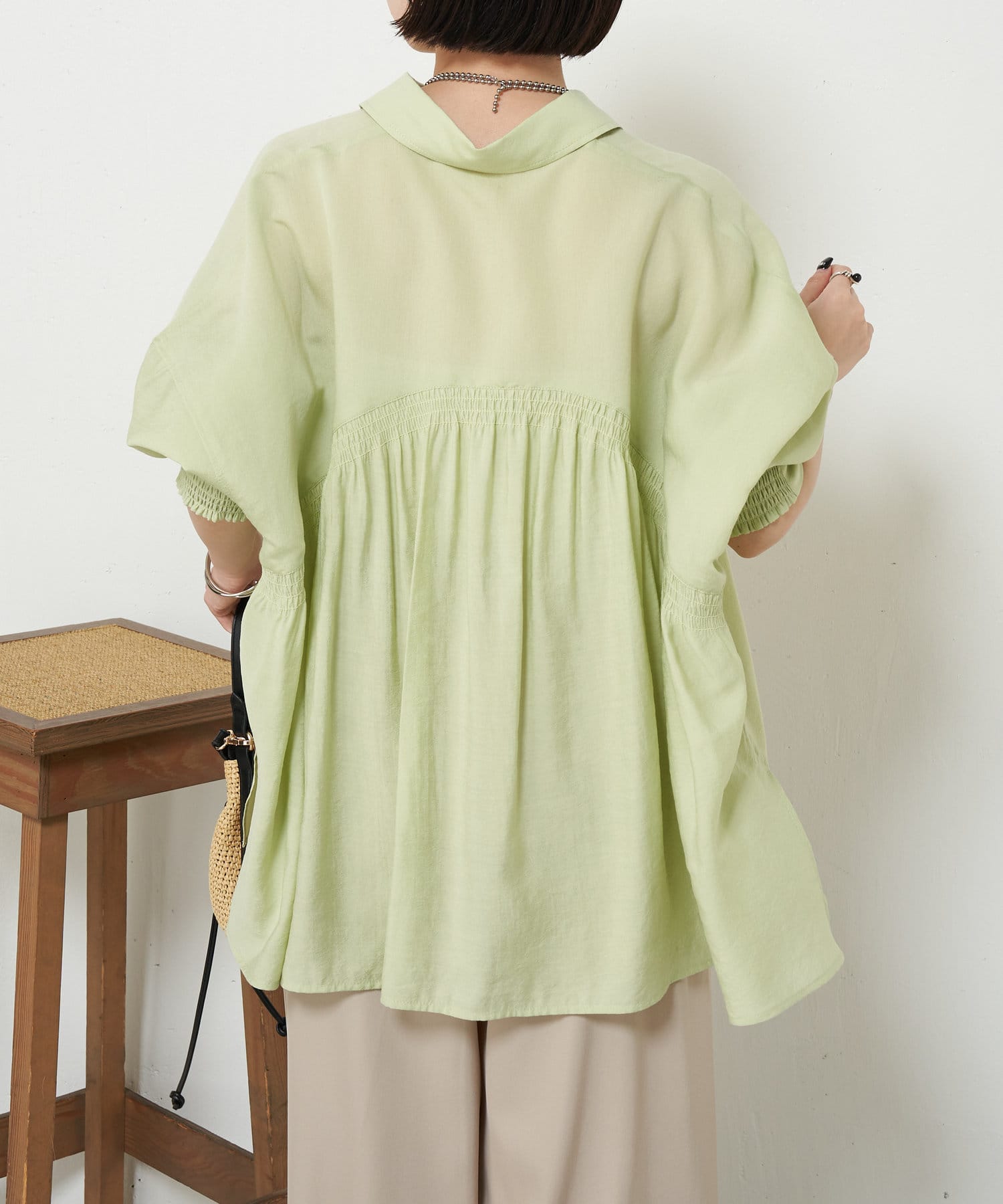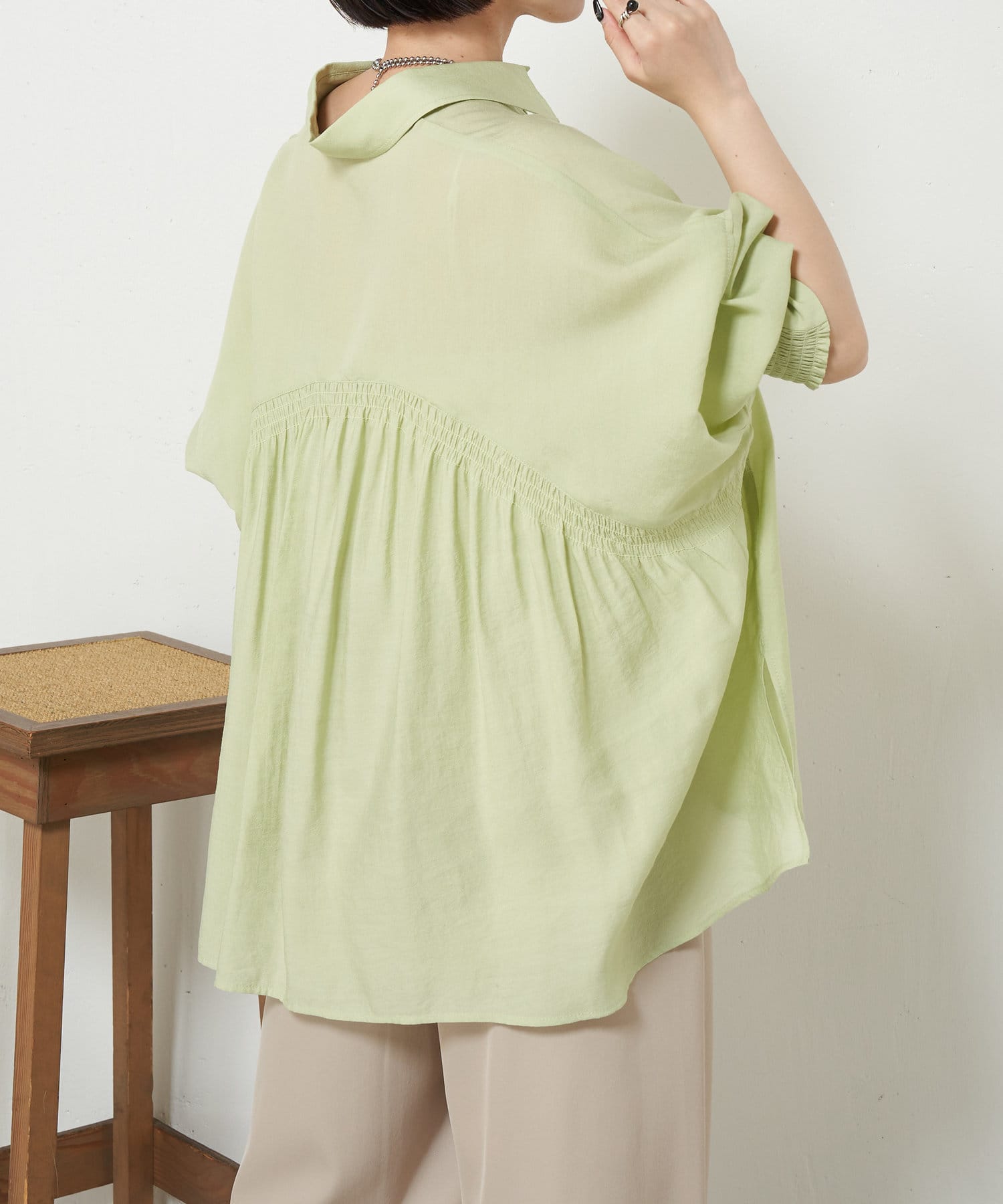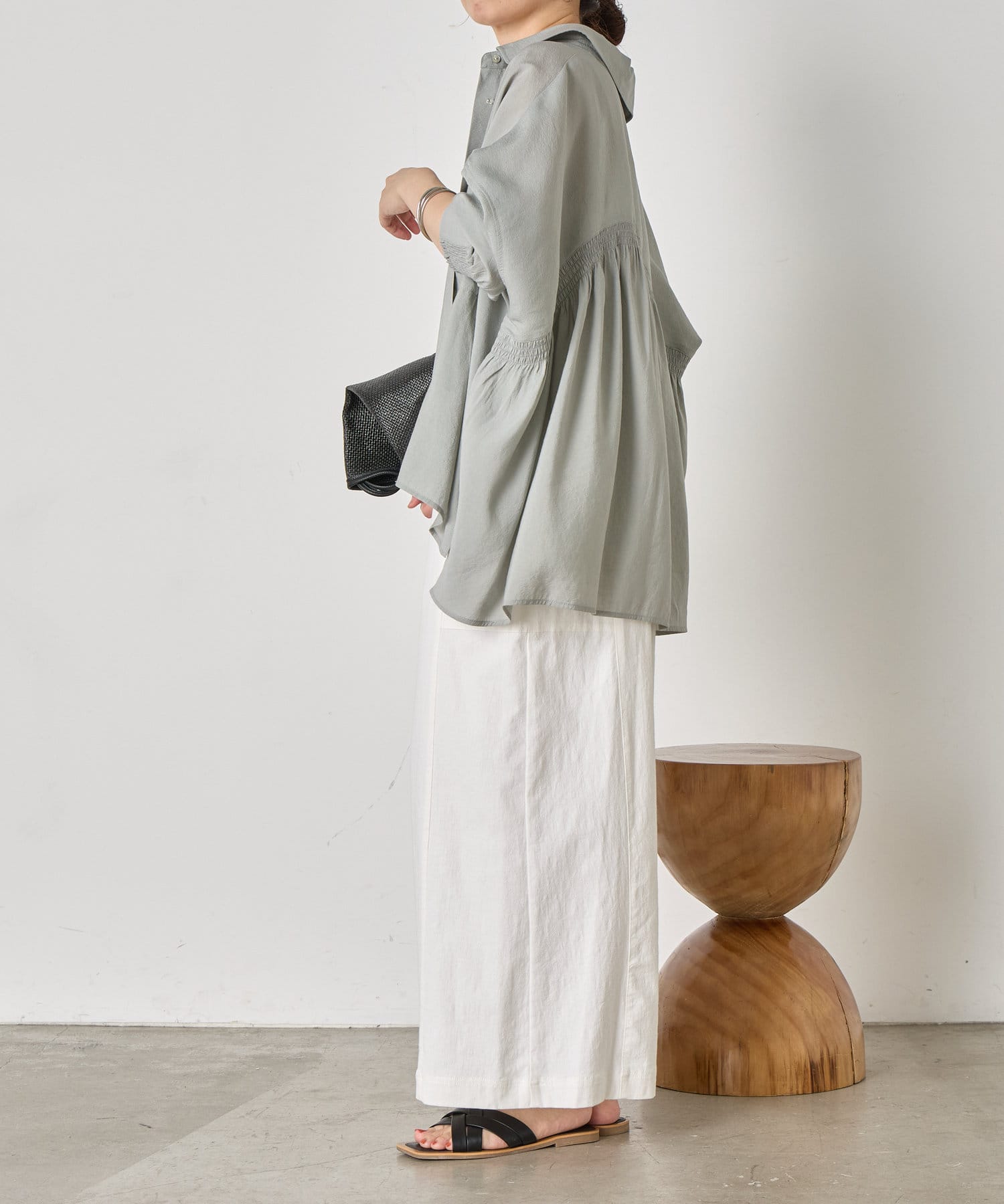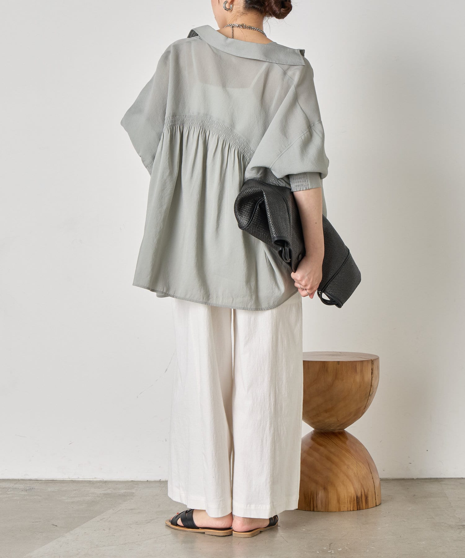 ・さらりとした肌触りで暑い季節でも快適、かつバックのシャーリングが目を惹くオトナブラウス。
