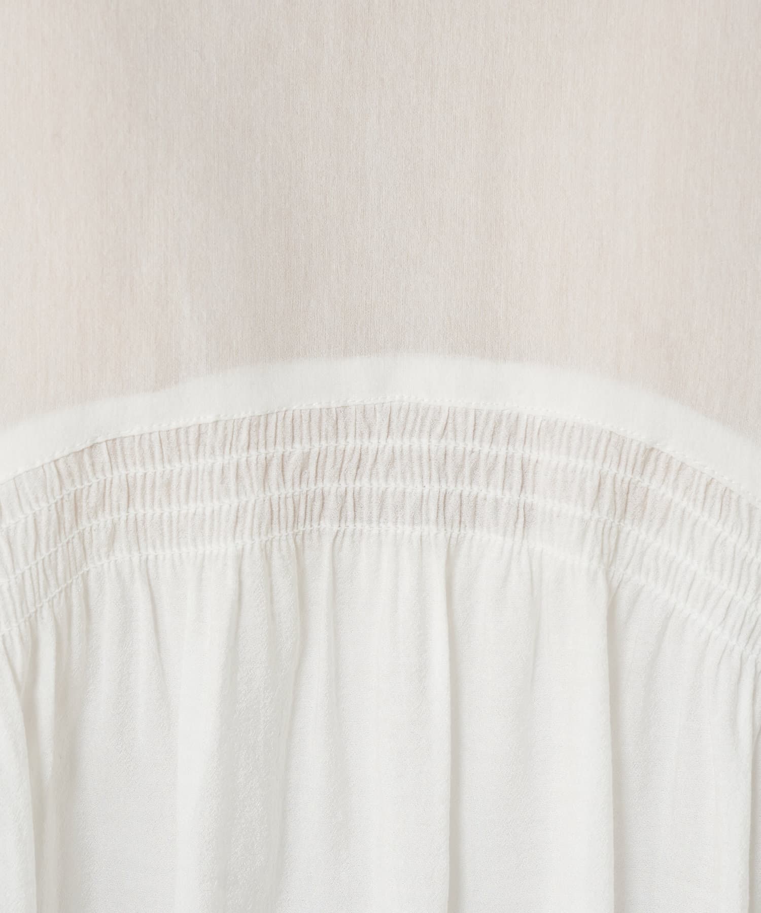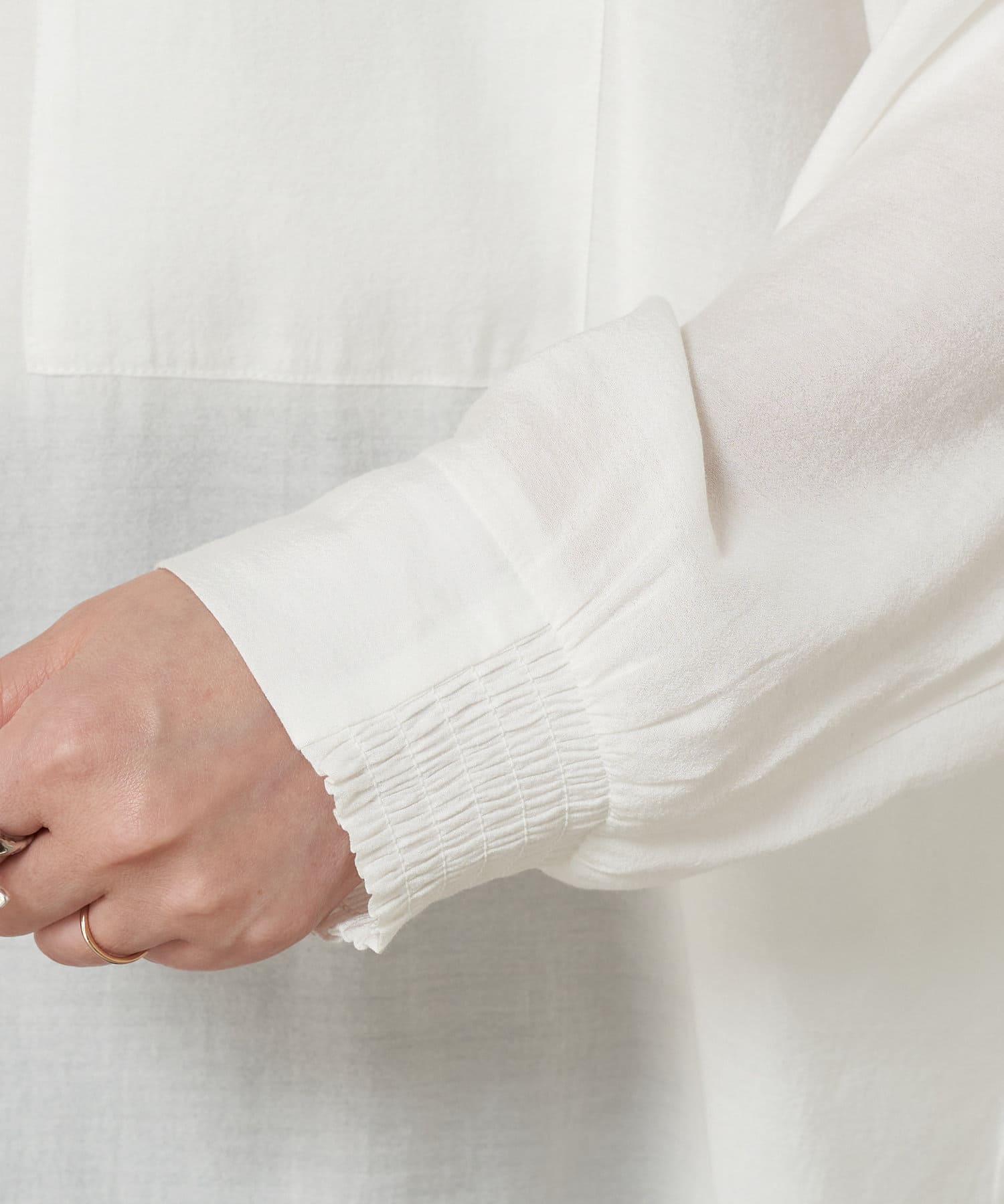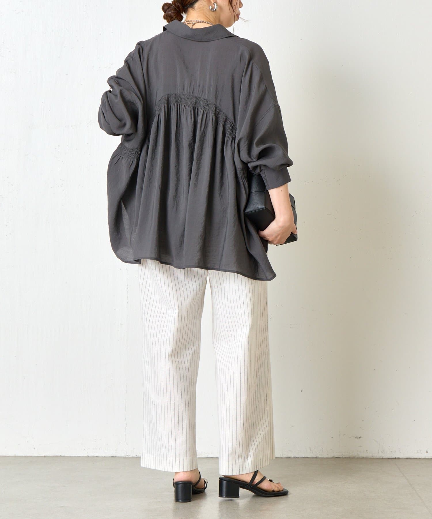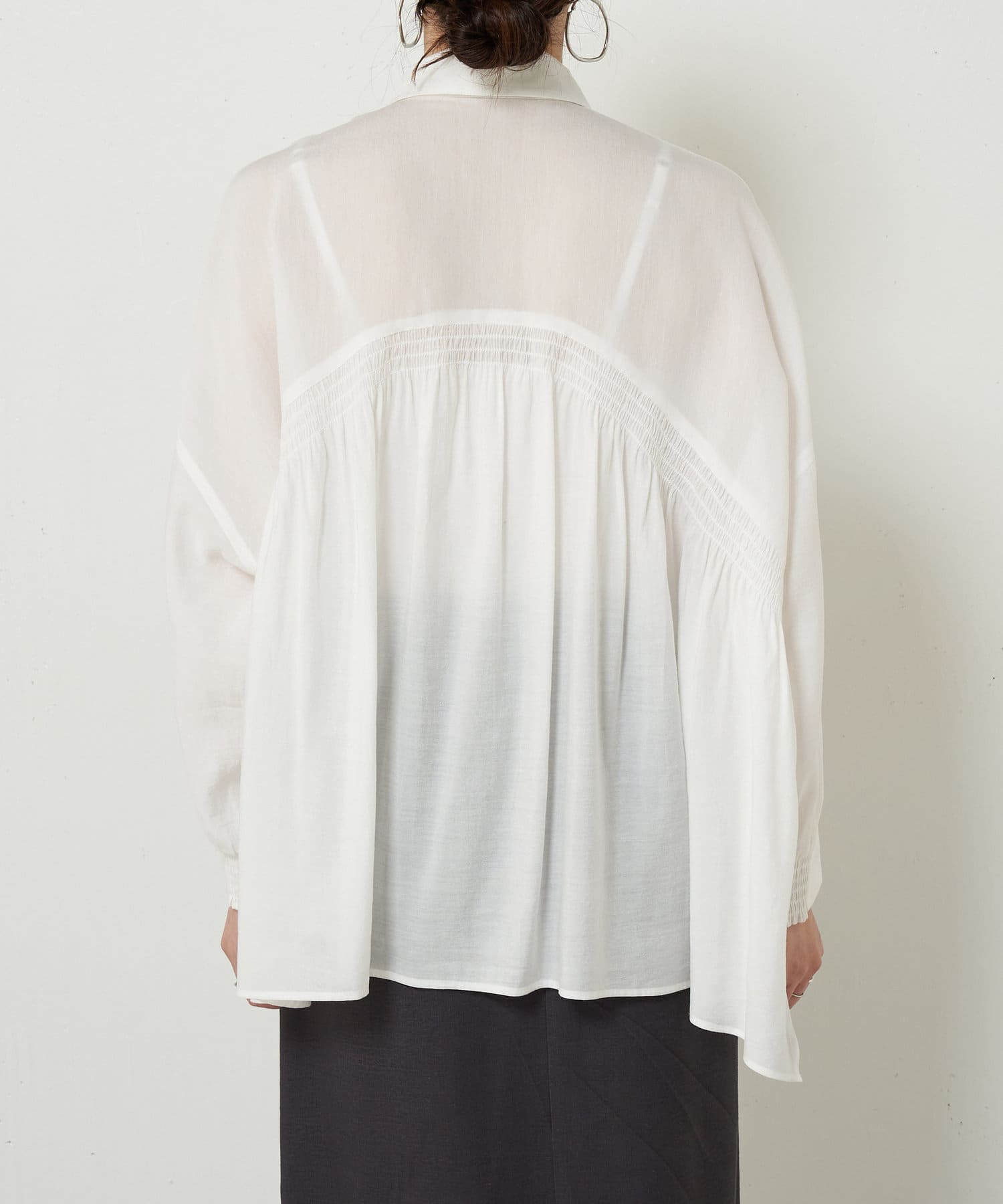 ・さらりとした肌触りで暑い季節でも快適、かつバックのシャーリングが目を惹くオトナブラウス。