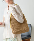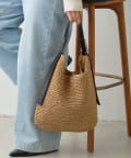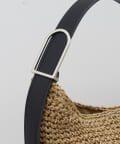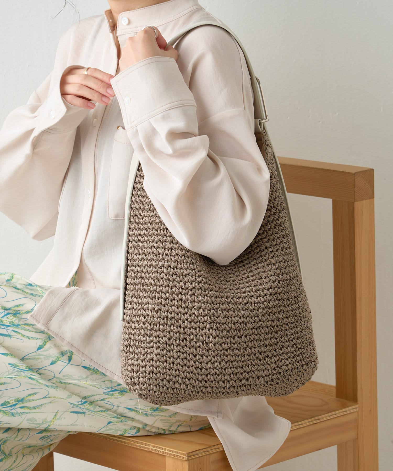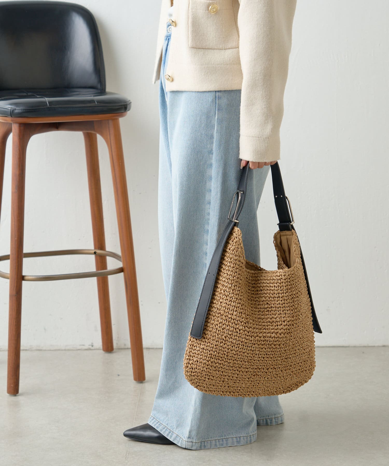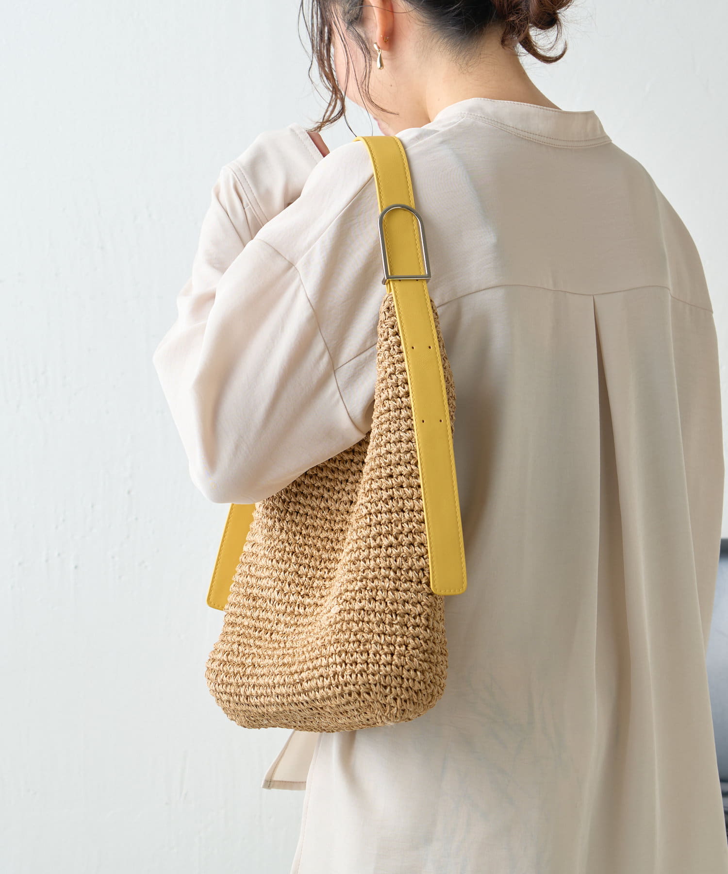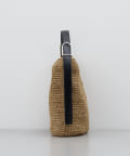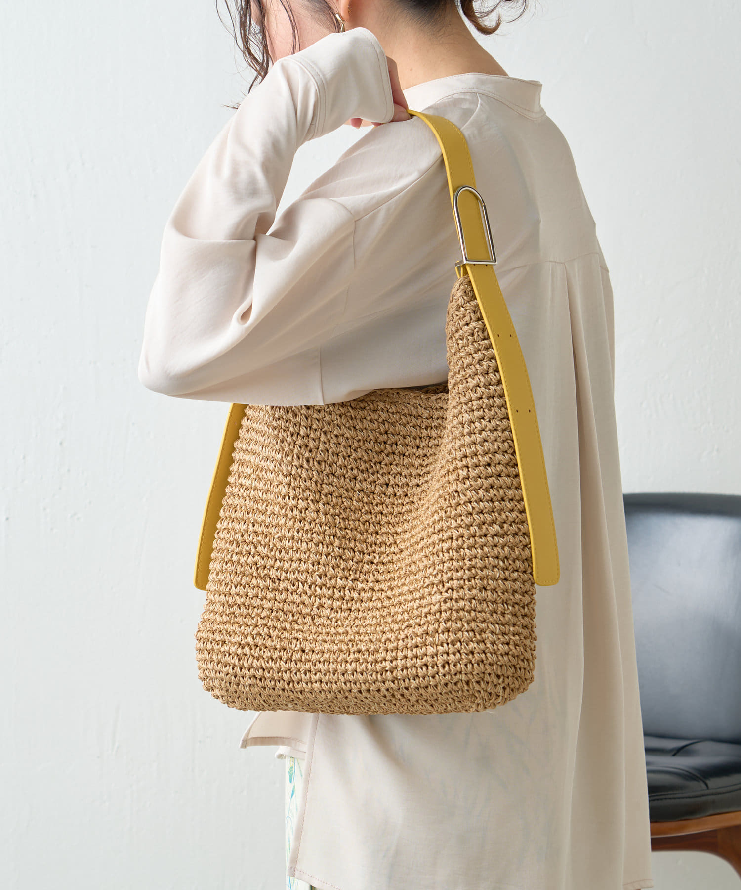 ・持ち手のレザー生地の上質な風合いが魅力的なバッグ。