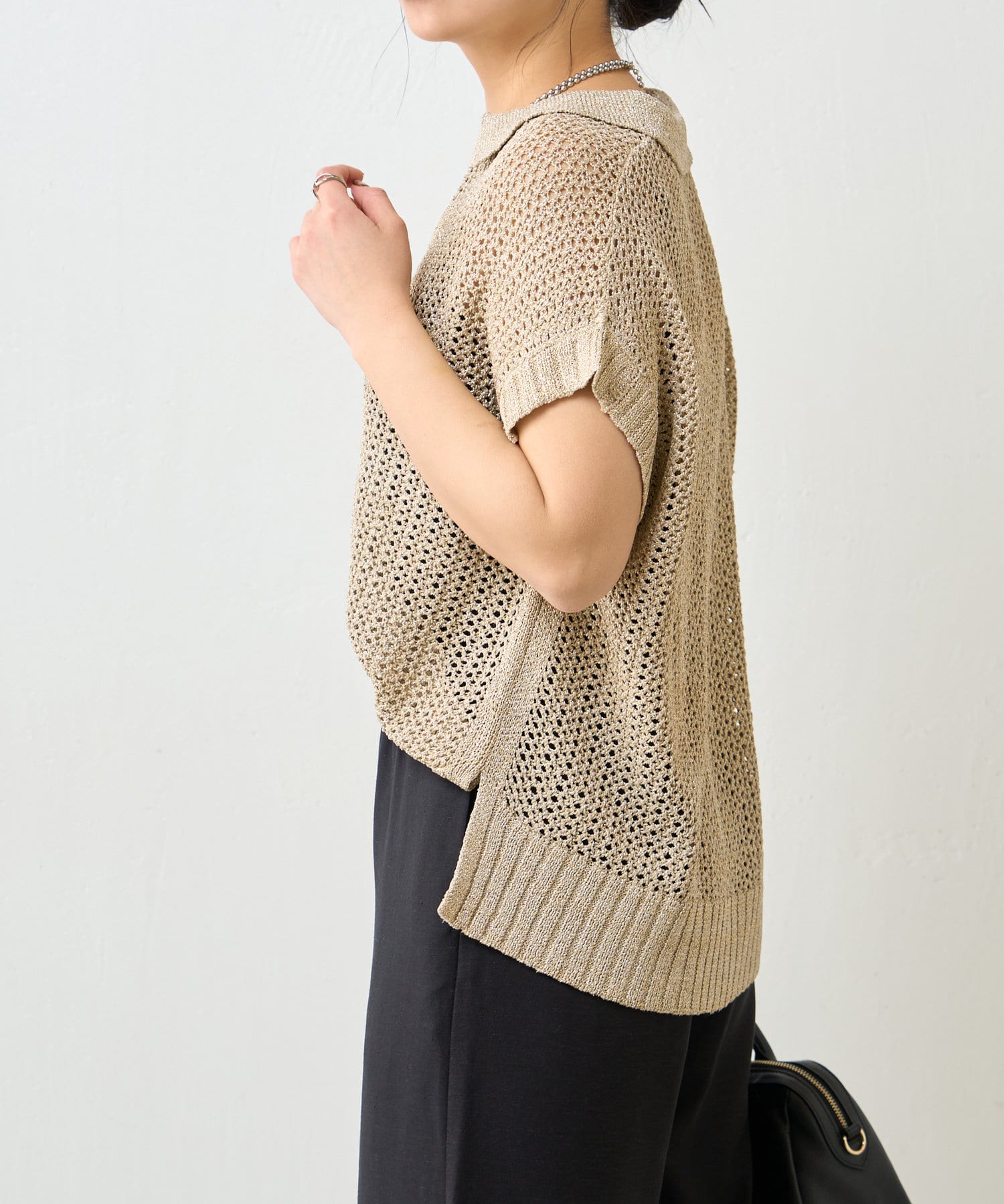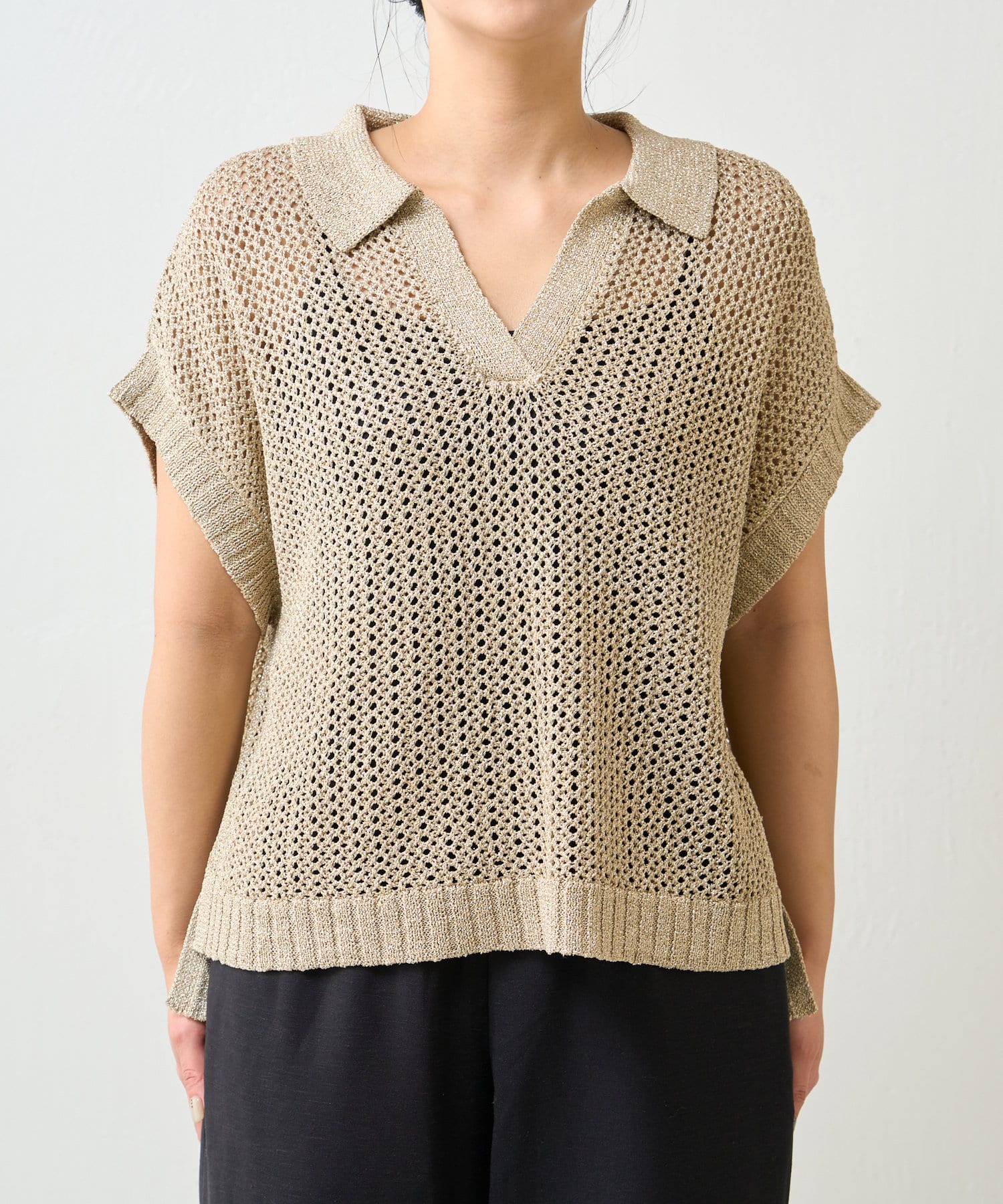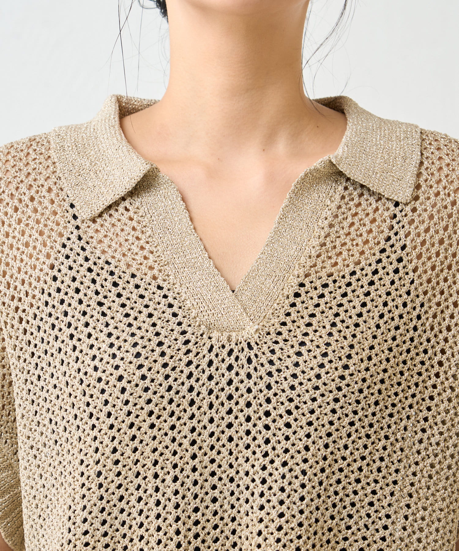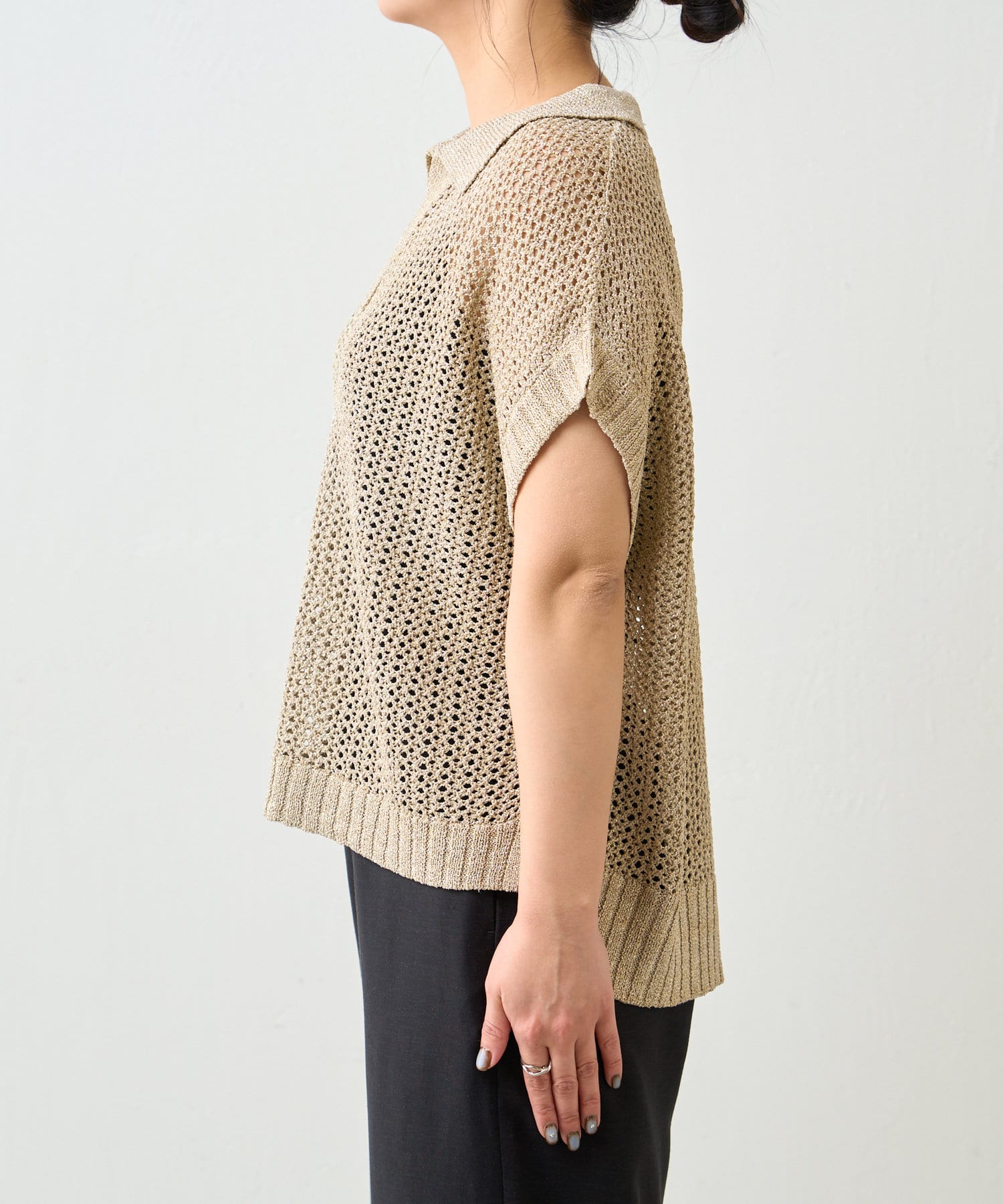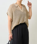 ・カジュアルになりがちなニットポロシャツですが、程よく光沢のあるメタリック糸と、すっきりとしたVネックのデザインが、大人の女性にふさわしい洗練された印象を与えてくれます。