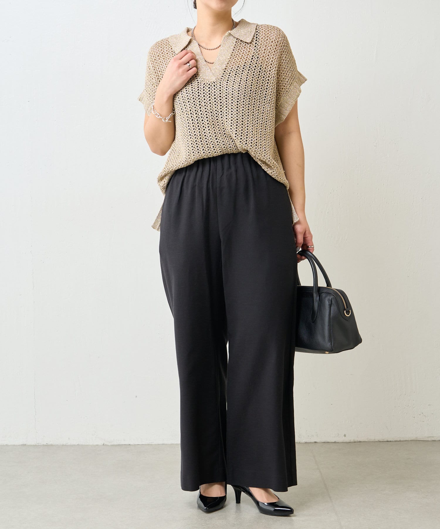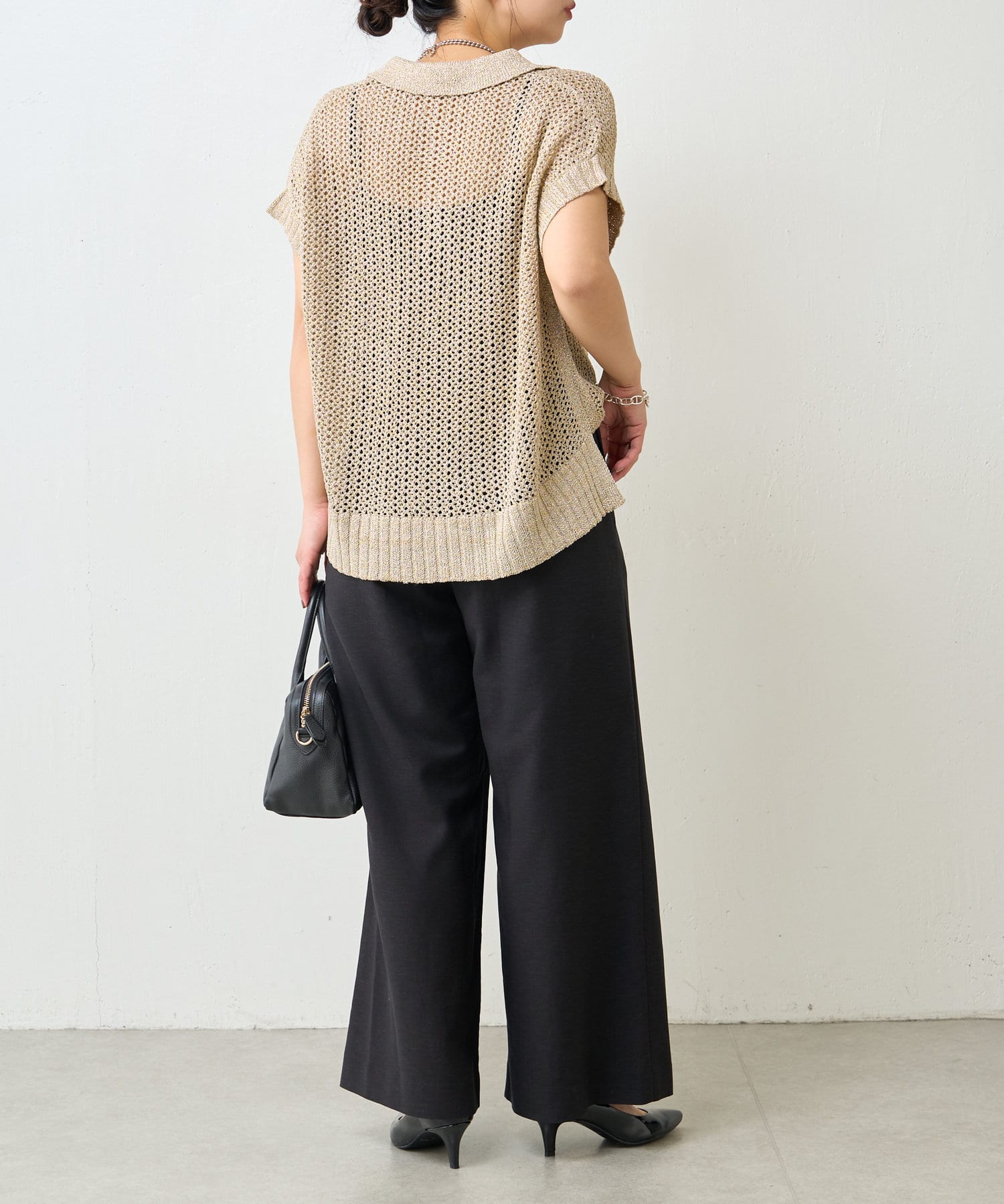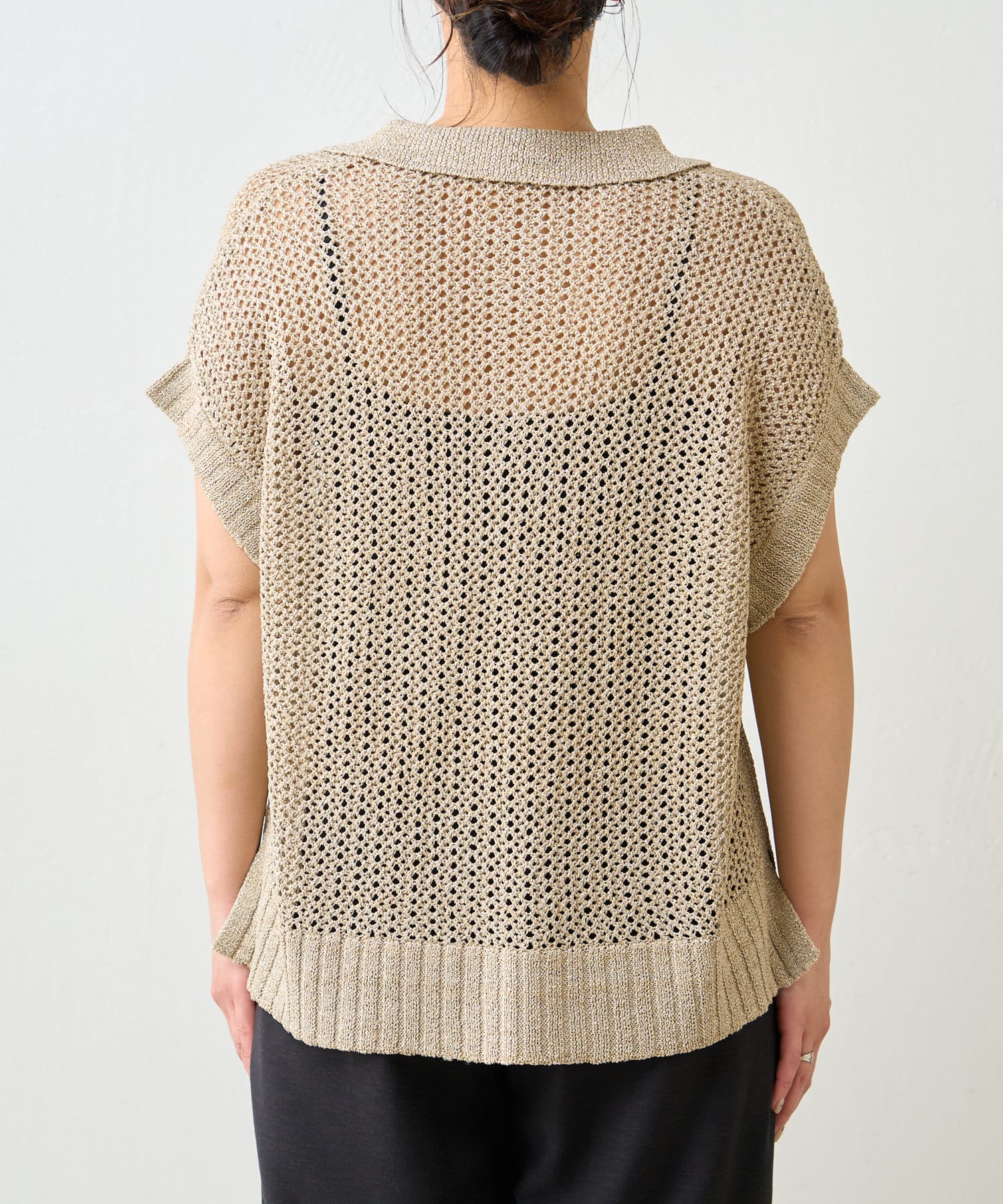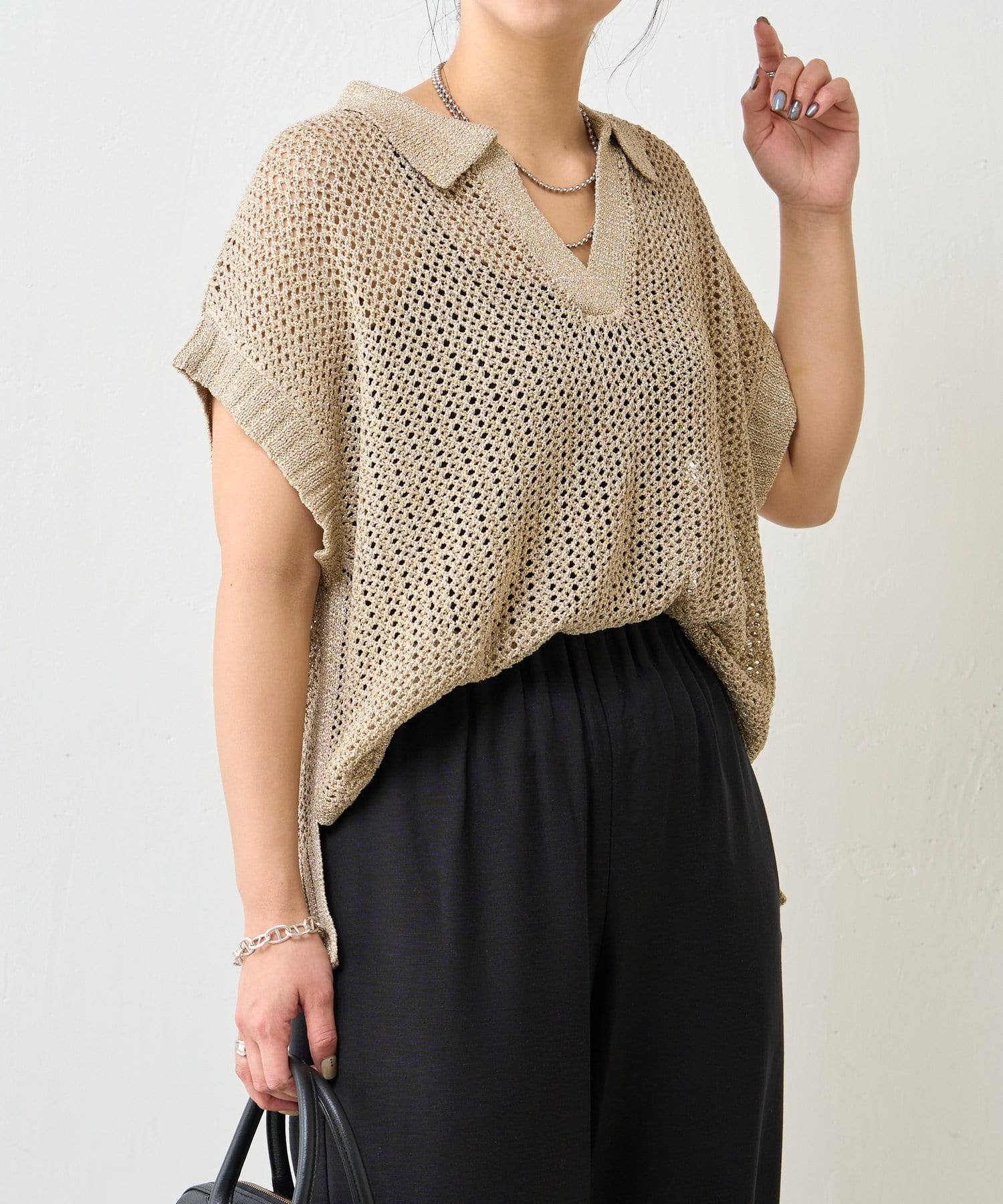 ・カジュアルになりがちなニットポロシャツですが、程よく光沢のあるメタリック糸と、すっきりとしたVネックのデザインが、大人の女性にふさわしい洗練された印象を与えてくれます。