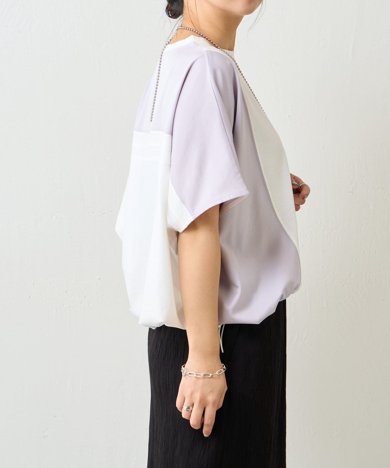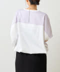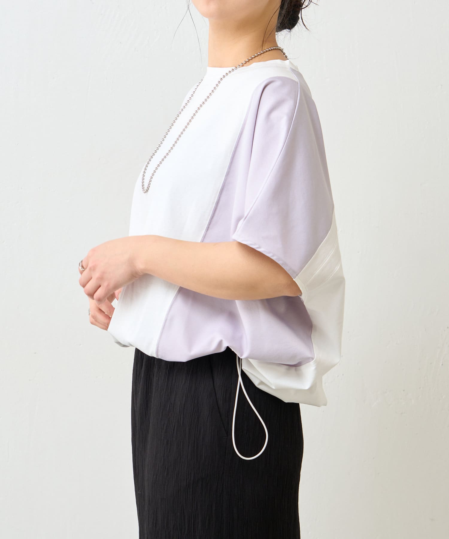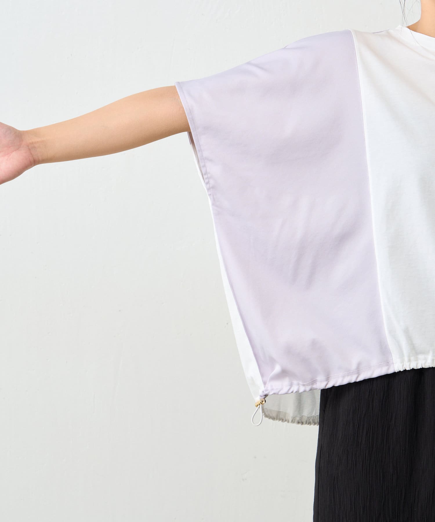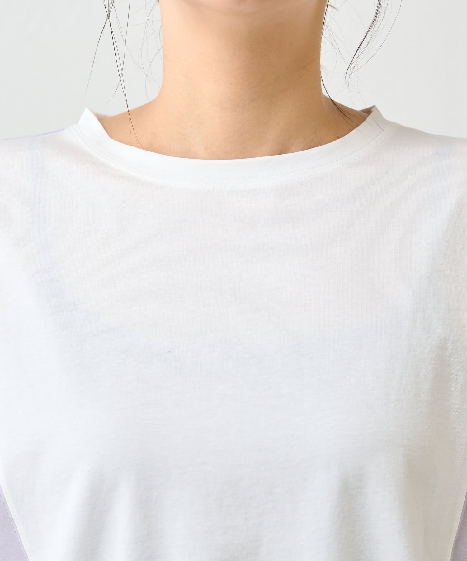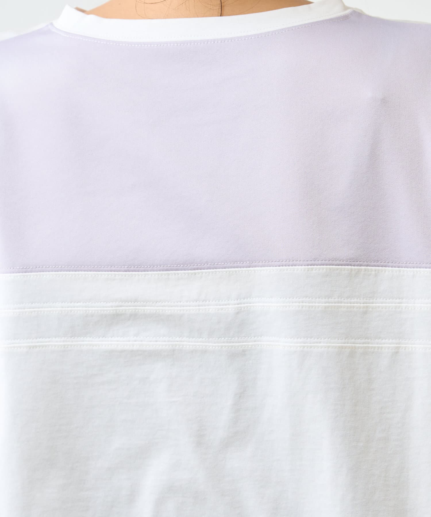 着心地の良さを追求した素材は、一日中快適に過ごせる軽やかさと、上品な光沢感を兼ね備えています。 シンプルなデザインながらも、袖のラベンダーカラーがさりげなく個性を主張し、着こなしに奥行きを与えてくれます。