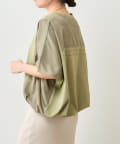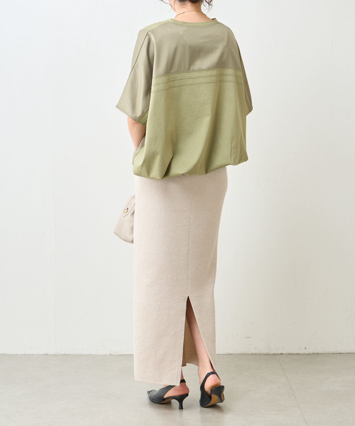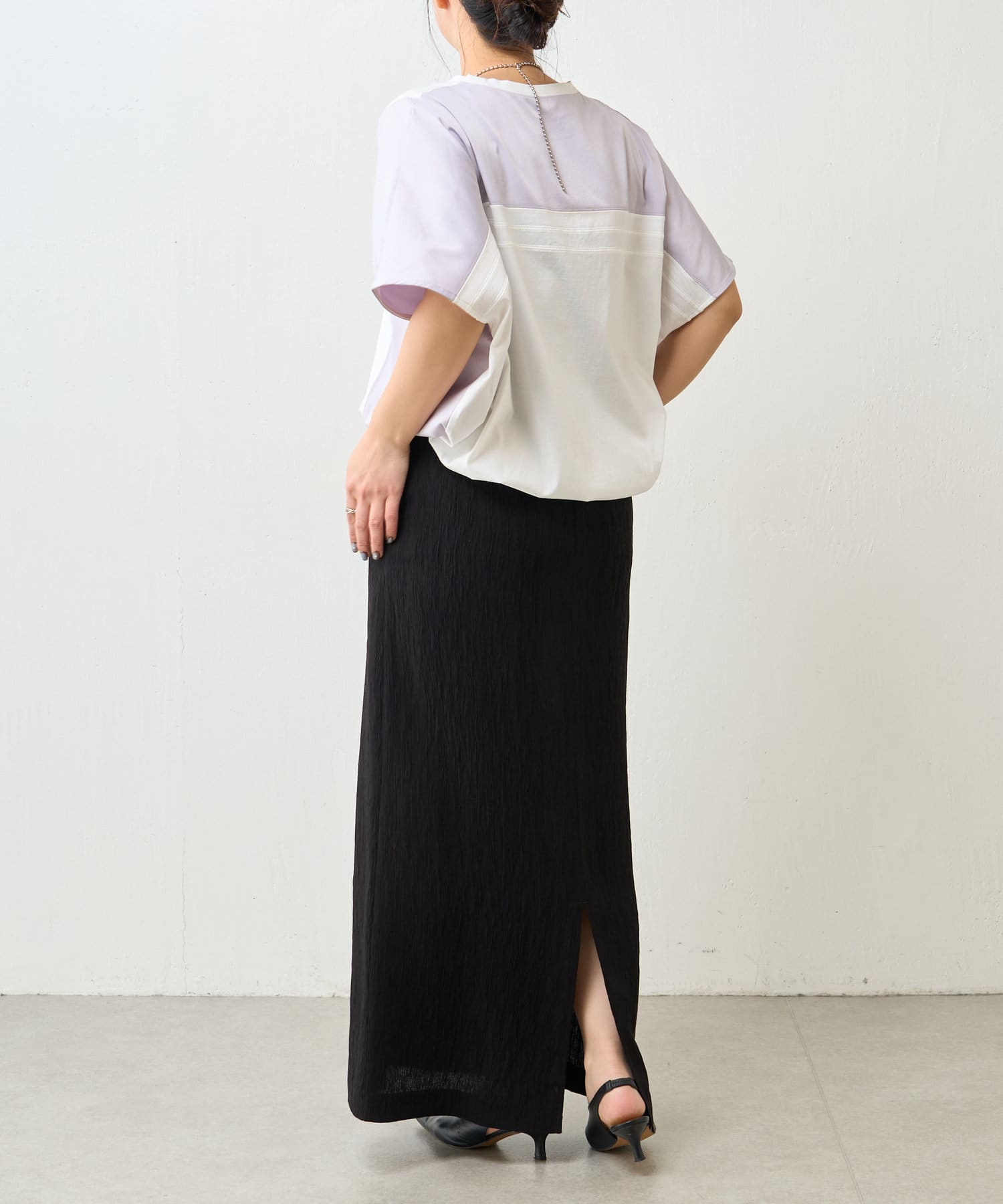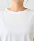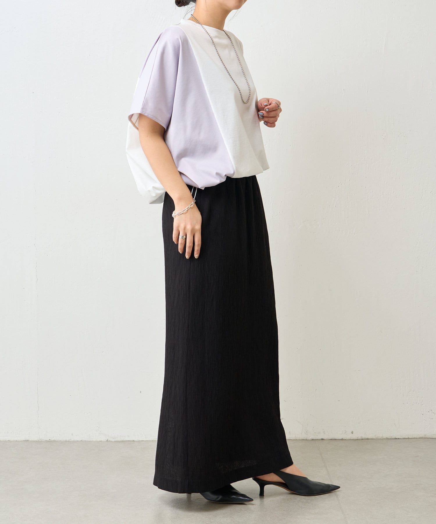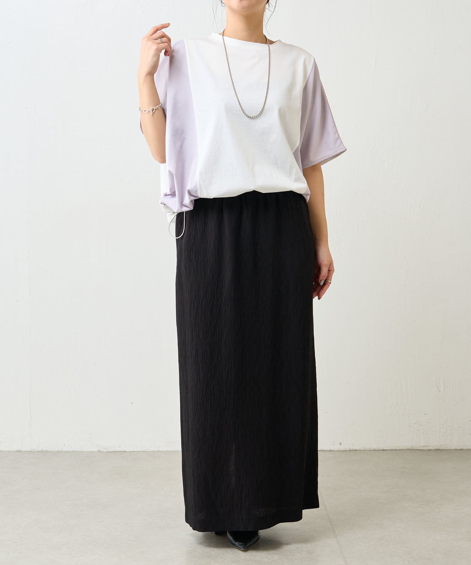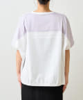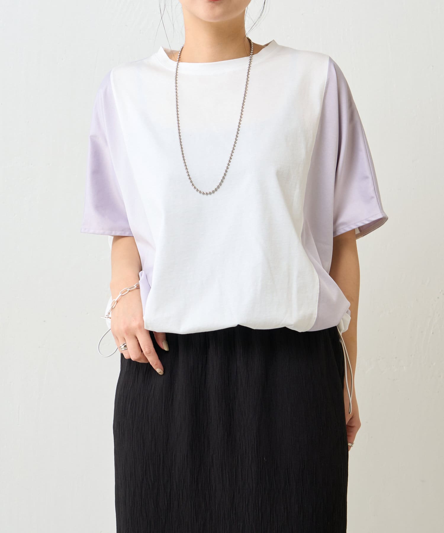 着心地の良さを追求した素材は、一日中快適に過ごせる軽やかさと、上品な光沢感を兼ね備えています。 シンプルなデザインながらも、袖のラベンダーカラーがさりげなく個性を主張し、着こなしに奥行きを与えてくれます。