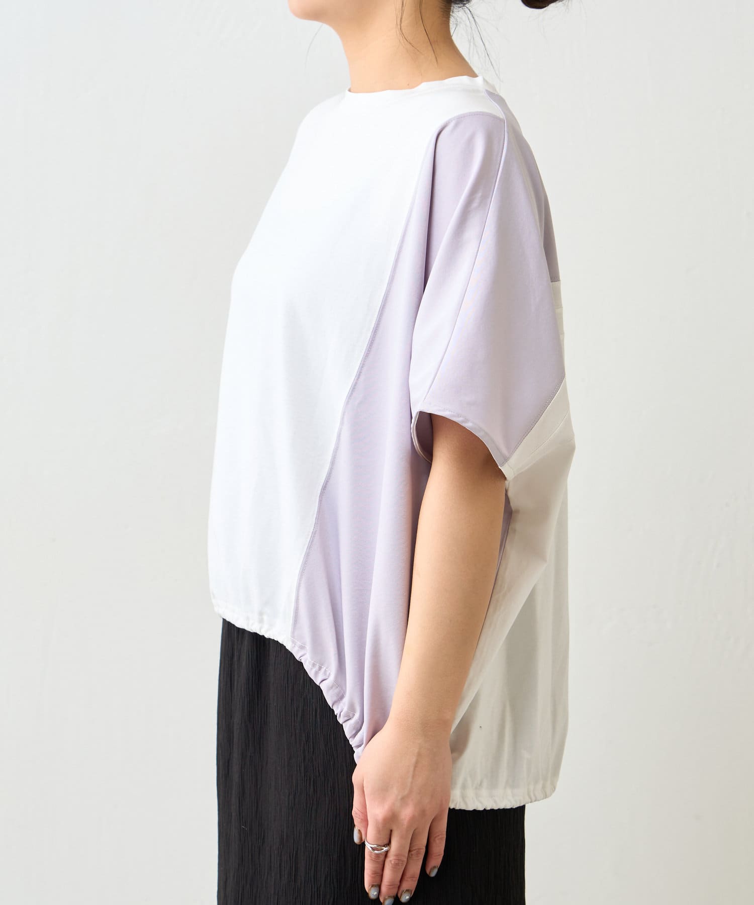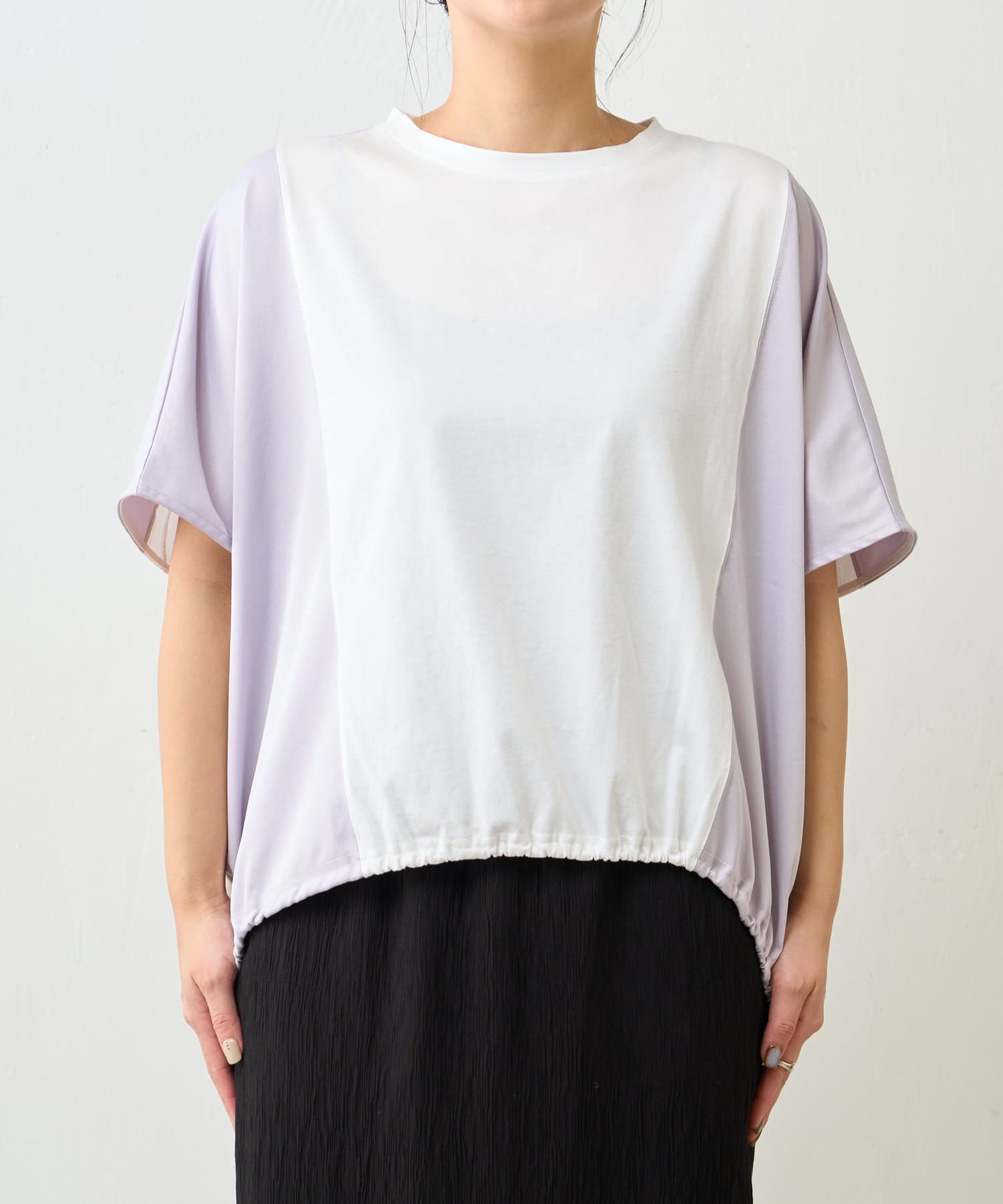 柔らかな肌触りと上品なデザインが魅力のバイカラートップスをご紹介いたします。 オフホワイトとラベンダーの絶妙なカラーコンビネーションが、大人の女性にふさわしい洗練された雰囲気を演出します。